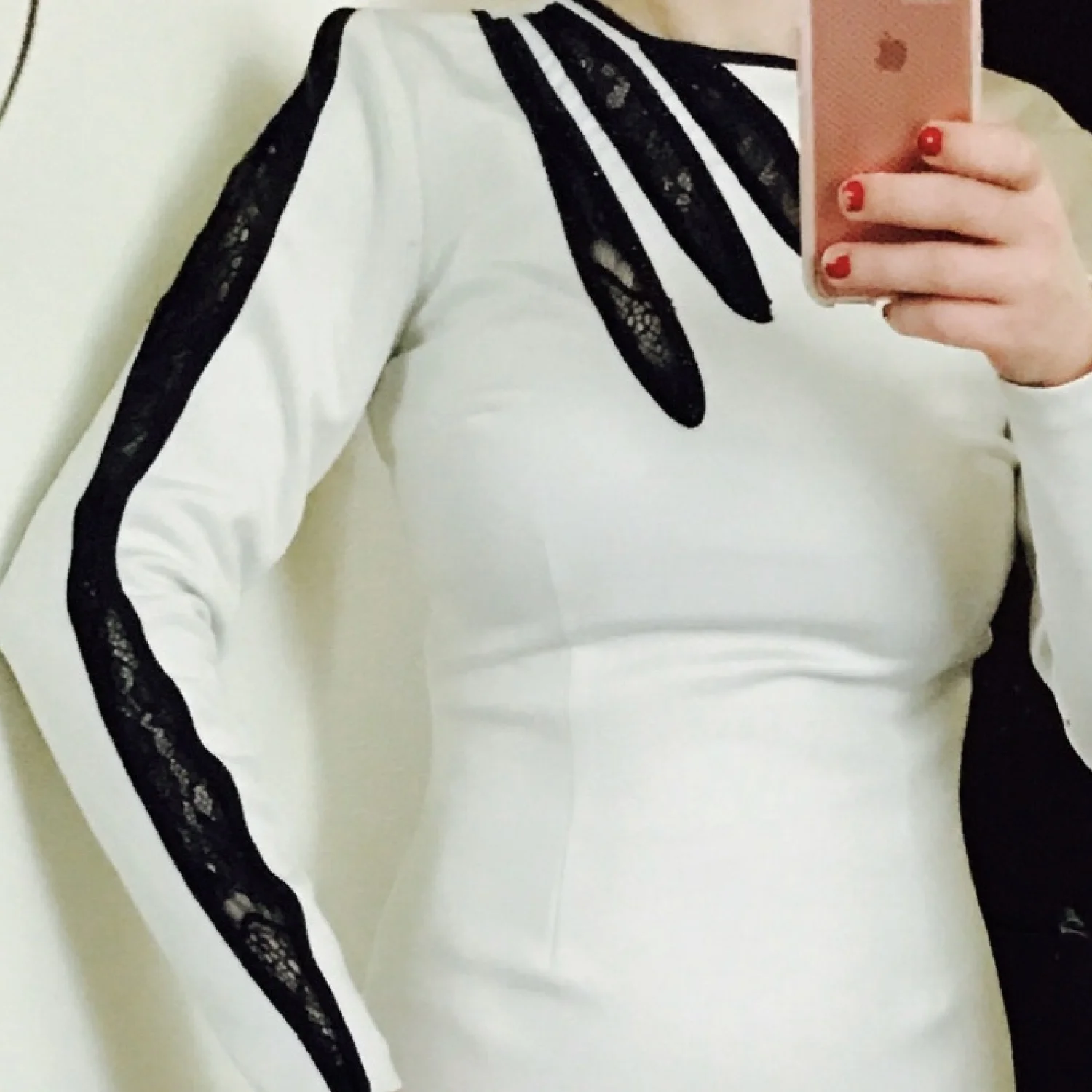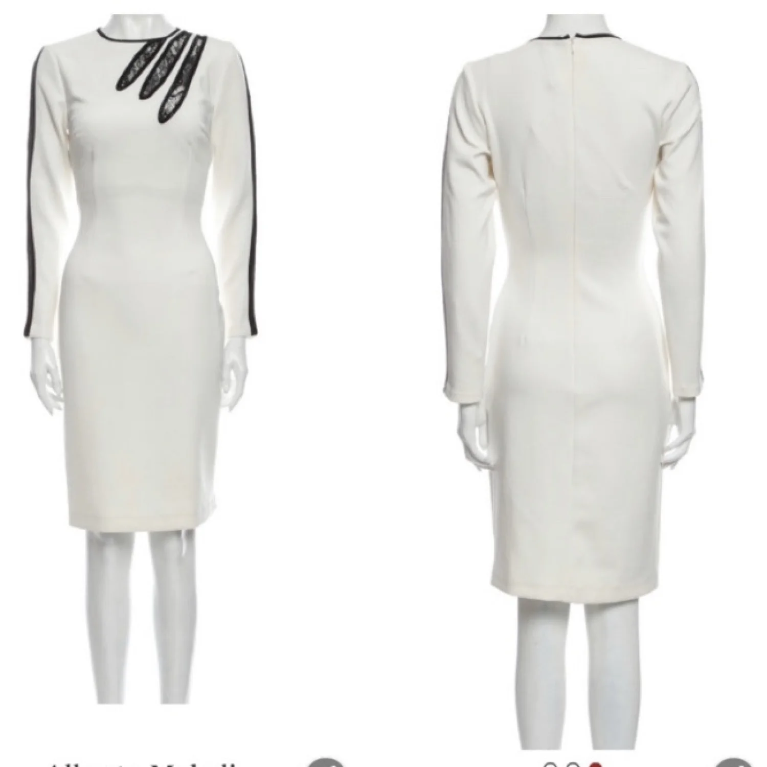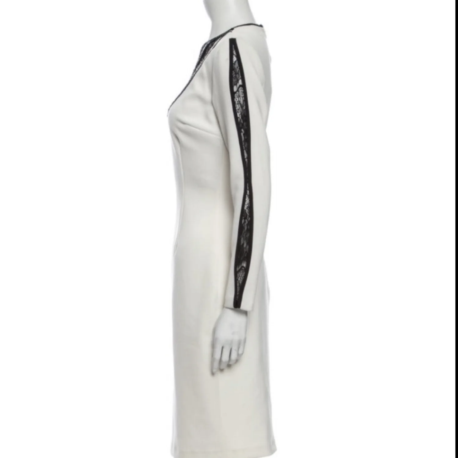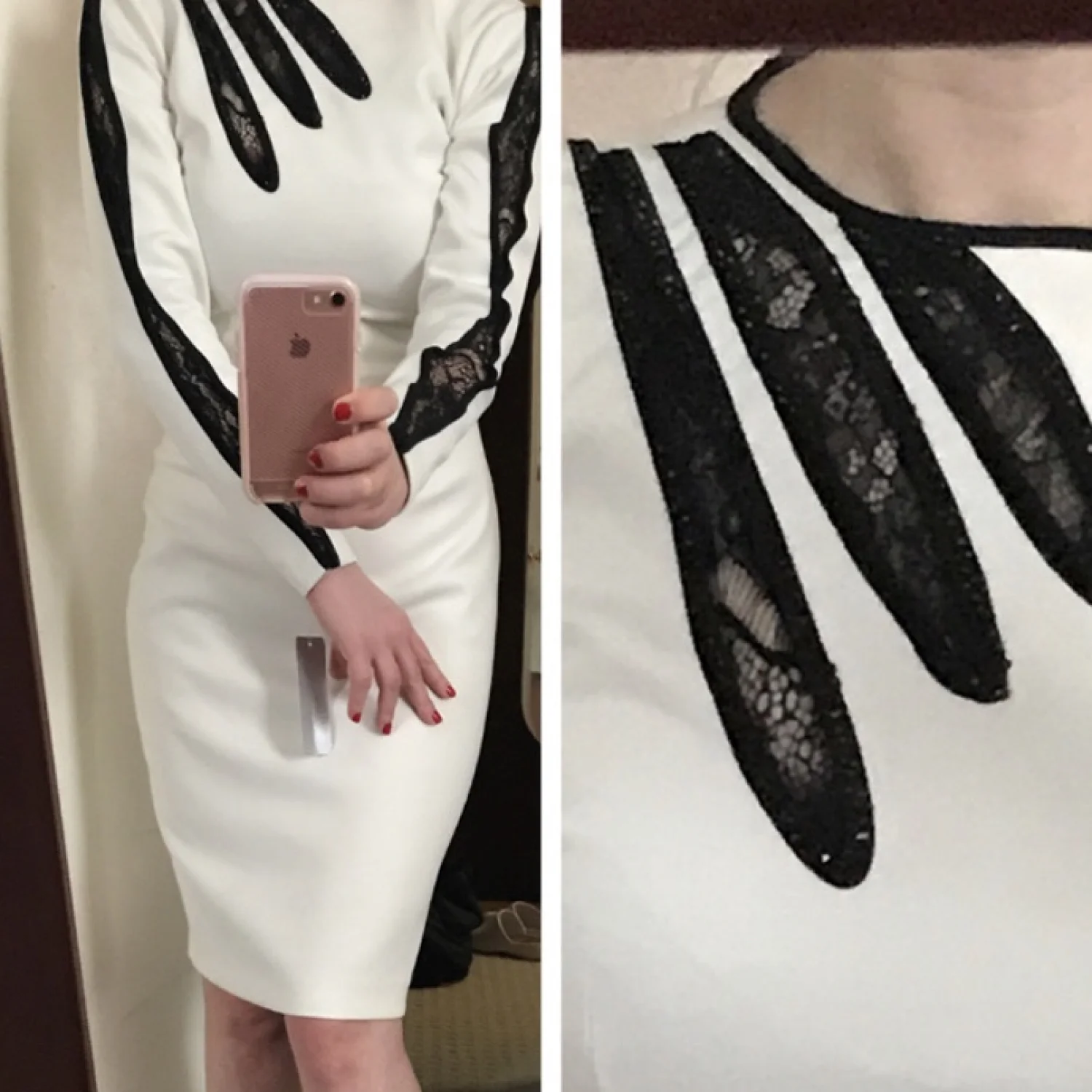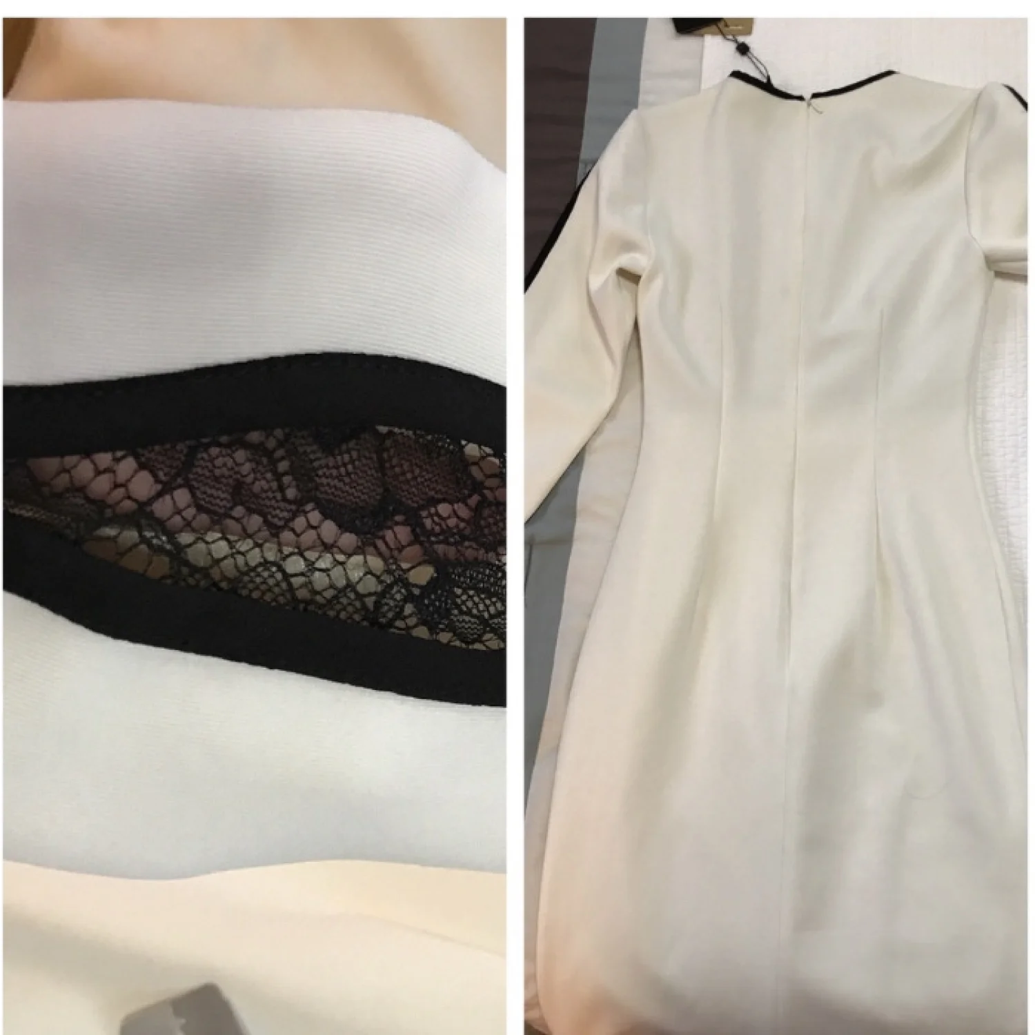 This is a beautiful crafted one of a kind sexy black and white dress with lace. The material is 95% polyester 5% spandex. It hugs your body perfectly as its a thick stretchy material. Brand new with tags. Never worn. Length is 40 1/2", waist 26" but can stretch to 30". Shoulder 14 1/2".