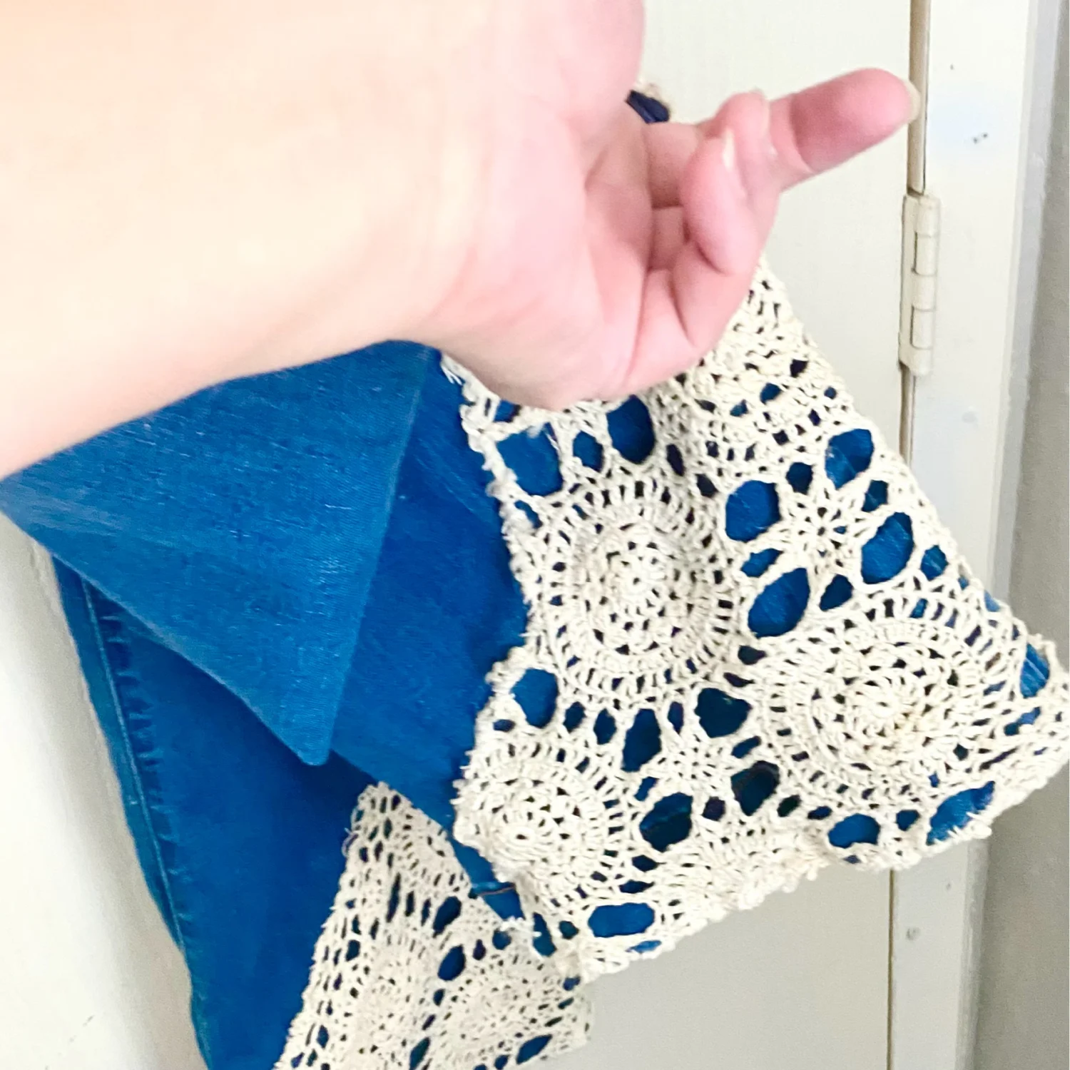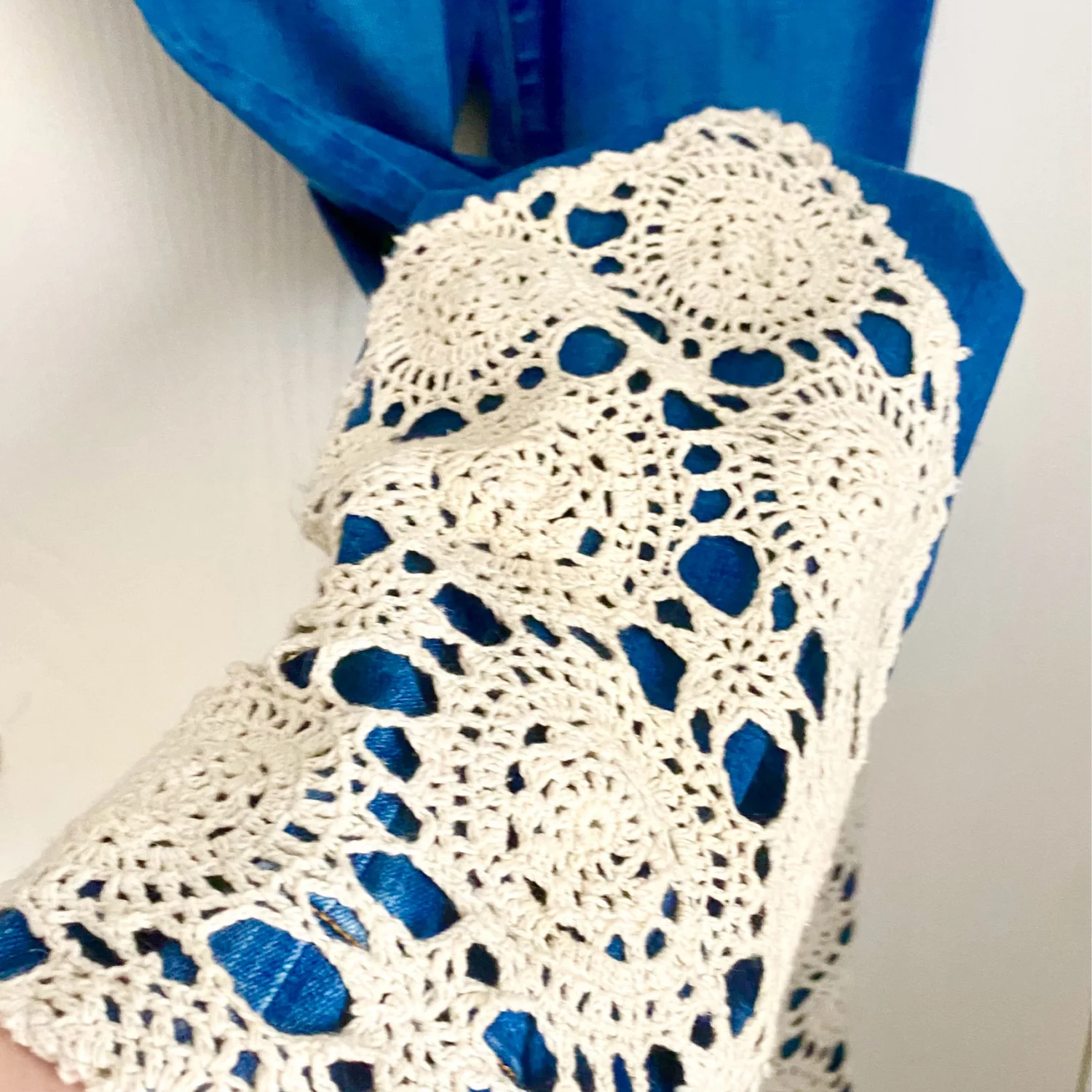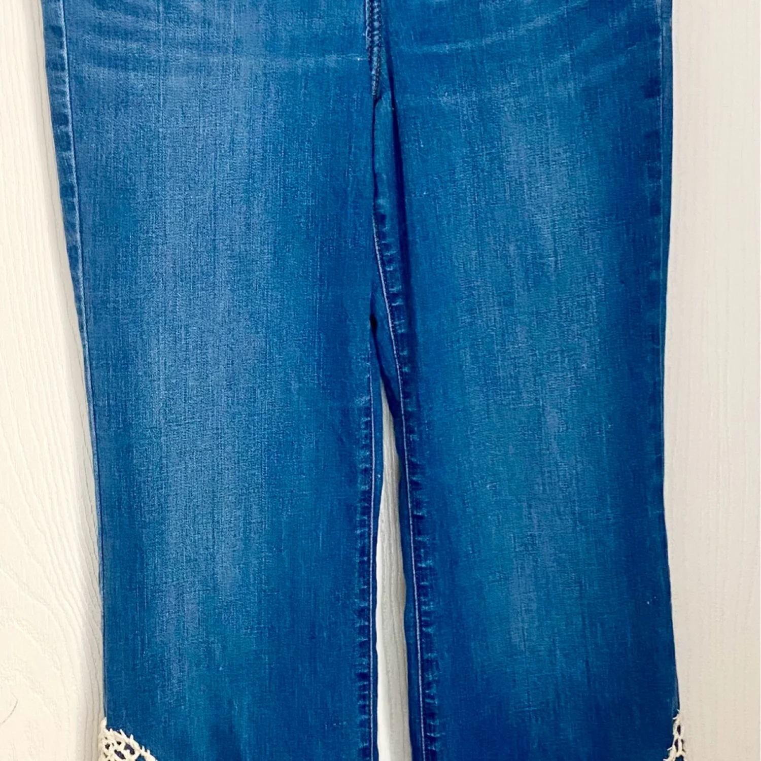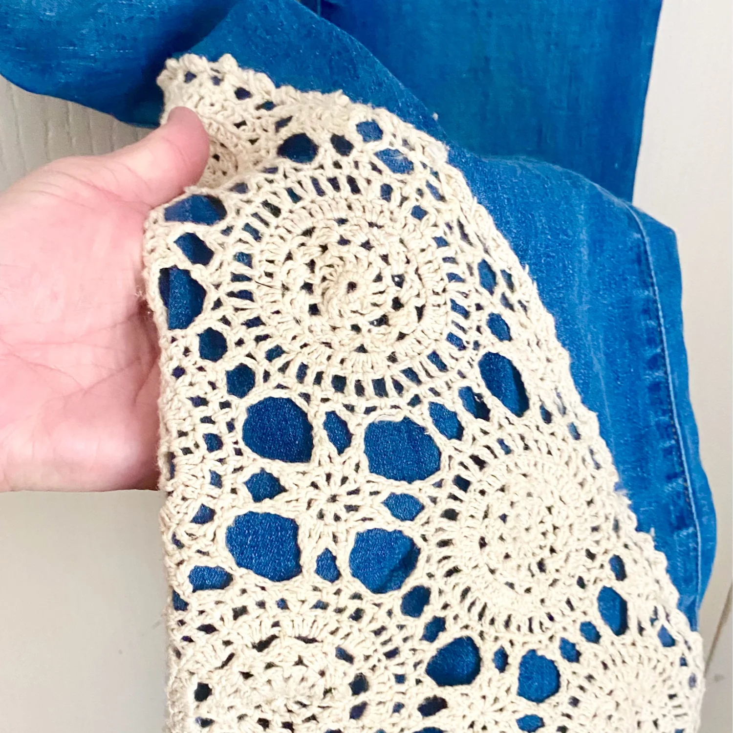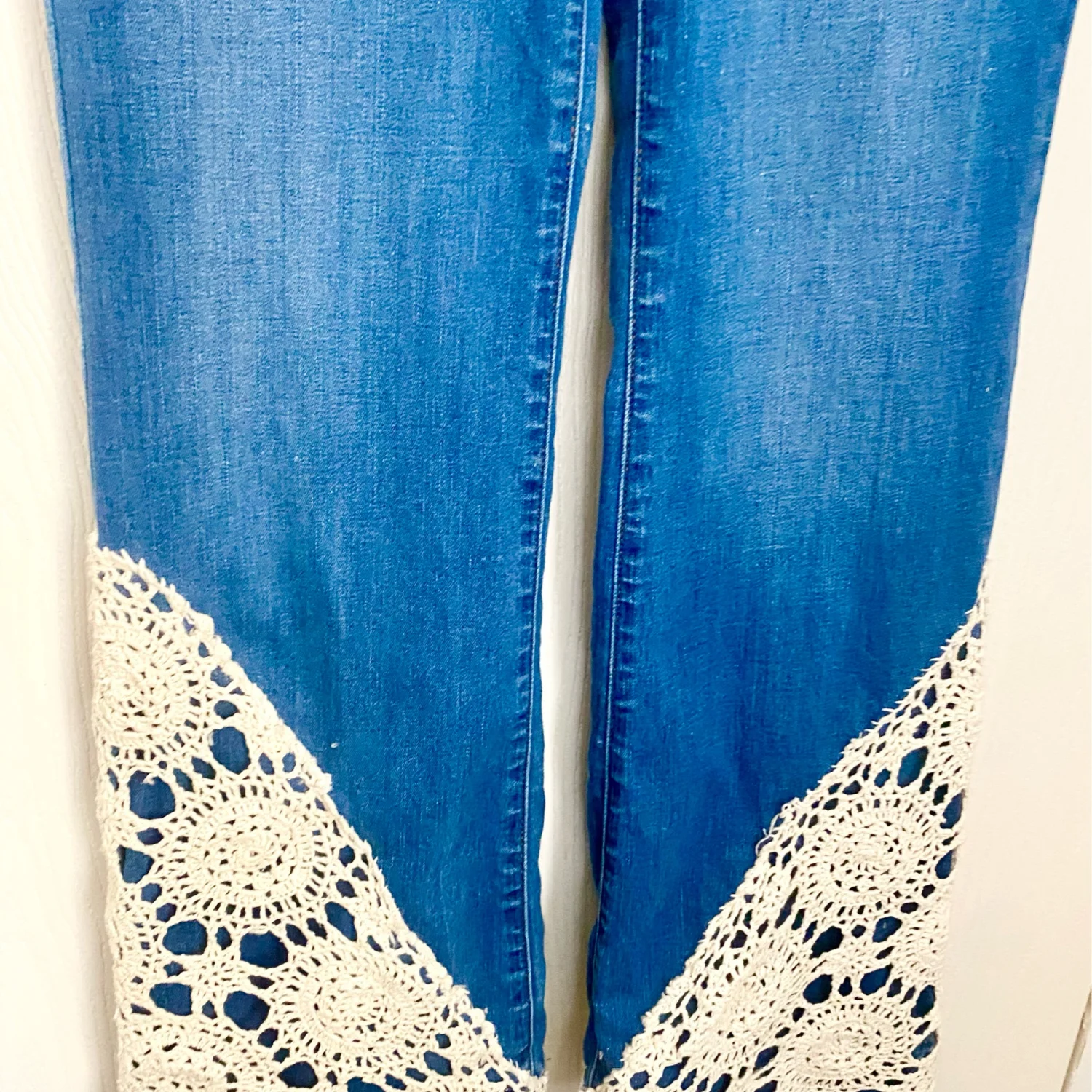 High rise button up jeans with added in crocheted doily on the flare legs. These are a pair of Lauren Conrad jeans, 77% cotton blend. 4 copper button up fly. So super cute! Giving that 70's boho hippy vibe. Measurements: Women's size 6. Waist: 30" un-stretched, 31" TO 32" stretched. Inseam: 31" This item has been hand washed in natural detergent, line dried and iron. They are ready to wear. Your purchase of these jeans keep amazing clothes from the landfills. Up-cycled and hand sewn.