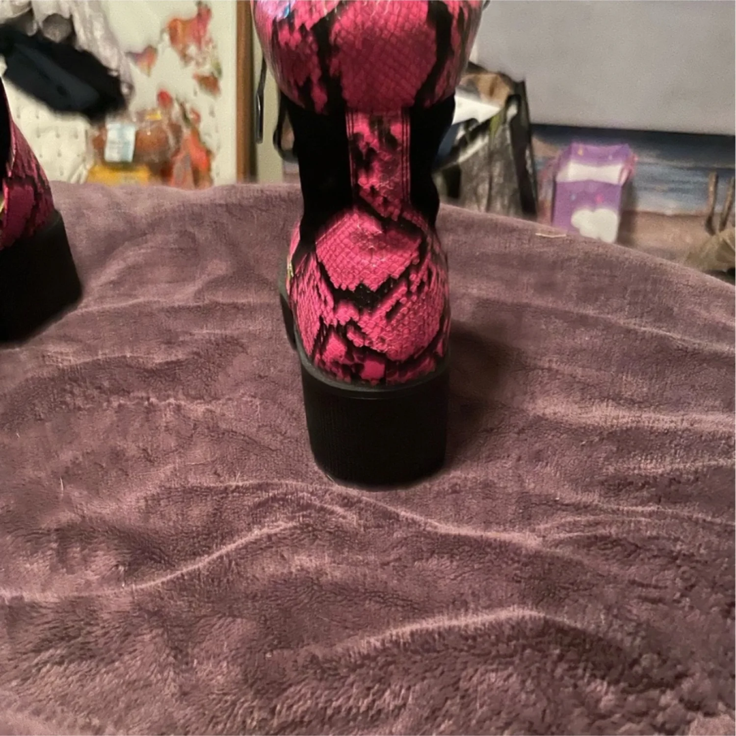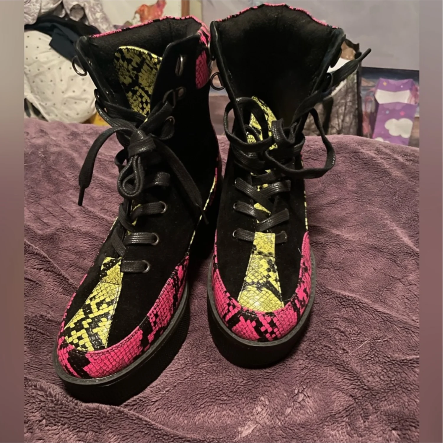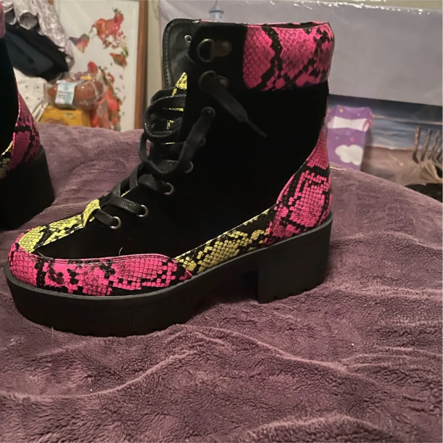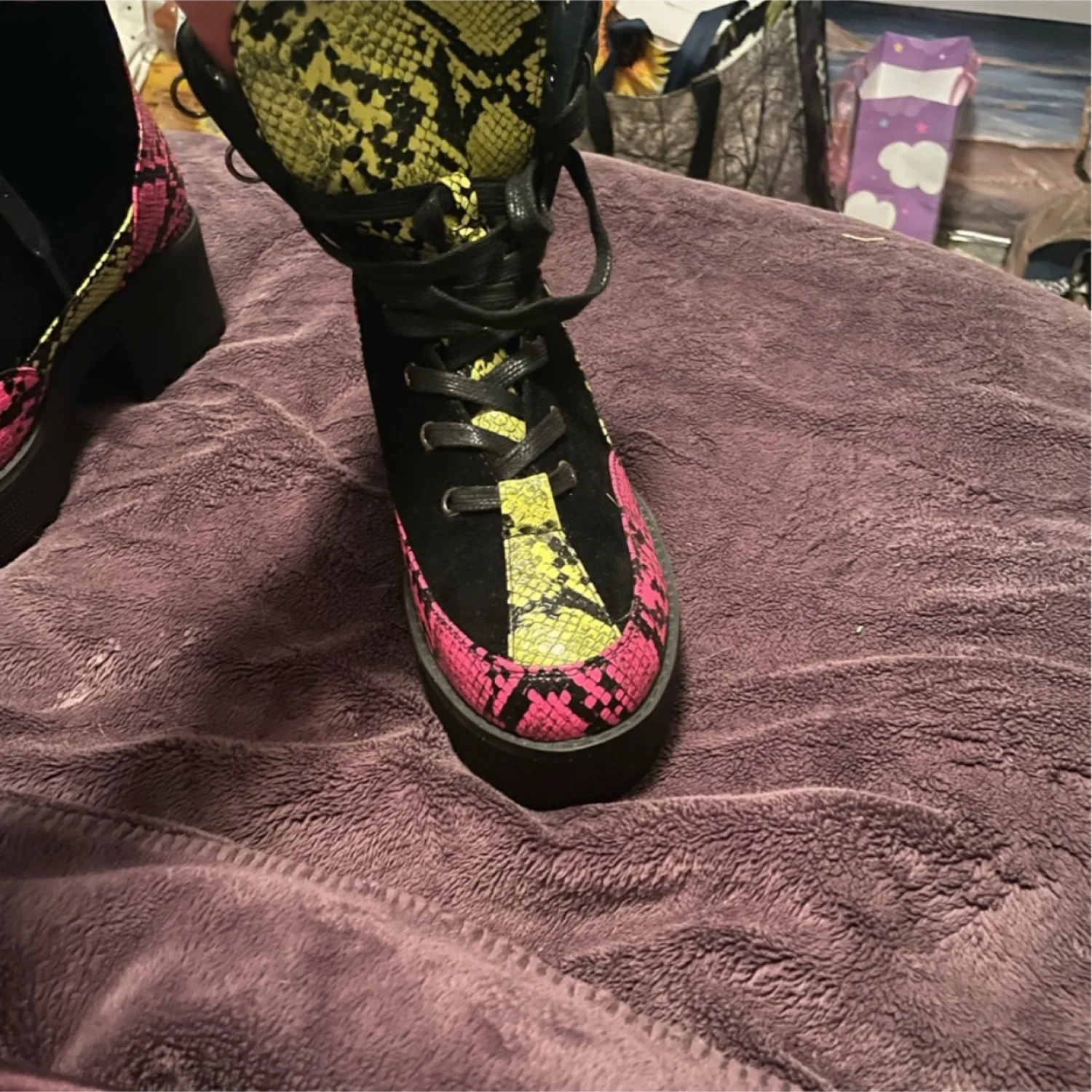 Pink and yellow and black snake skin looking boots
