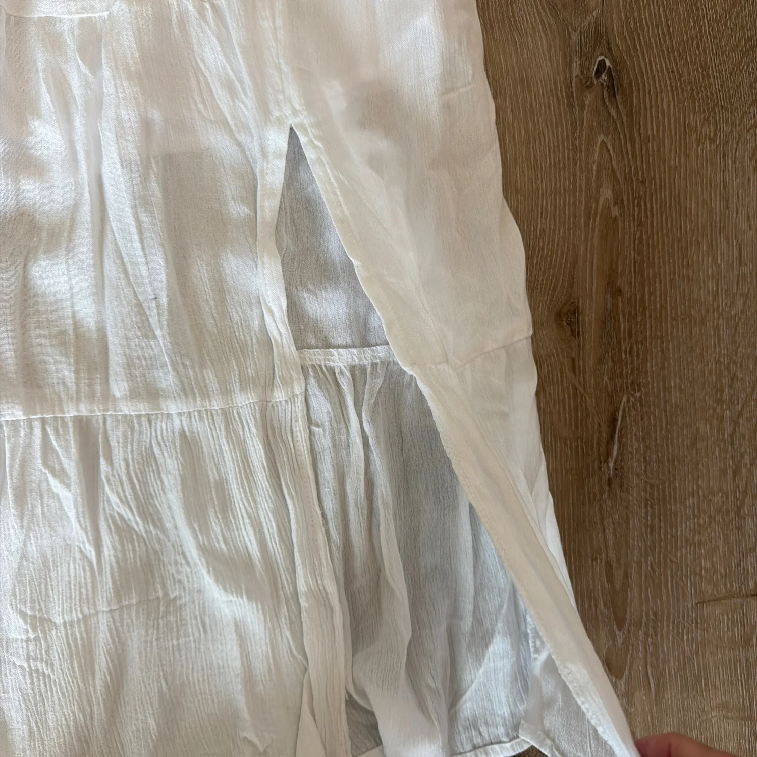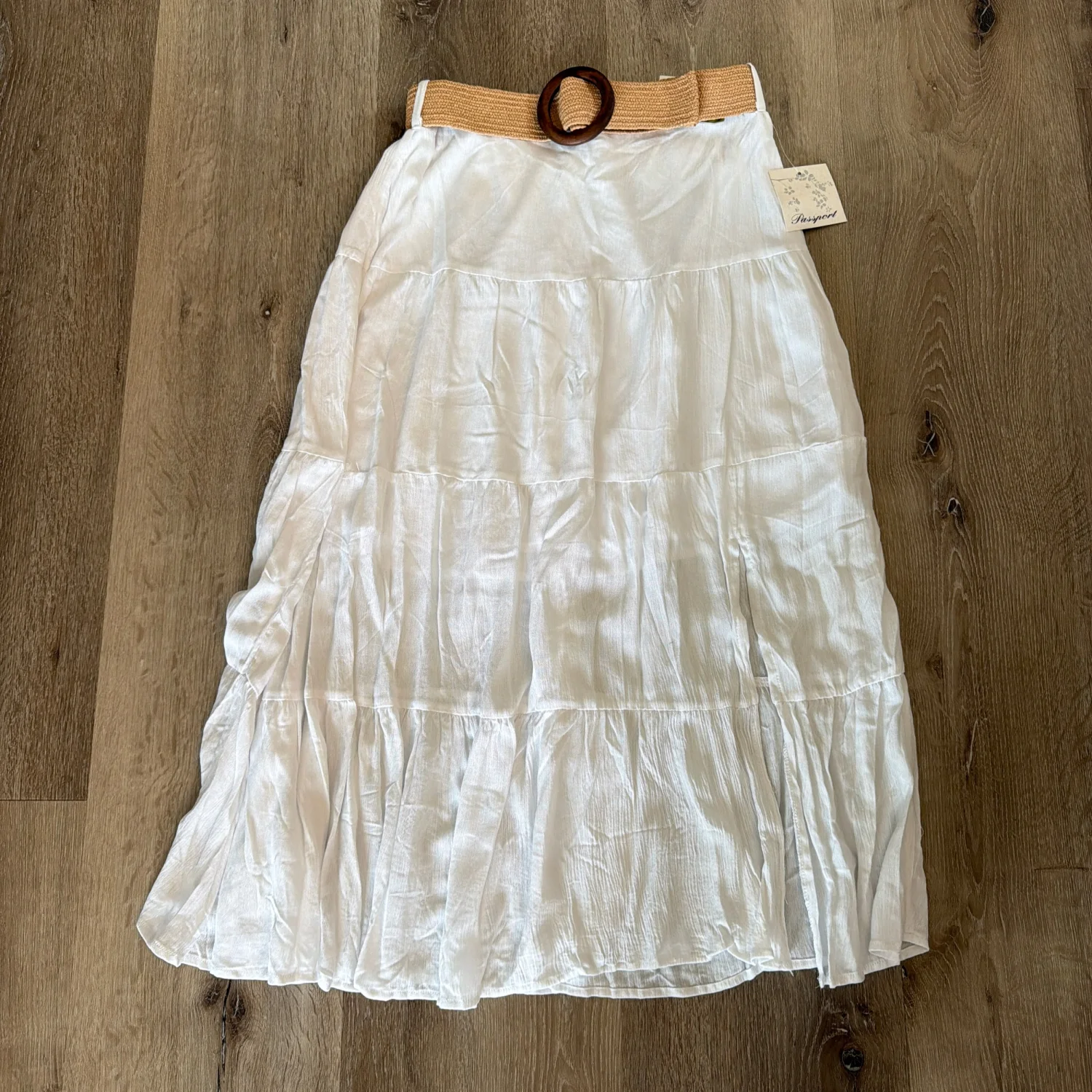 White thin flowy skirt with slit on left side, with belt, elastic waist in back