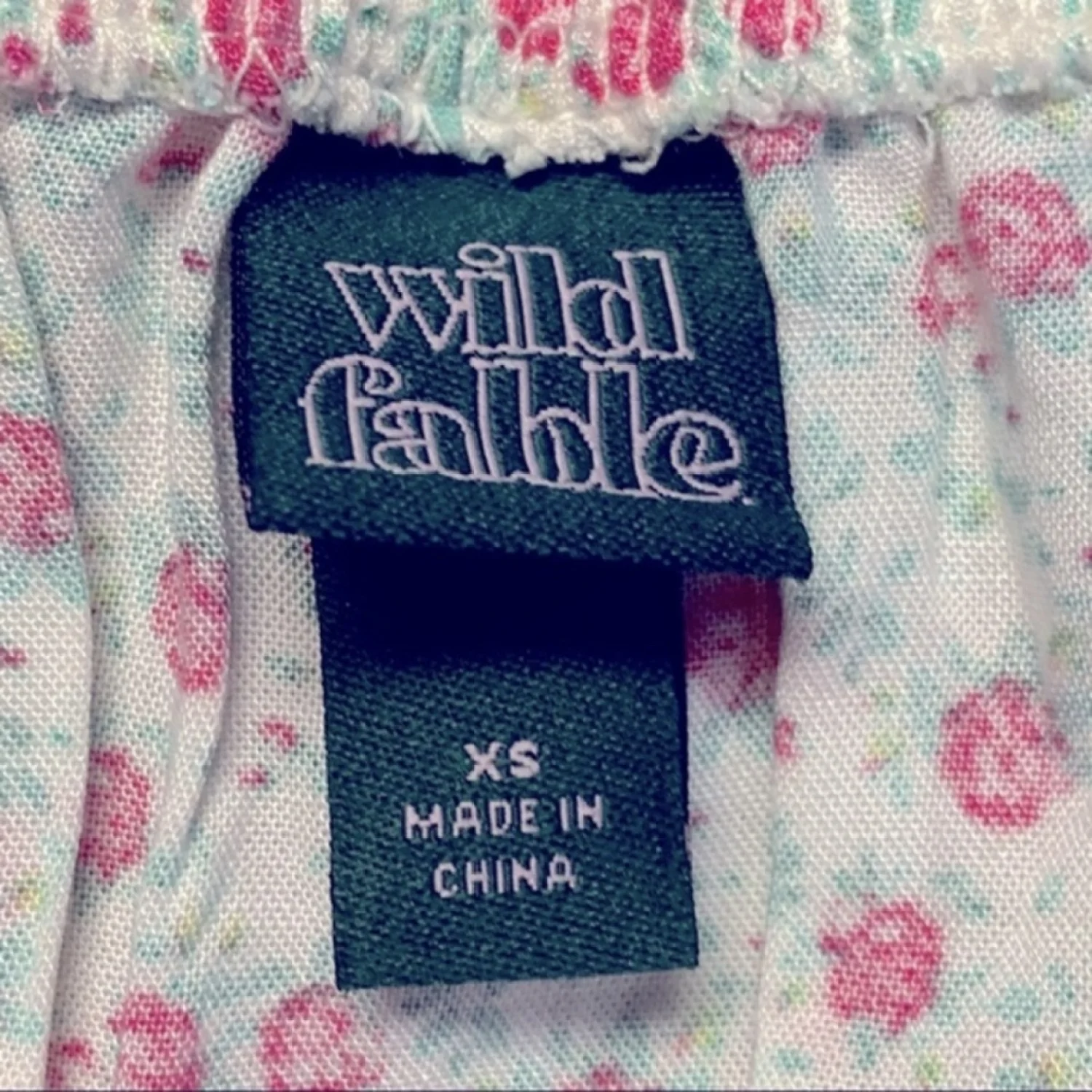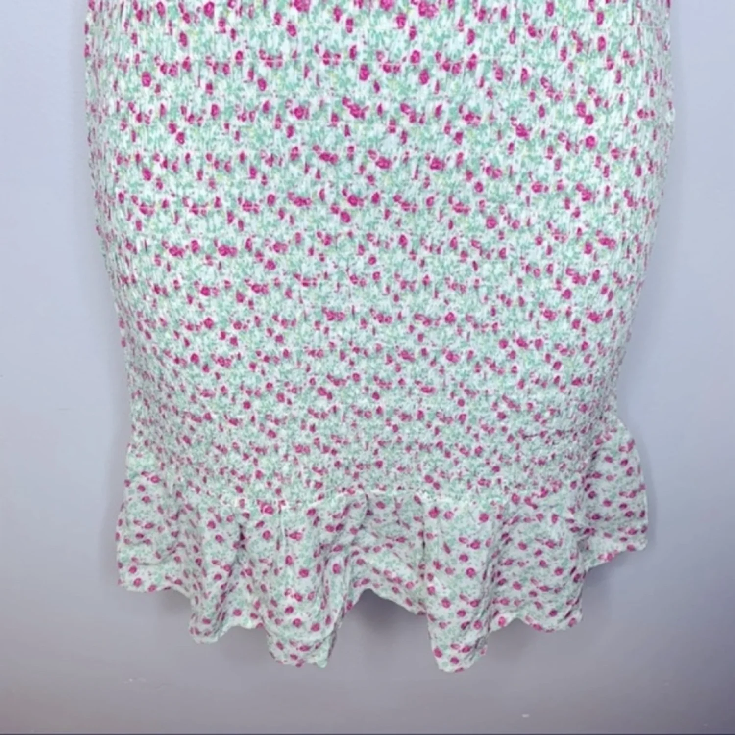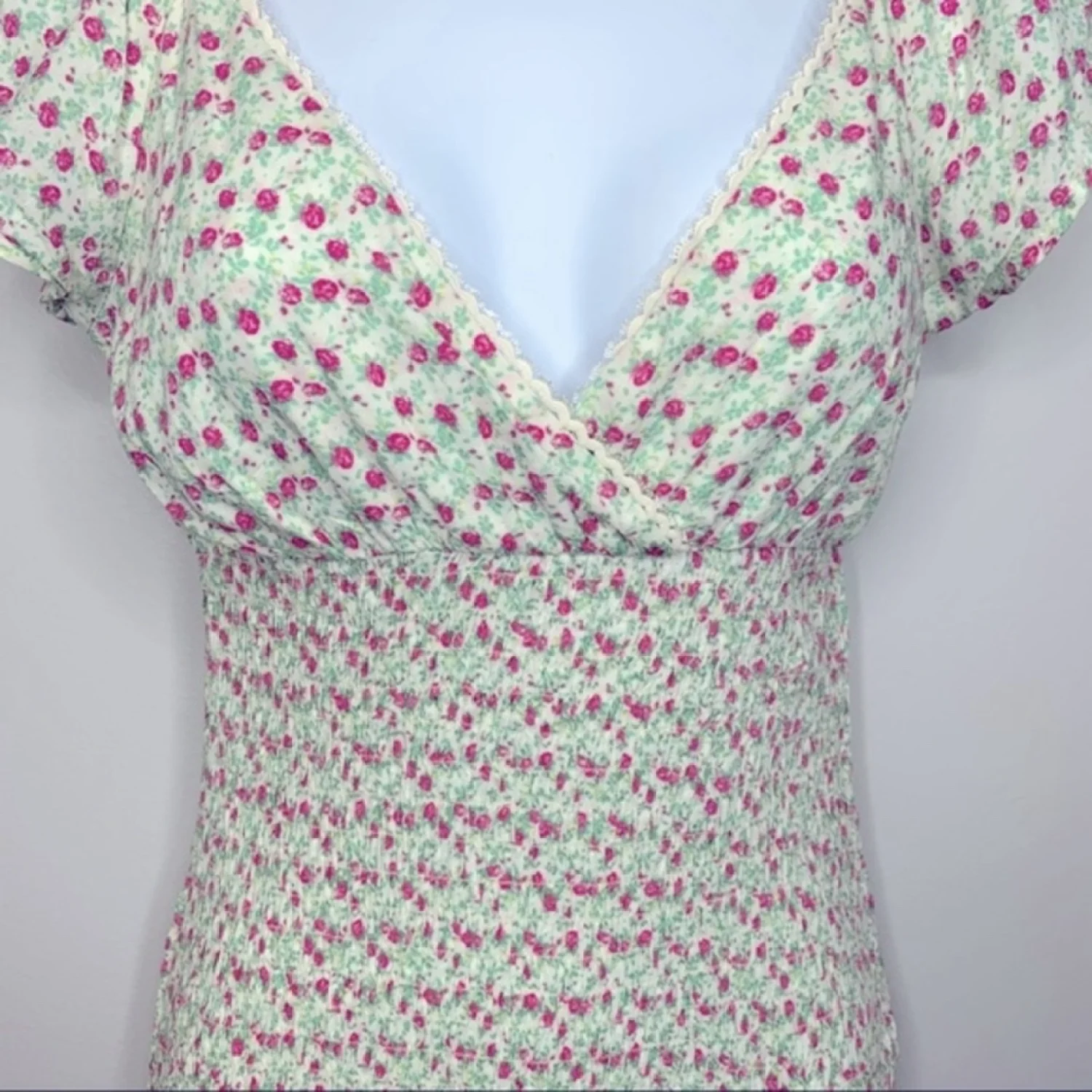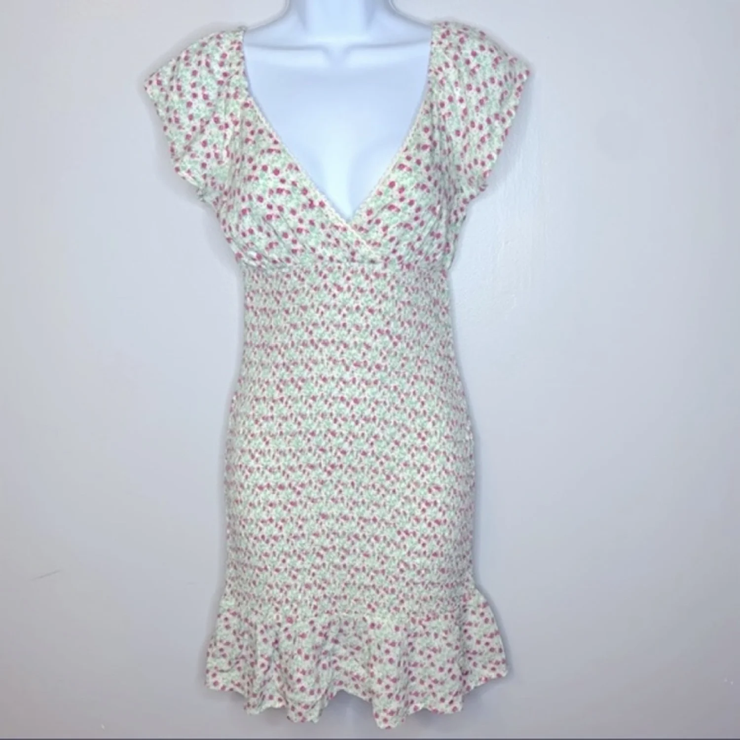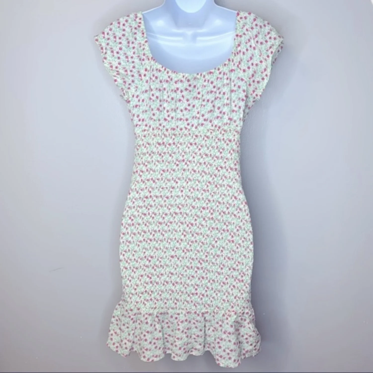 Wild Fable Floral Short Sleeve Smocked Dress. Cream colored dress with dainty pink and green flowers. Smocked bodice. Ruffle hem. V- neckline in surprise design. Shirt sleeves fashioned with a subtle flutter. Body- 100% rayon Elastic- 68% polyester/32% spandex Approximate measurements laid flat: Underarm to underarm- 18 inches Length- 35 inches From a smoke and cat free home.