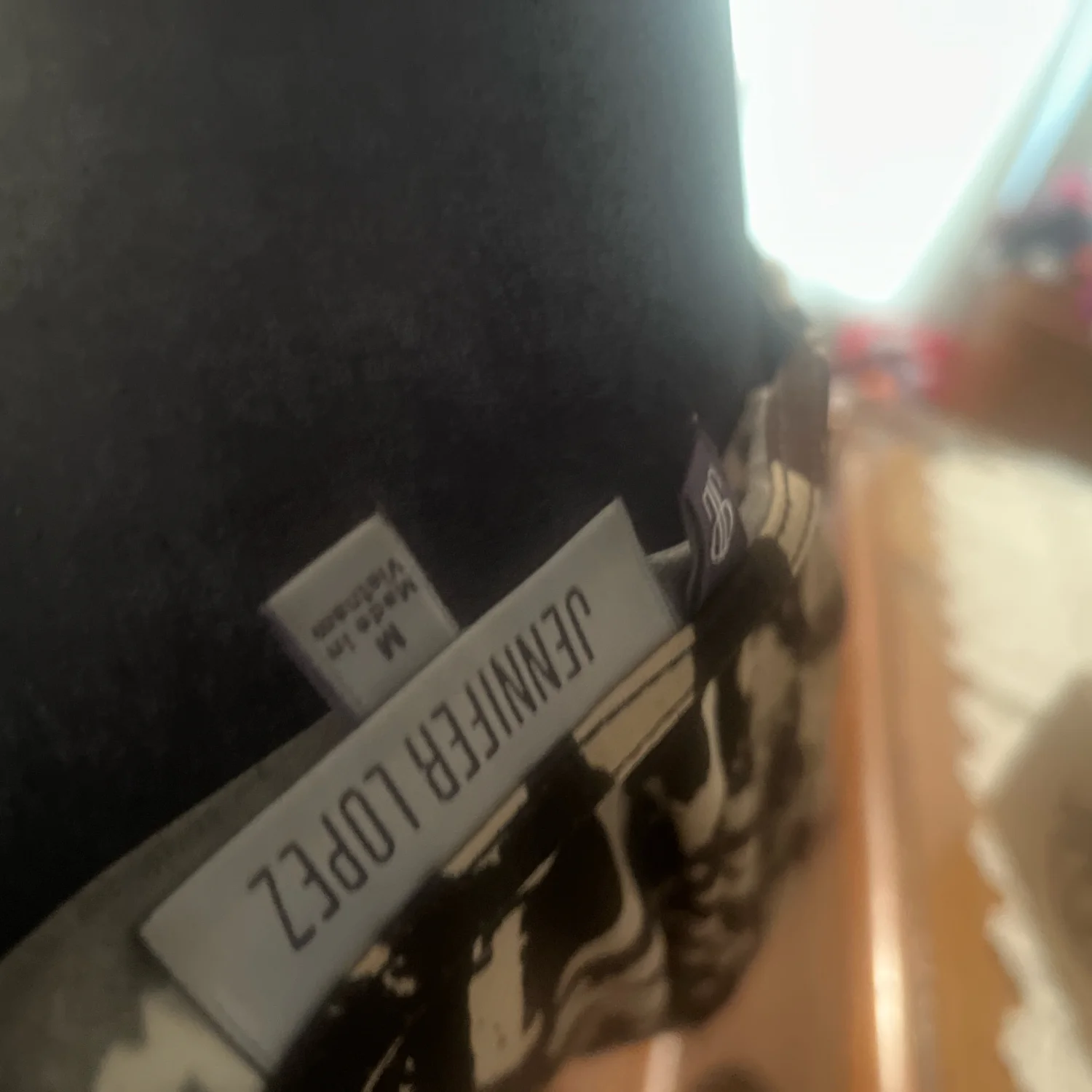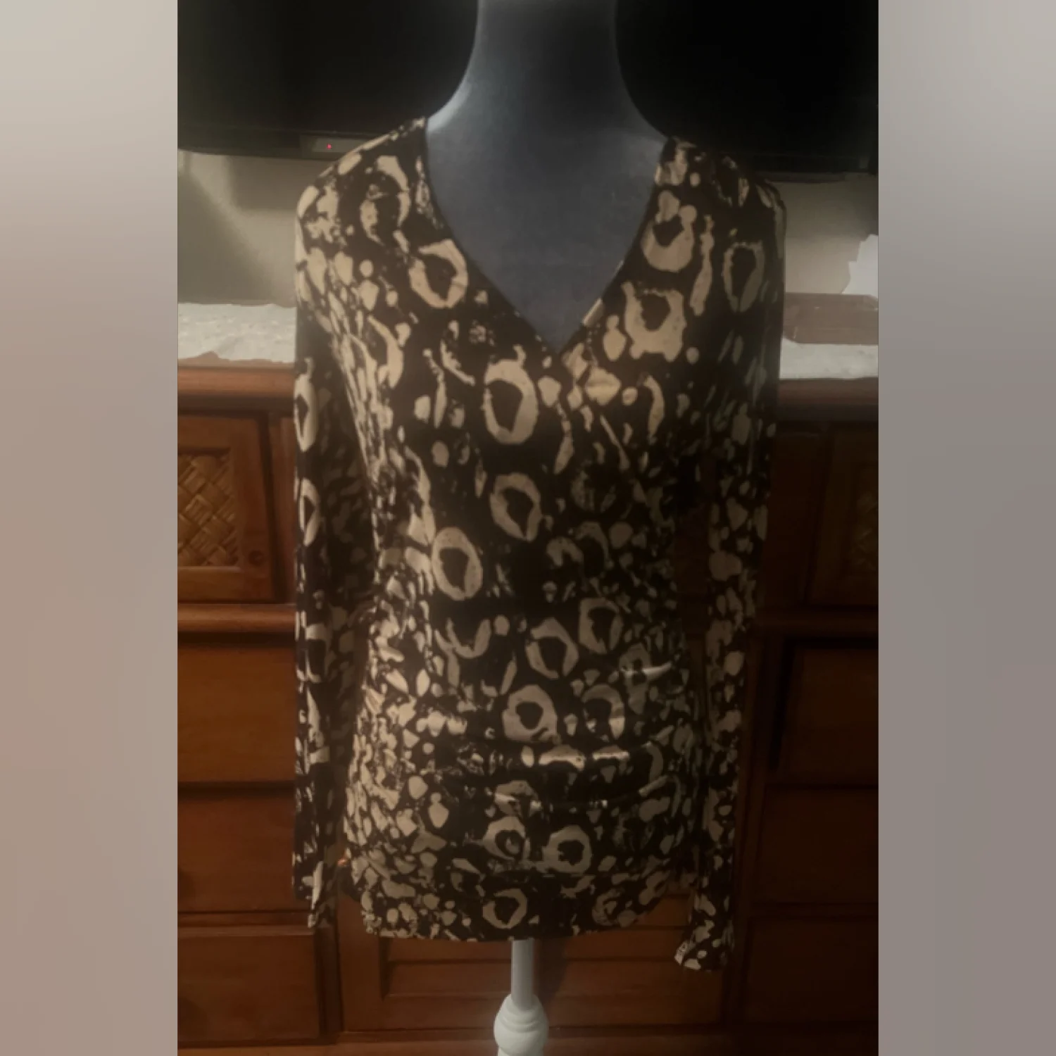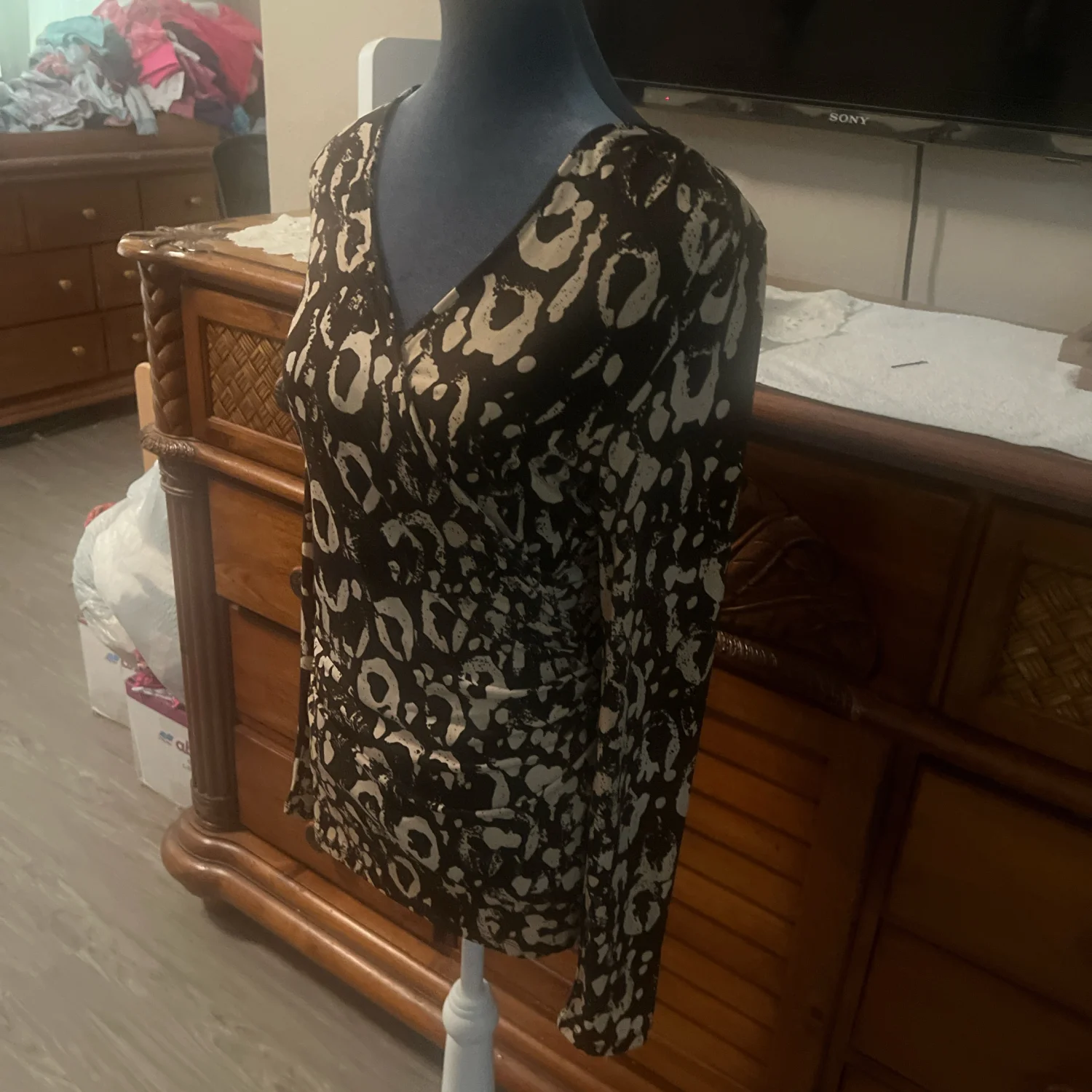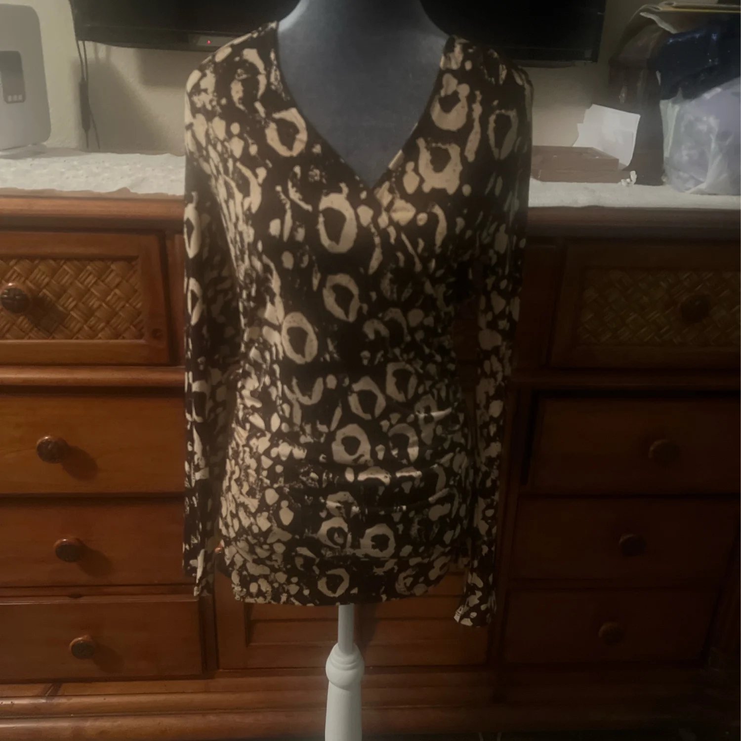 The top is a leopard print with a V-neck. The leopard print is black and white. The tag is visible on the left side of the V-neck.