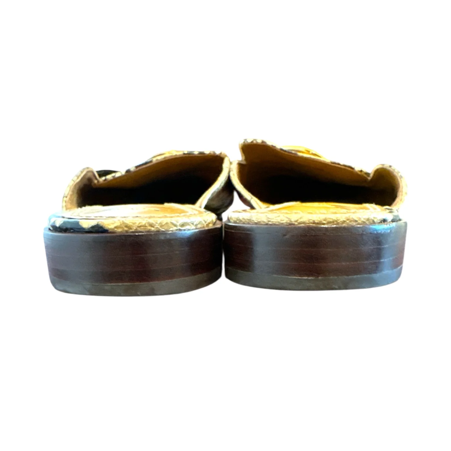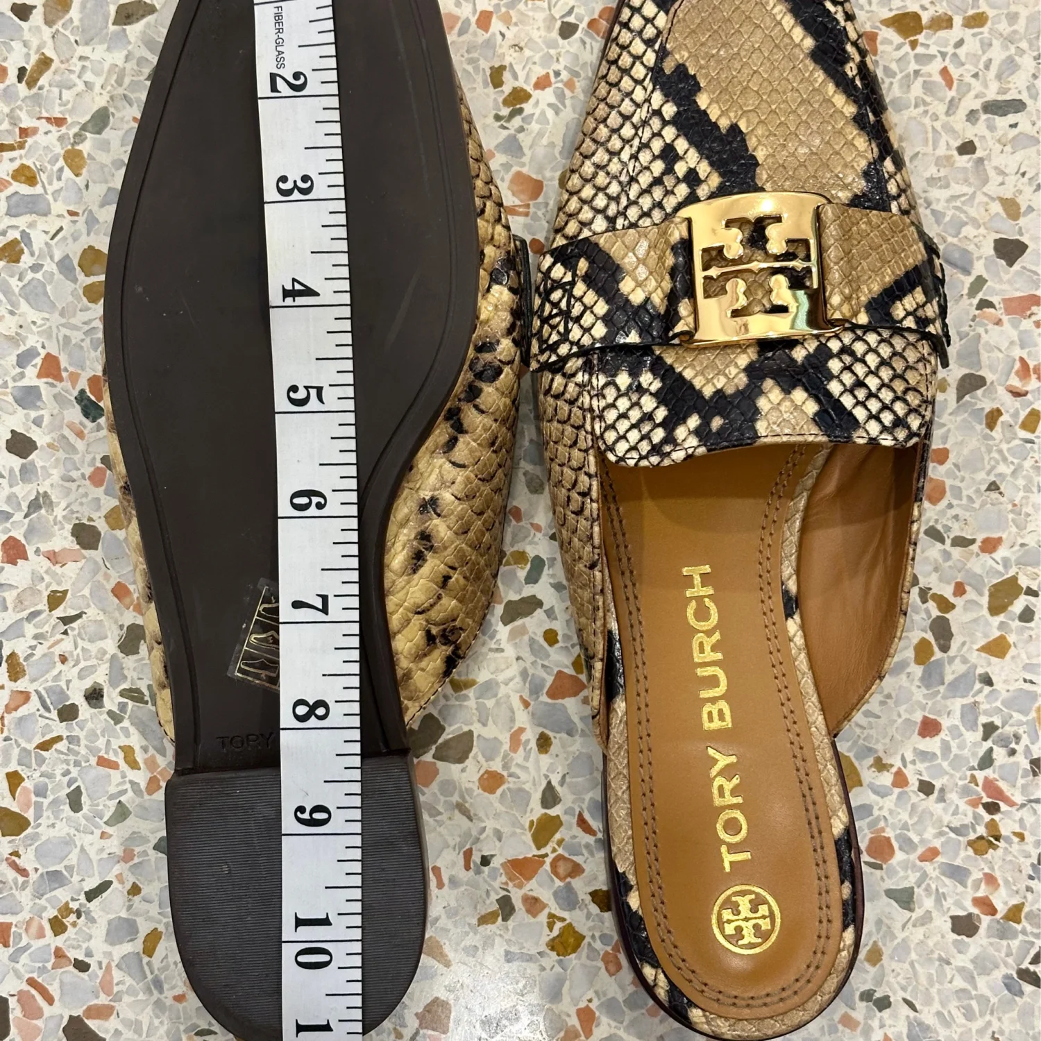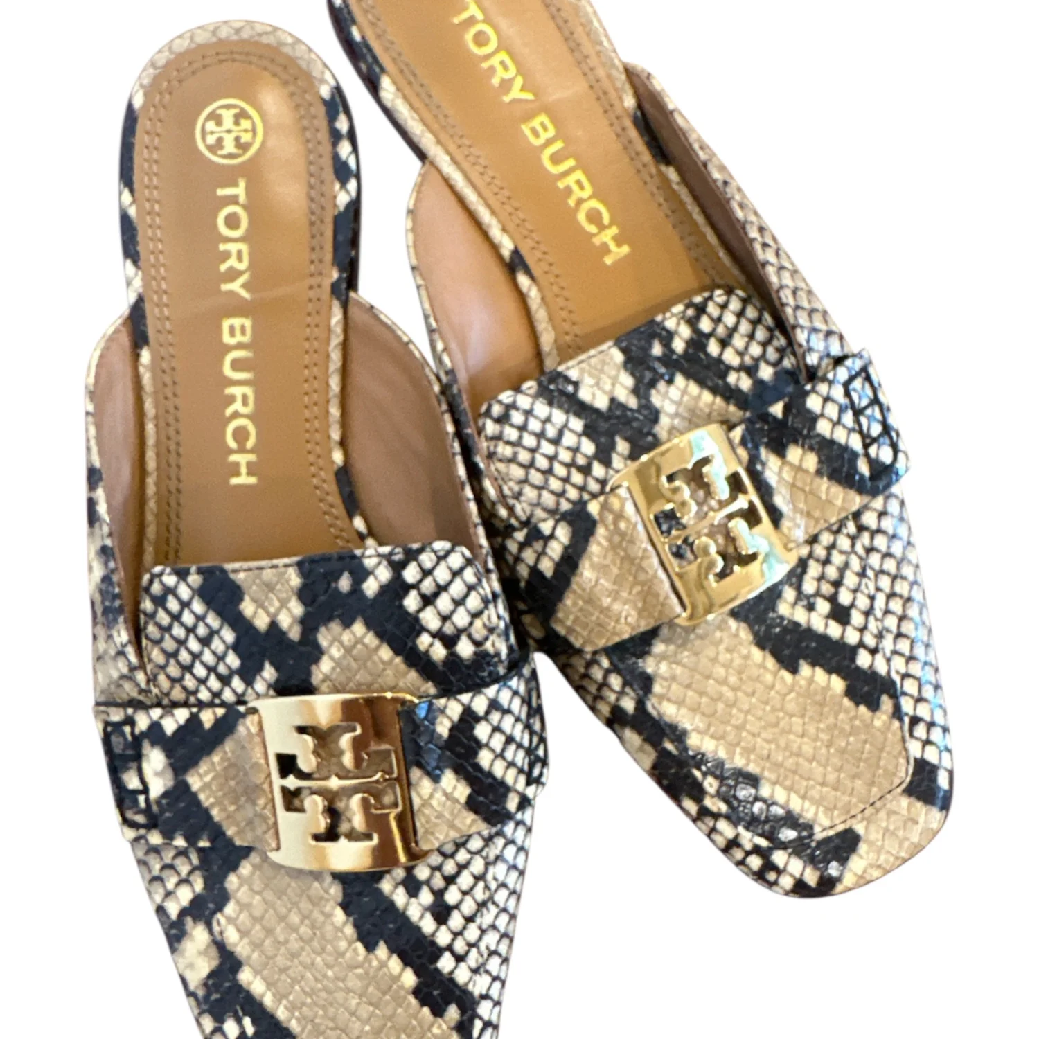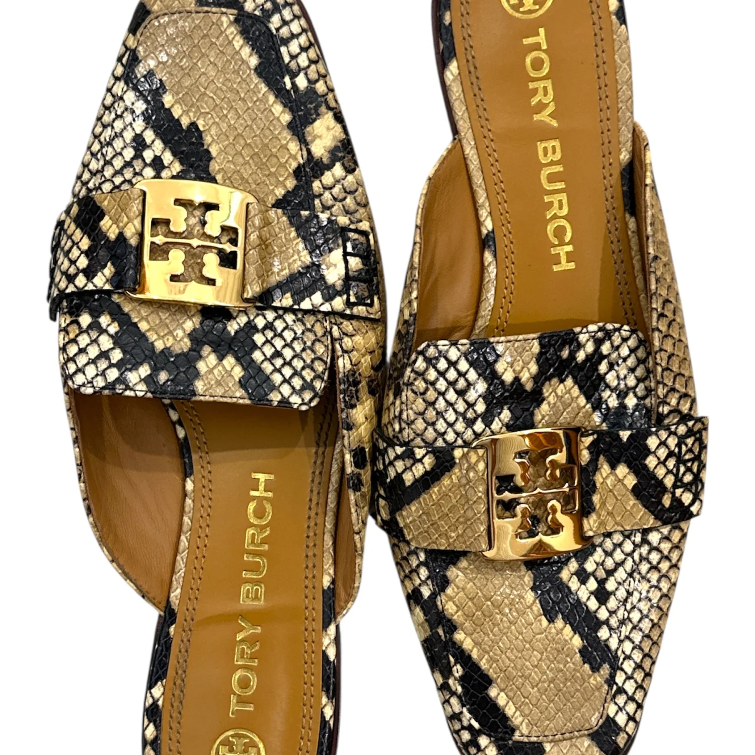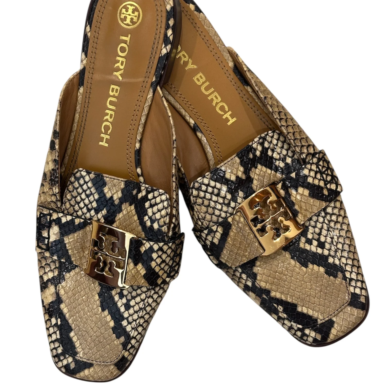 Tory Burch Georgia Loafer Stamped Snake Printed Pale Desert Roccia Mules size 9.5M MSRP: $327.00. No box Python print, Gold and Black tones, square toe. Featuring a gold-colored brass logo on the front. Perfectly pair with trousers, shorts or with your favorite summer dress! Minimal wear, only worn a few times. Please see photos and video (if applicable) for exact condition. Heels and soles in excellent condition. Leather upper and lining, man made sole, made in Brazil
