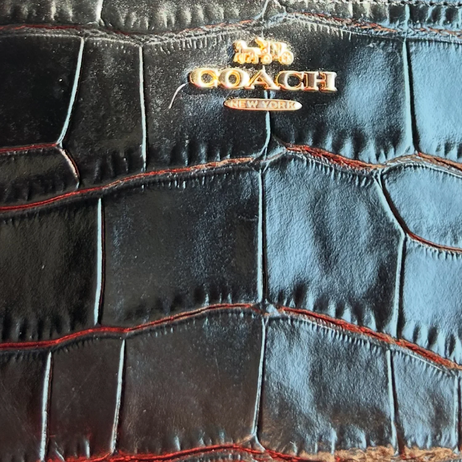 This Coach wallet features a luxurious black croc embossed leather exterior, offering both style and durability. It includes multiple card slots and compartments for organized storage. A perfect accessory for adding sophistication to any ensemble. #Coach #CrocEmbossed #LuxuryWallet