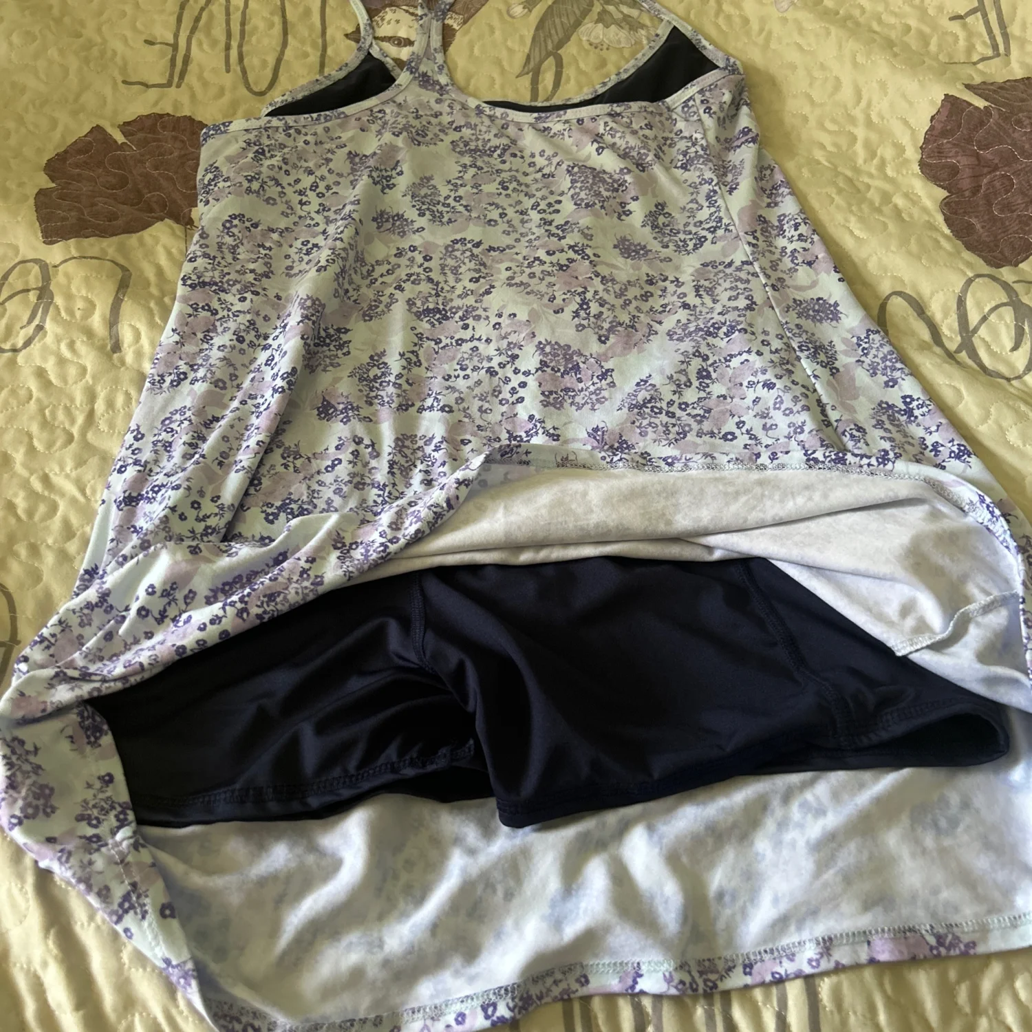 This athletic dress features a beautiful floral print in purple and grey shades. It's designed with a loose fit over integrated black shorts, providing comfort and coverage for active wear. The dress has a sleeveless design with thin straps. Perfect for yoga, running, or casual outings. Made from lightweight, breathable fabric. #athleticwear #floral #activewear