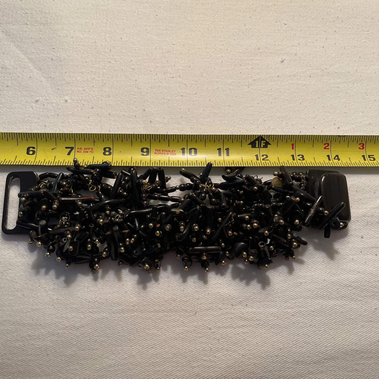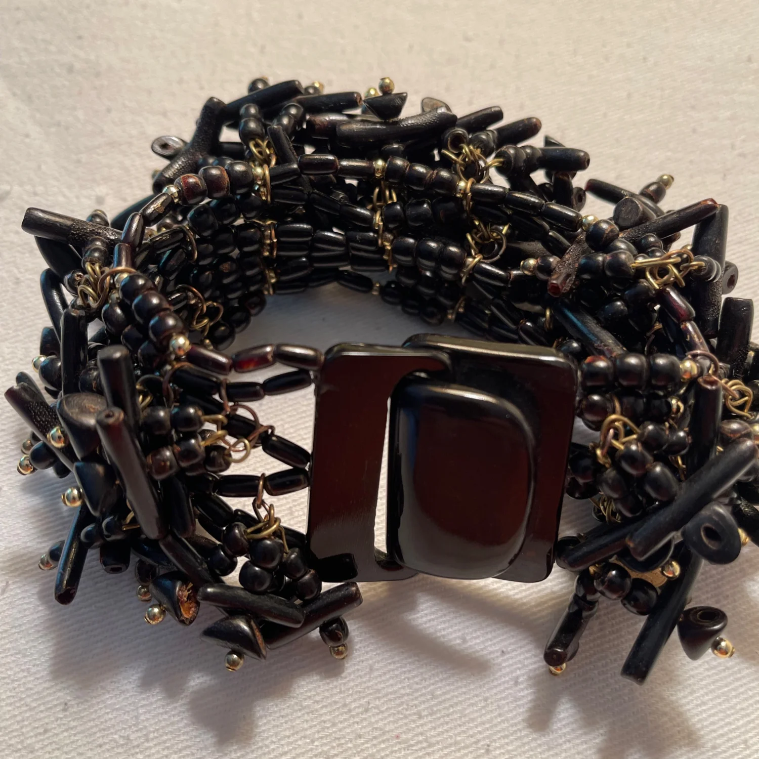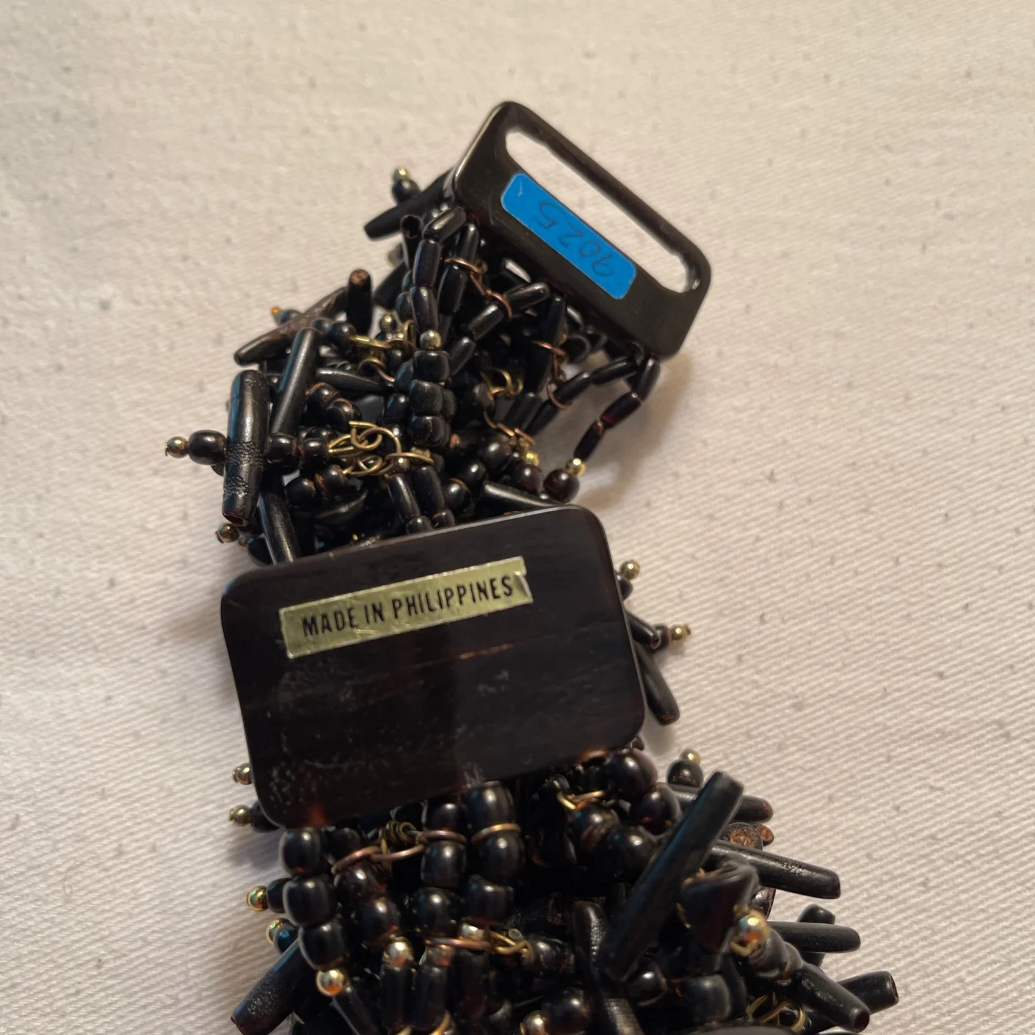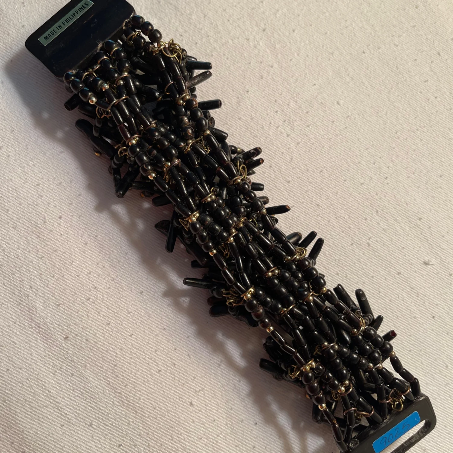 This unique bracelet features a dense cluster of black beads intricately arranged with metallic accents, giving it a striking and textured appearance. Crafted in the Philippines, it showcases traditional artisanal workmanship. The bracelet is fastened with a secure clasp, making it both stylish and functional. Perfect for adding a touch of drama to any outfit. #beaded #handmade #artisan made of horn and seeds