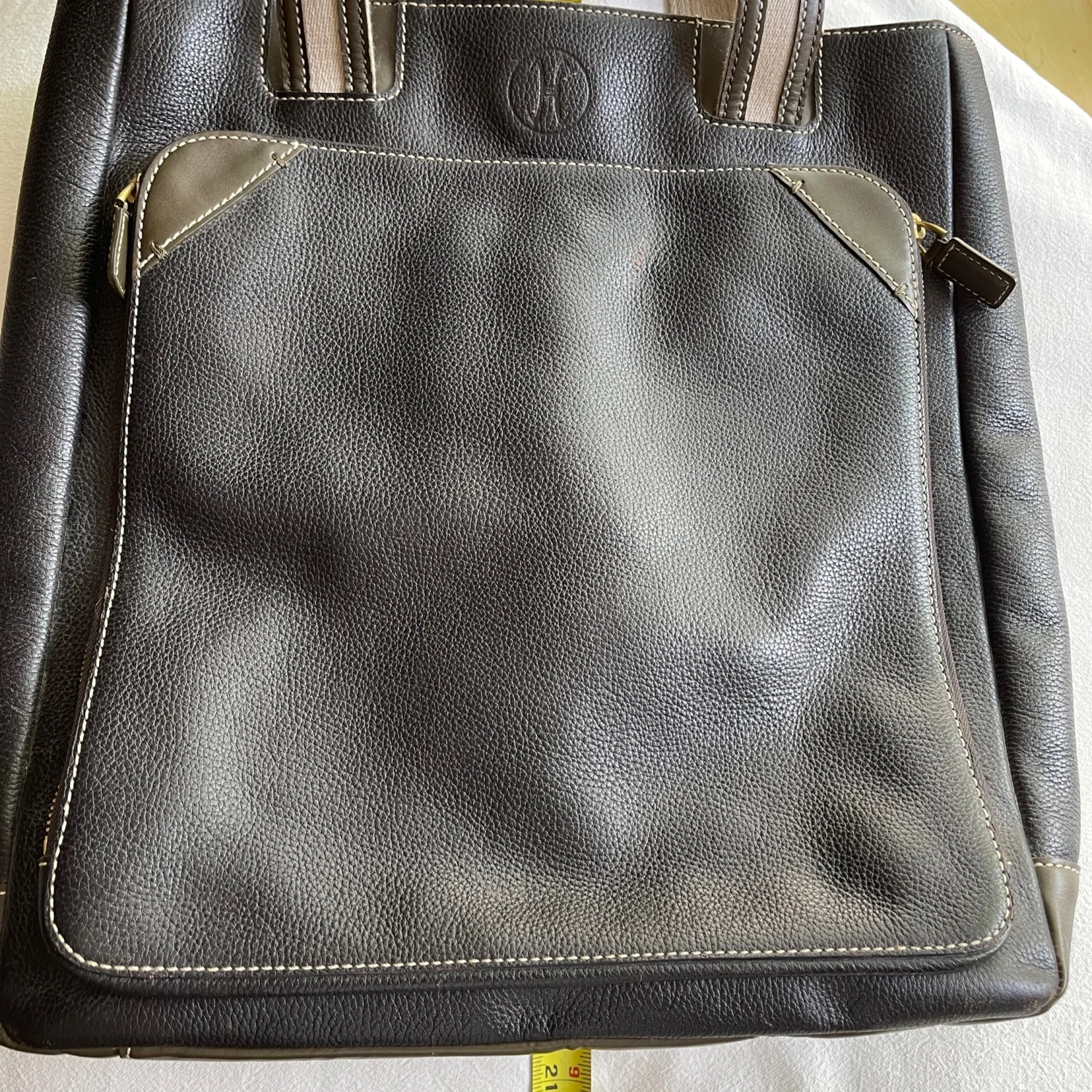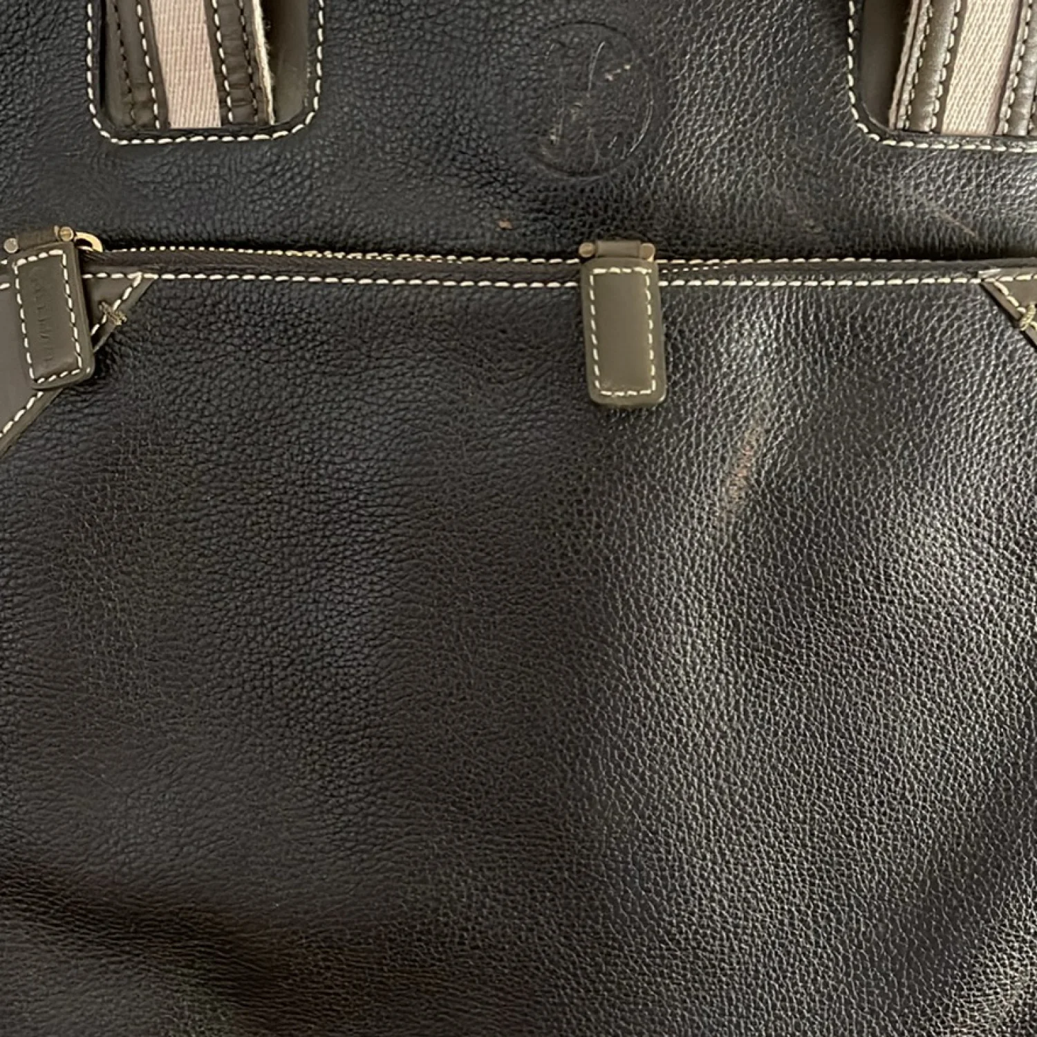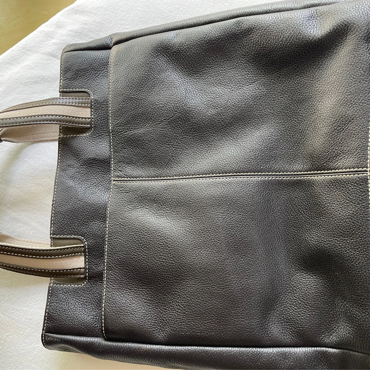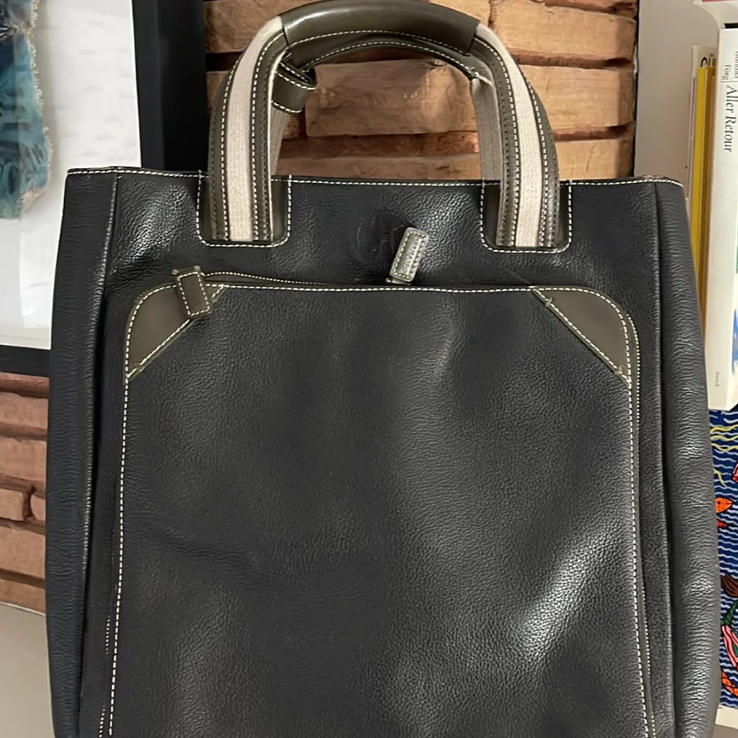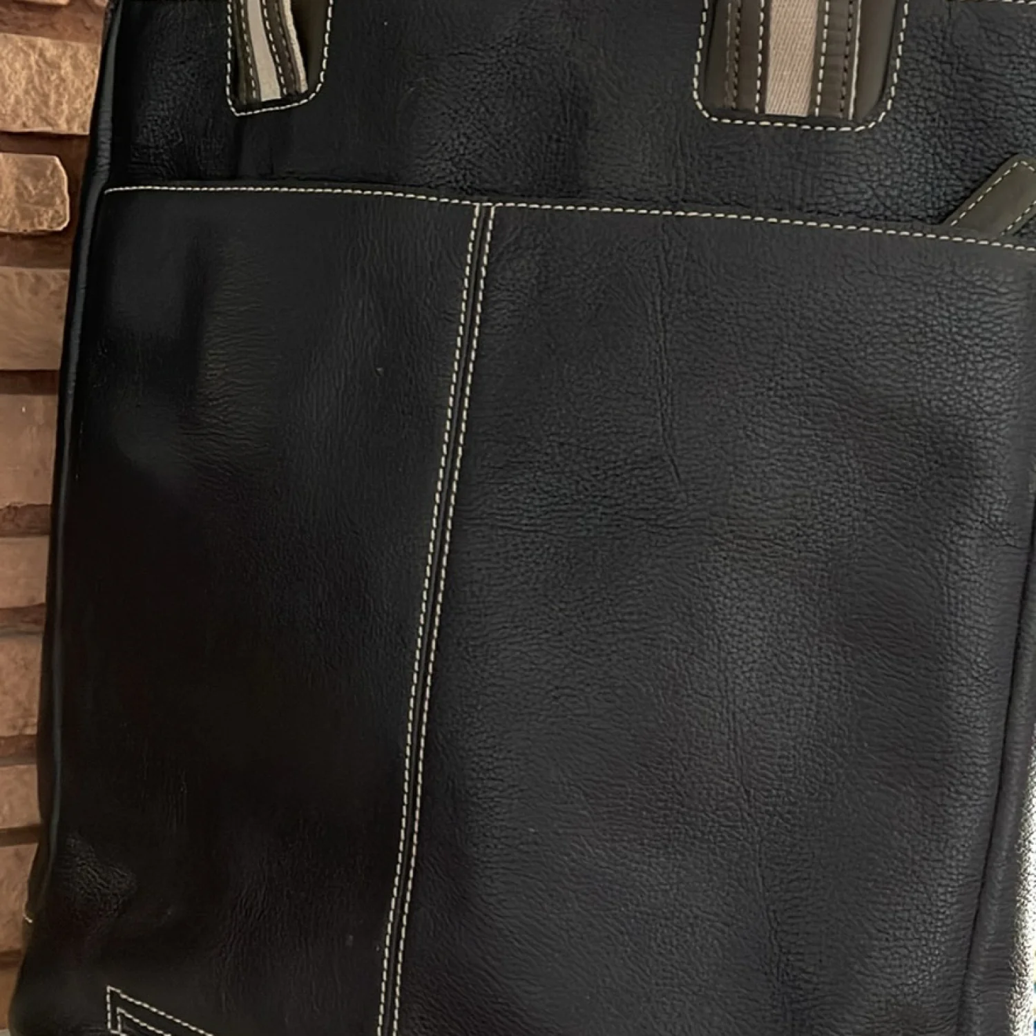 This black leather tote bag features sturdy beige handles and contrast stitching for a stylish look. Perfect for both professional and casual settings, it offers ample space and secure zipper closures. Made from high-quality leather, it is durable and designed for long-lasting use. Ideal for carrying books, a laptop, or daily essentials. #leather #tote #fashion