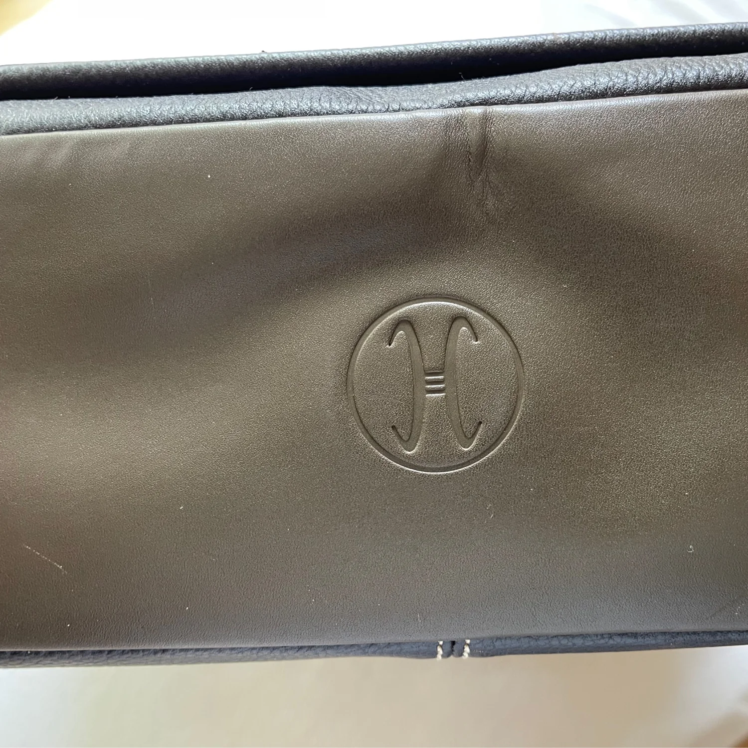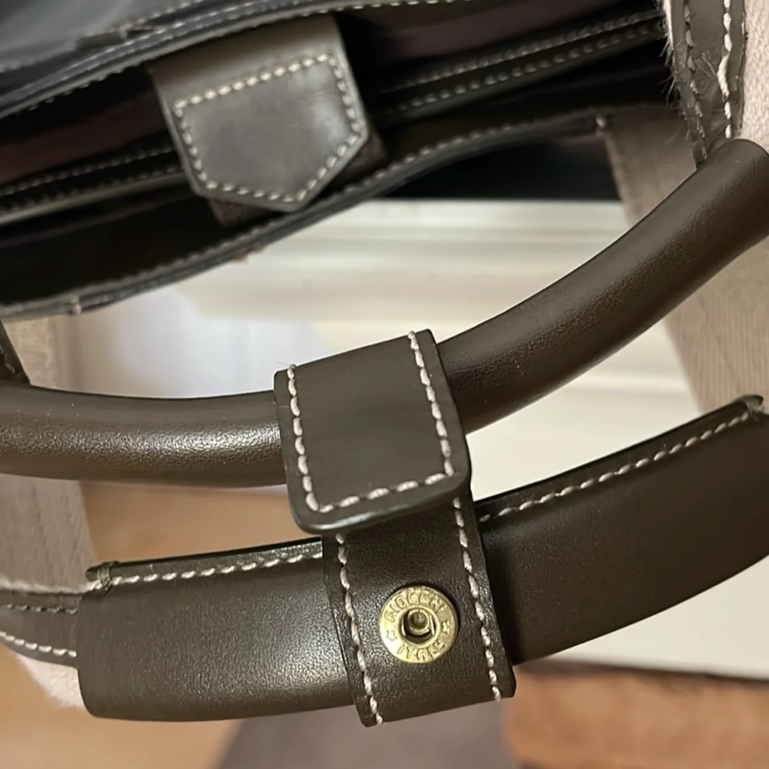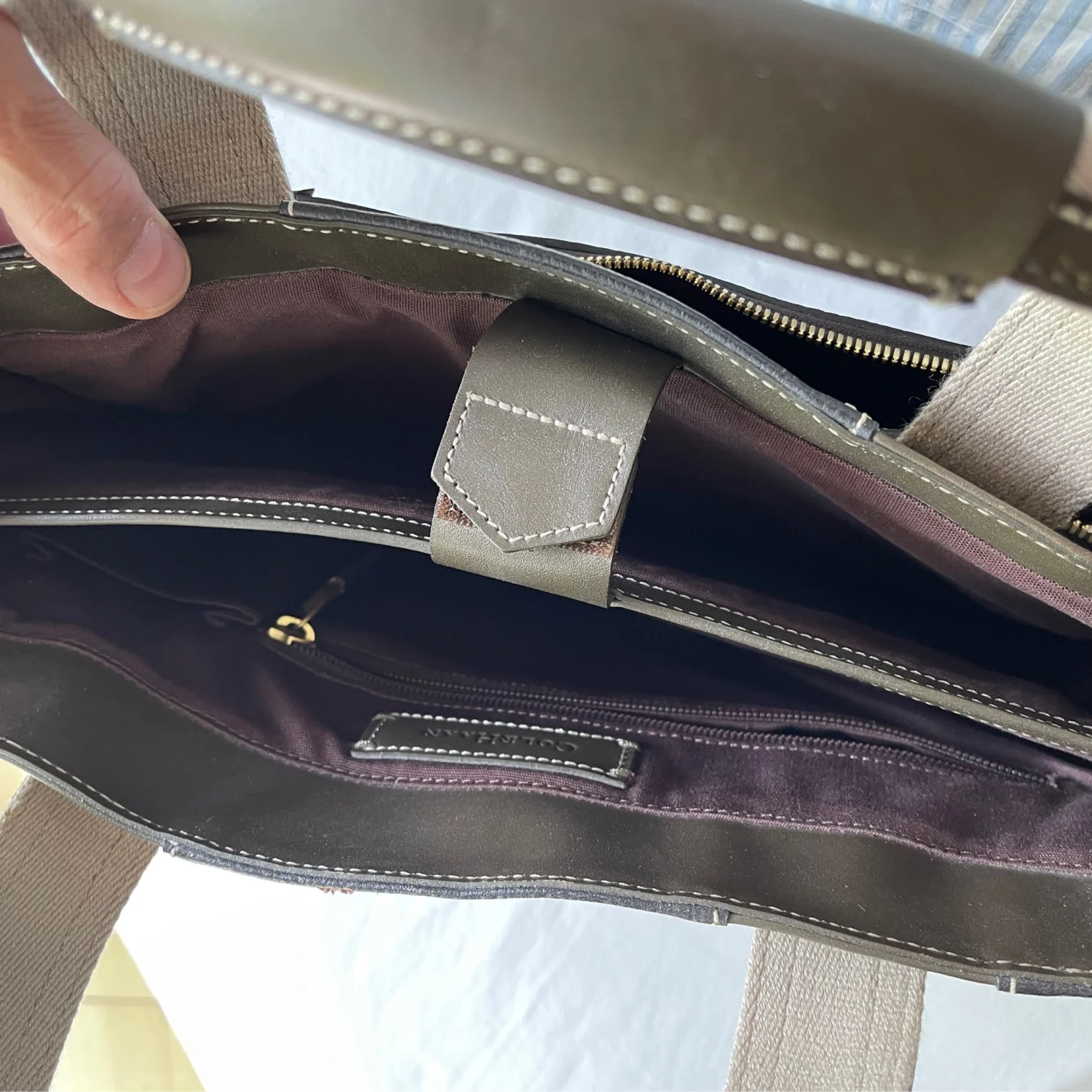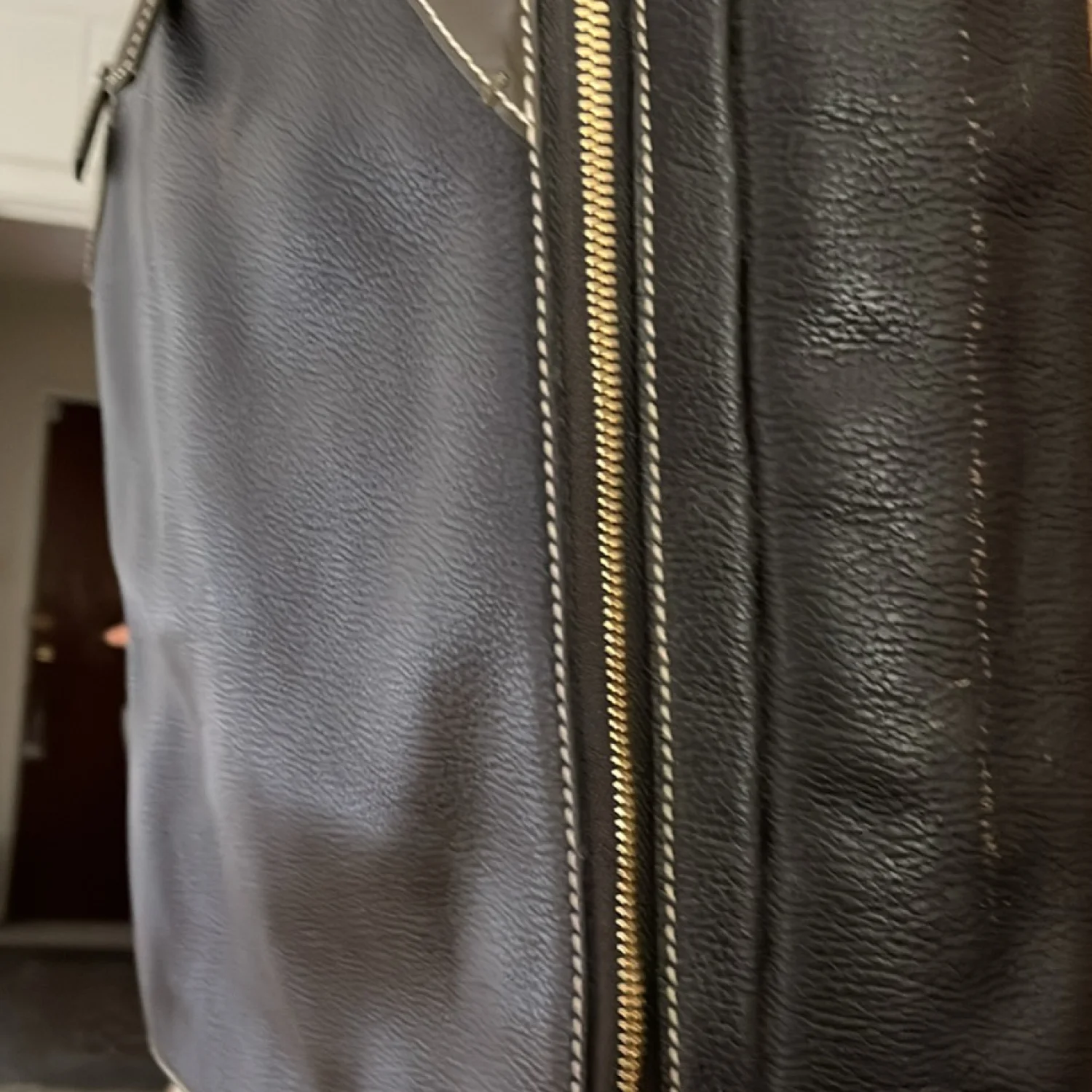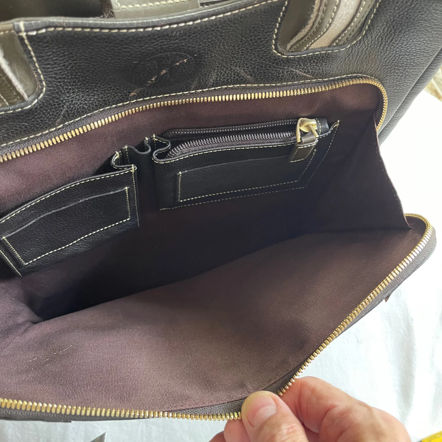 This black leather tote bag features sturdy beige handles and contrast stitching for a stylish look. Perfect for both professional and casual settings, it offers ample space and secure zipper closures. Made from high-quality leather, it is durable and designed for long-lasting use. Ideal for carrying books, a laptop, or daily essentials. #leather #tote #fashion