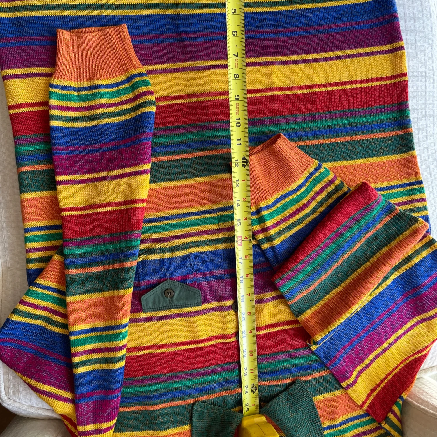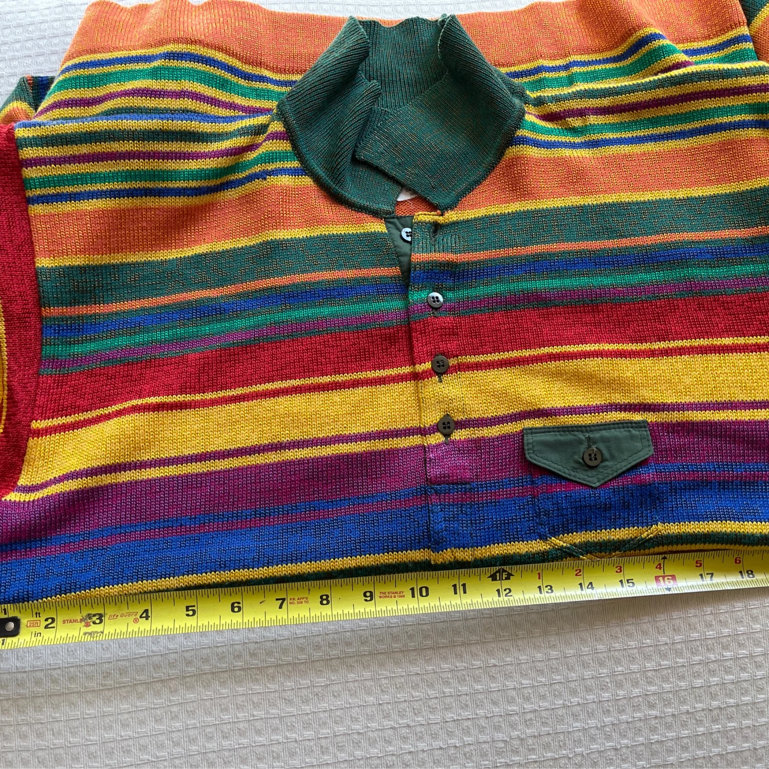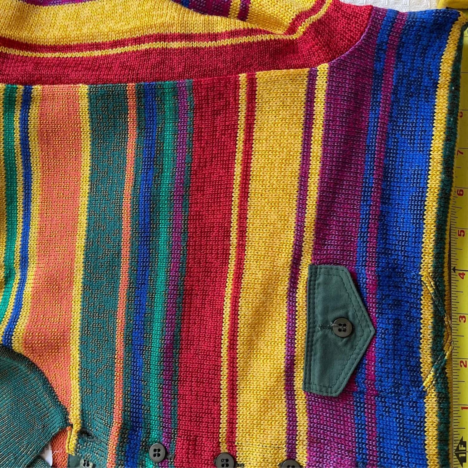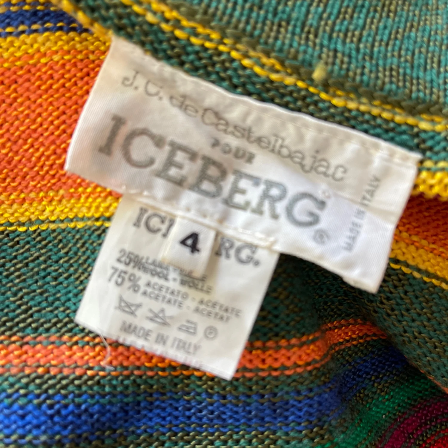 Vintage J.C. de Castelbajac for Iceberg polo featuring a vibrant striped pattern in green, red, orange, blue, and yellow. This mid-weight piece is crafted from 75% acetate and 25% viscose, offering a soft and comfortable fit. The polo includes green button details and a collar for added style. Made in Italy. Perfect for adding a pop of color to any outfit. Size 4 (similar to S/M). #vintage #striped #colorful #cardigan #Iceberg #ItalianFashion