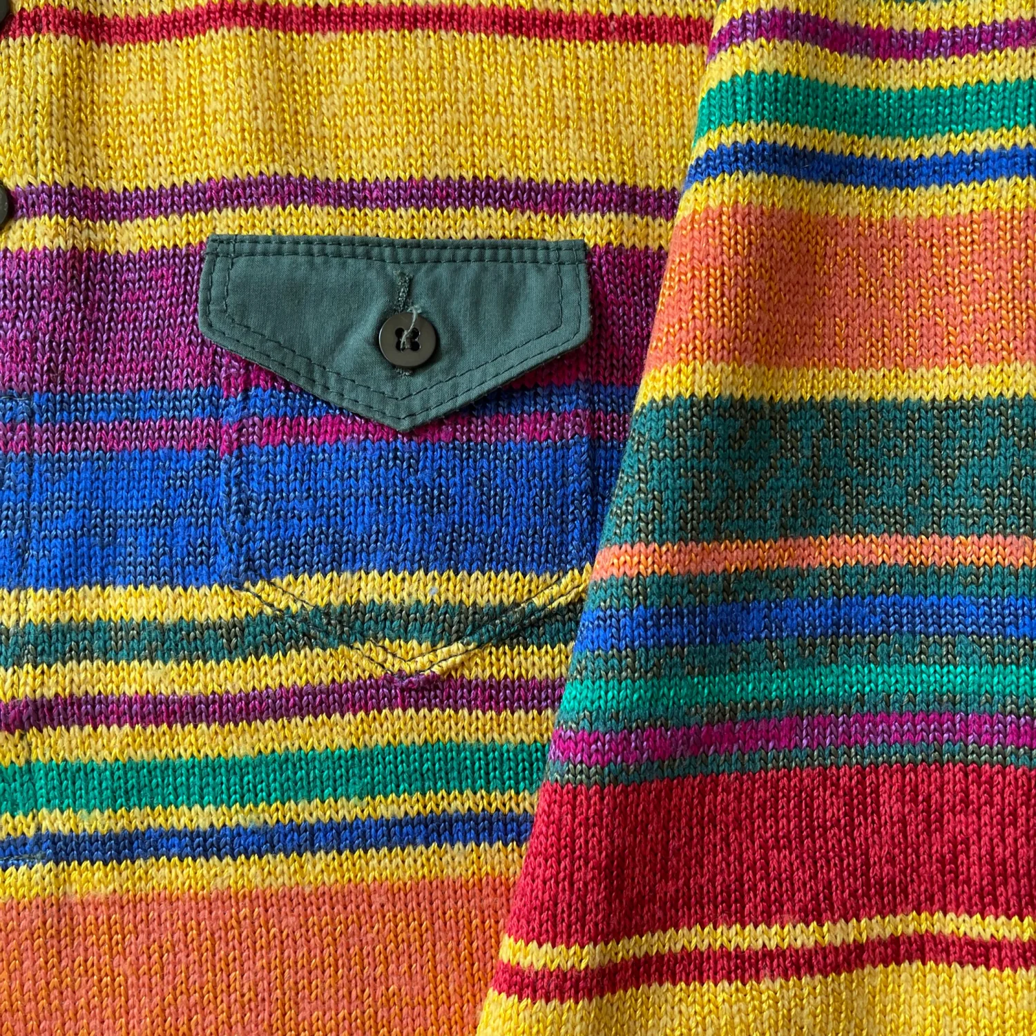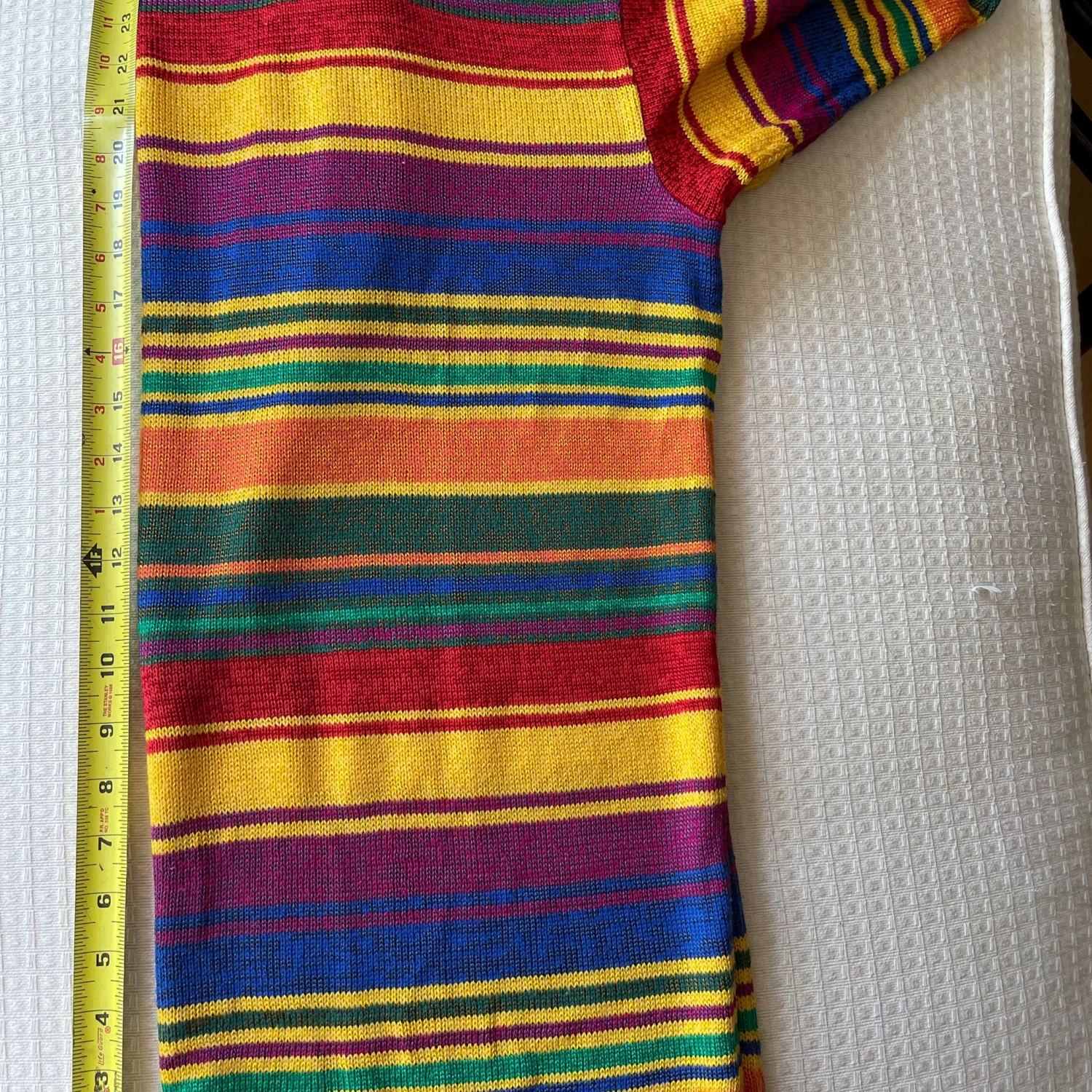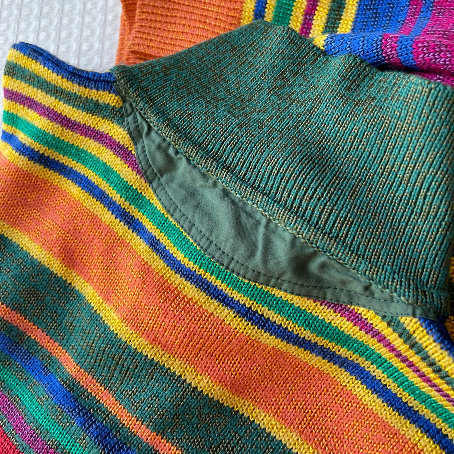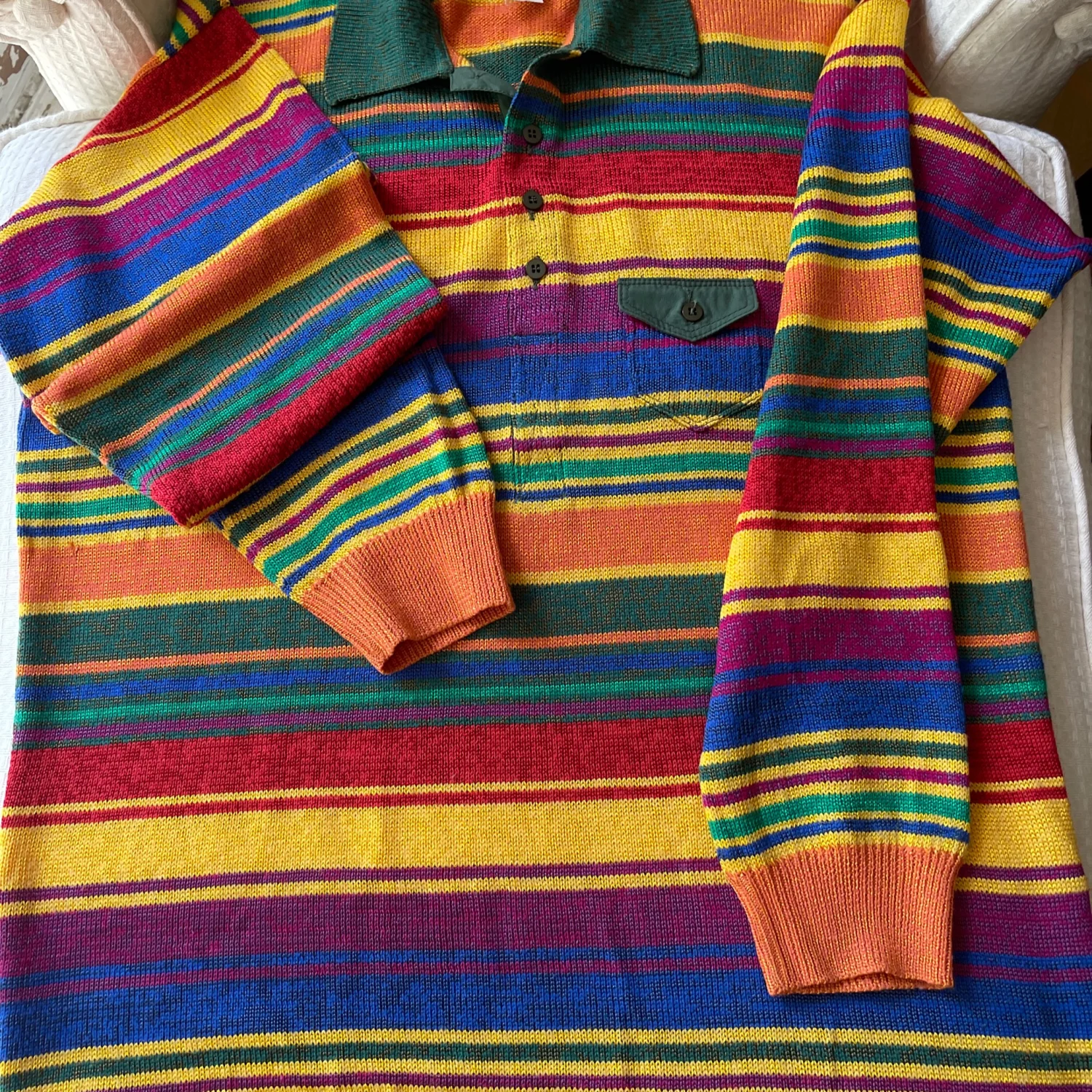 Vintage J.C. de Castelbajac for Iceberg polo featuring a vibrant striped pattern in green, red, orange, blue, and yellow. This mid-weight piece is crafted from 75% acetate and 25% viscose, offering a soft and comfortable fit. The polo includes green button details and a collar for added style. Made in Italy. Perfect for adding a pop of color to any outfit. Size 4 (similar to S/M). #vintage #striped #colorful #cardigan #Iceberg #ItalianFashion