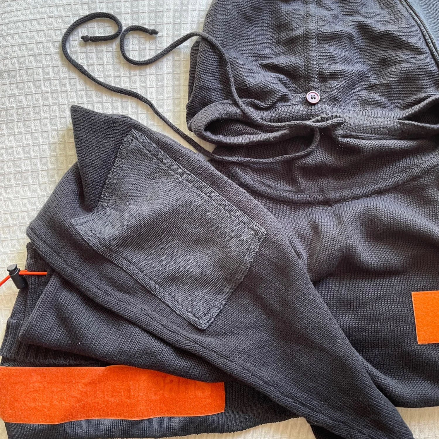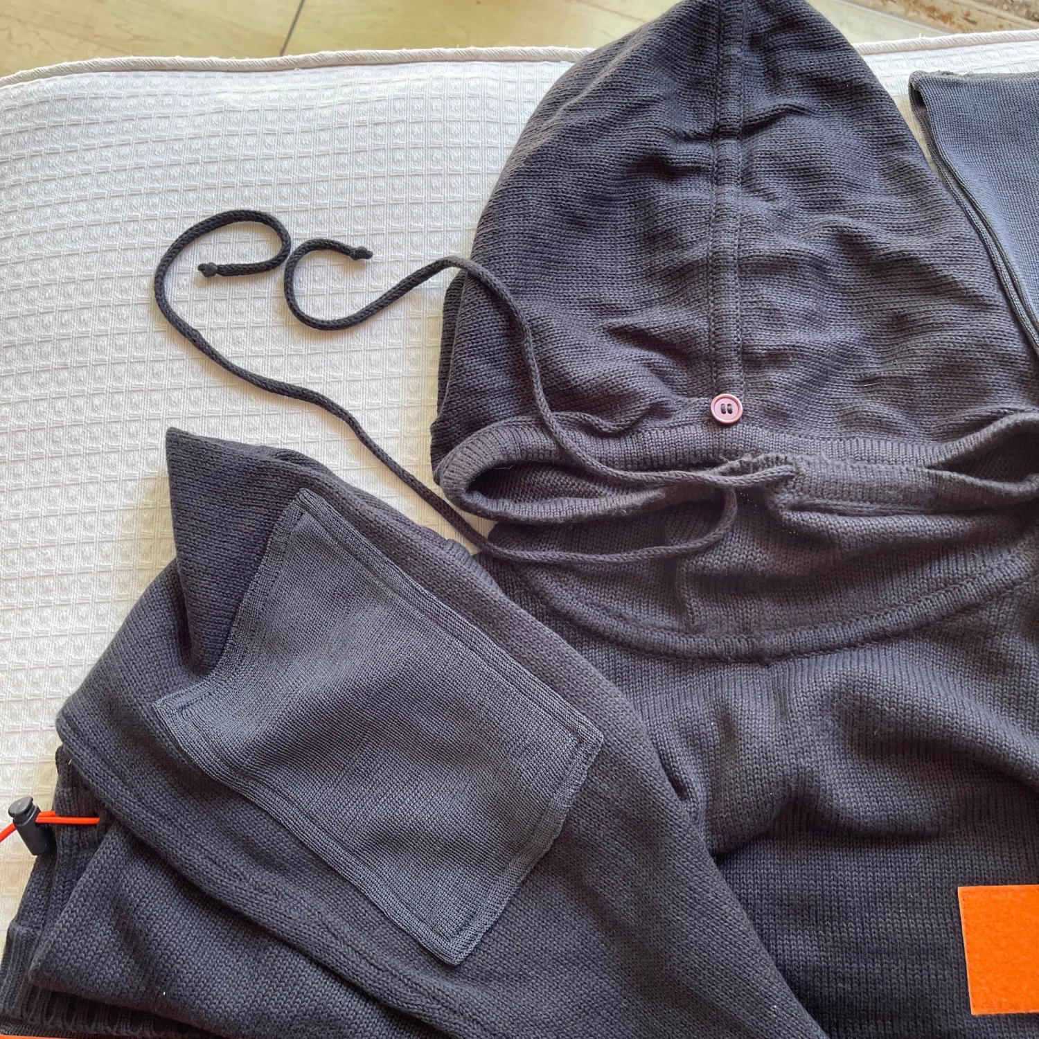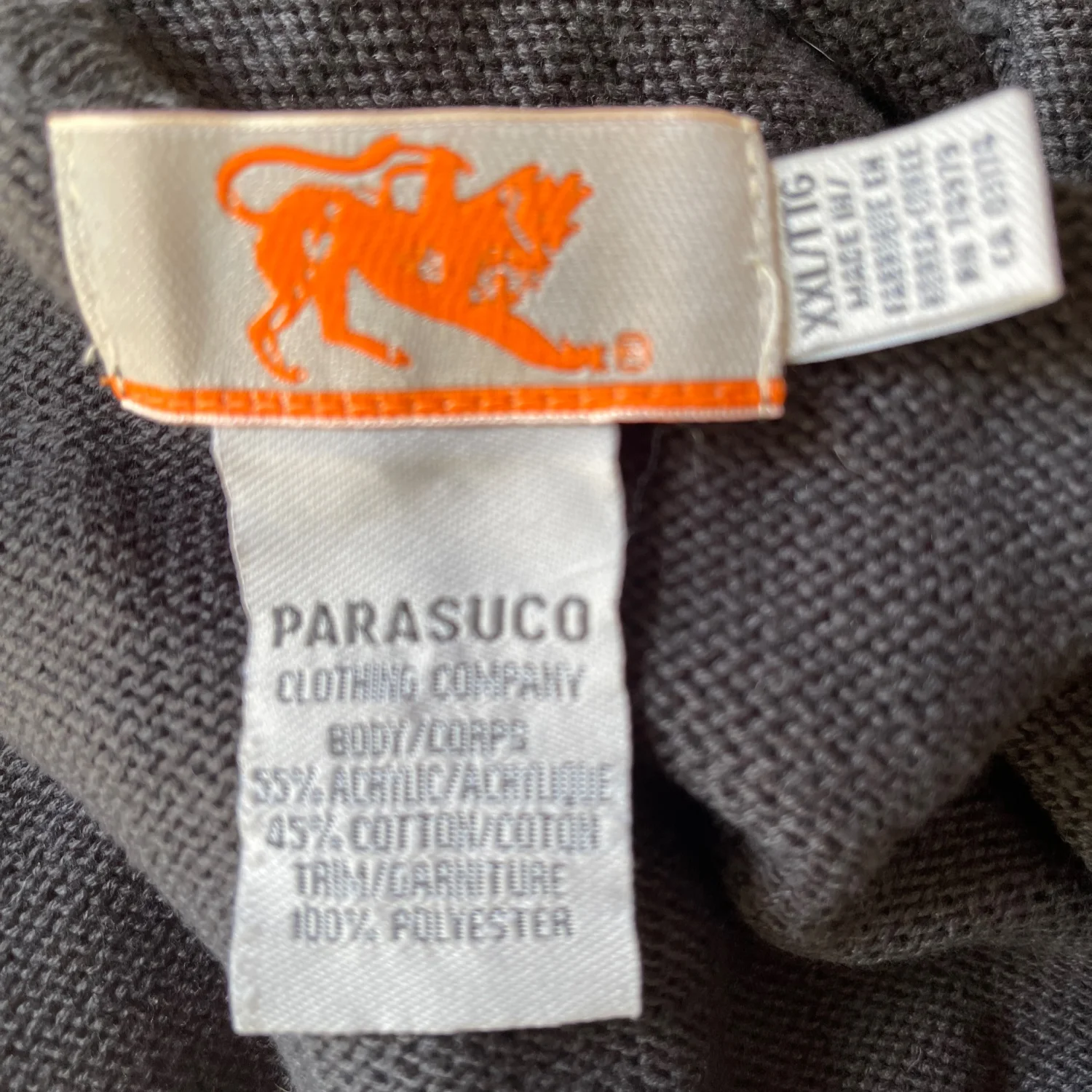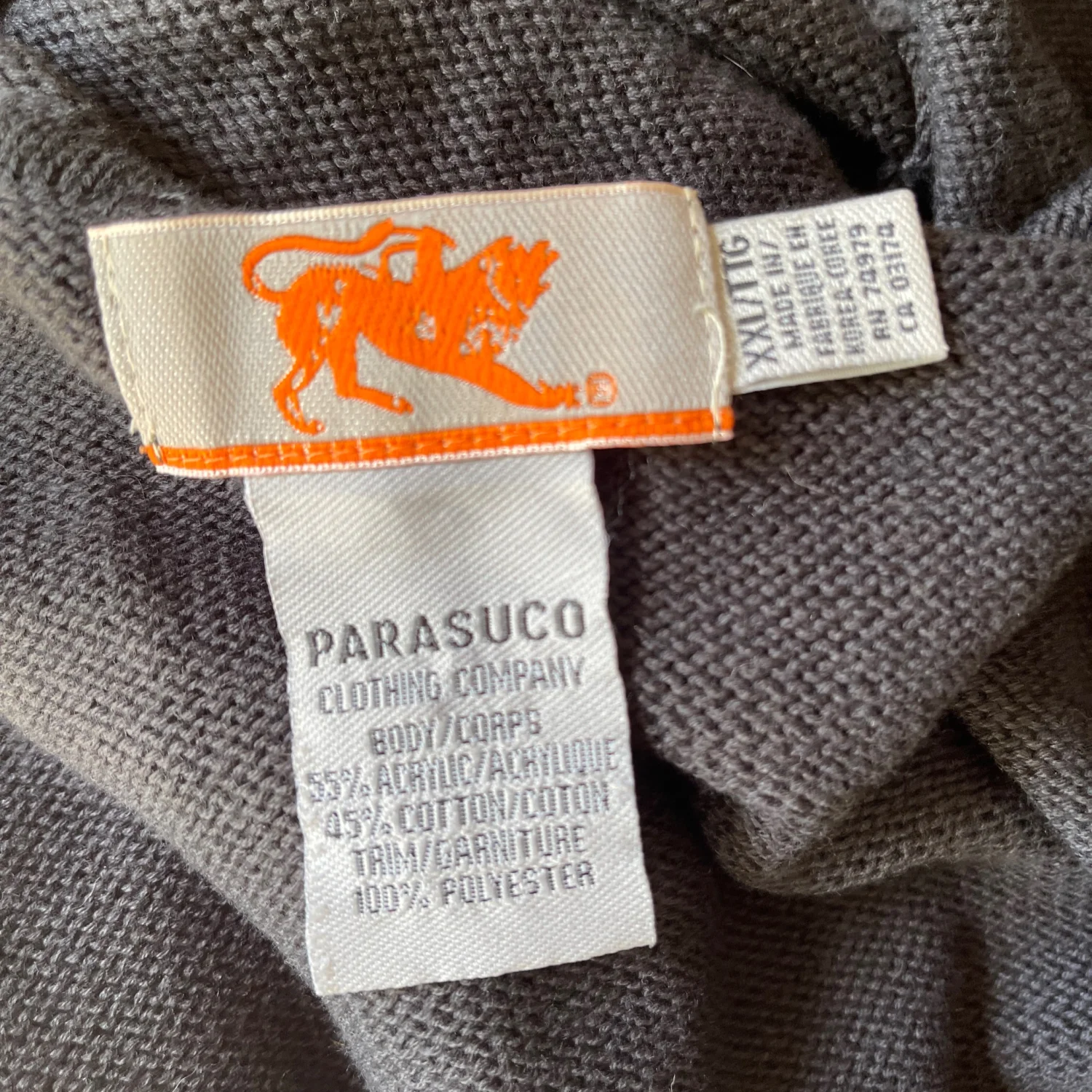 Vintage Parasuco grey knit hoodie made from 55% acrylic and 45% cotton with 100% polyester trim. Features an orange accent tag and a unique adjustable drawstring. This stylish hoodie is perfect for casual wear and layering. #vintage #knitwear