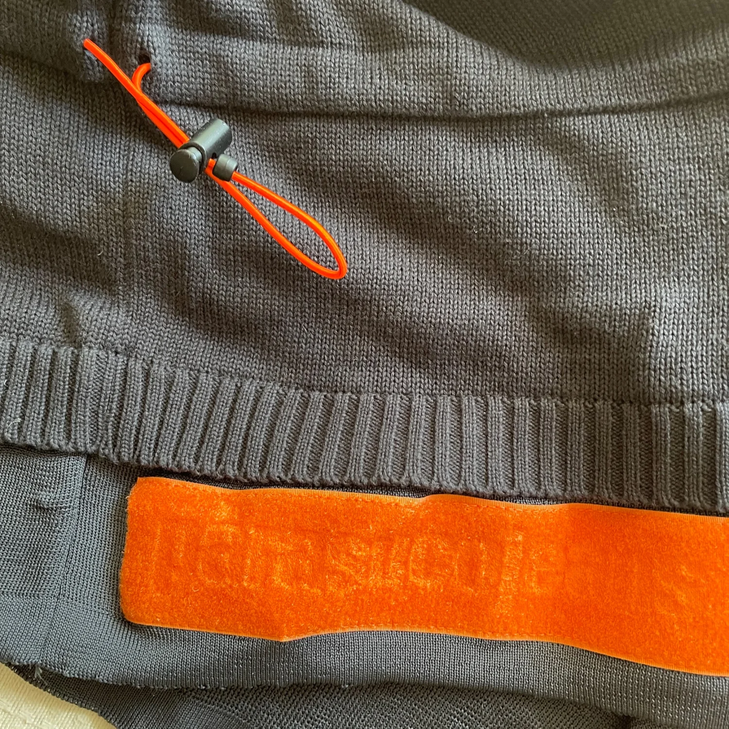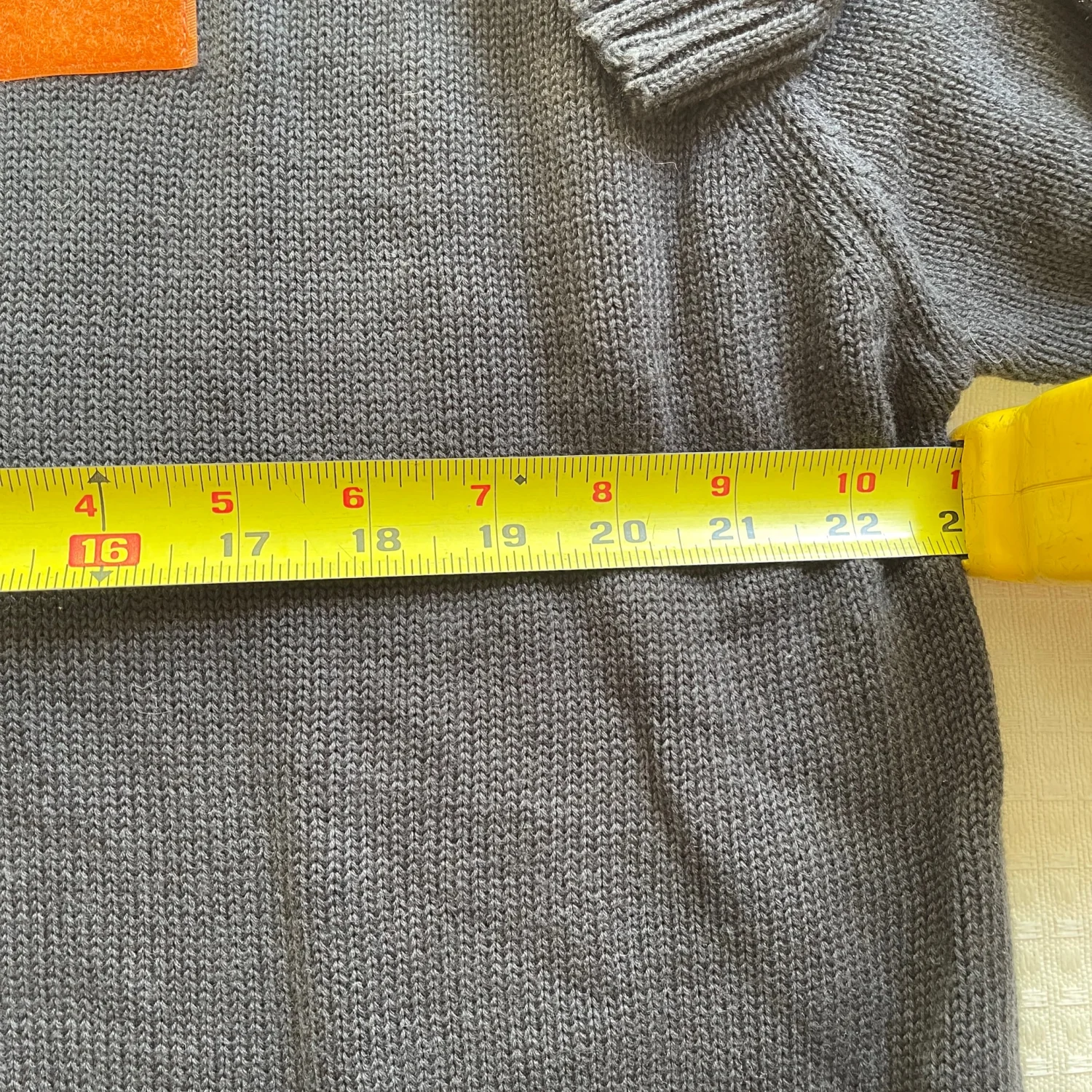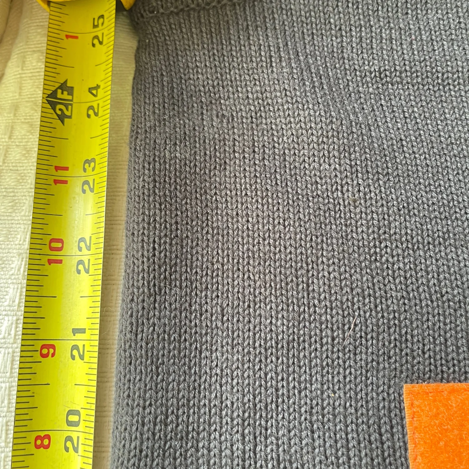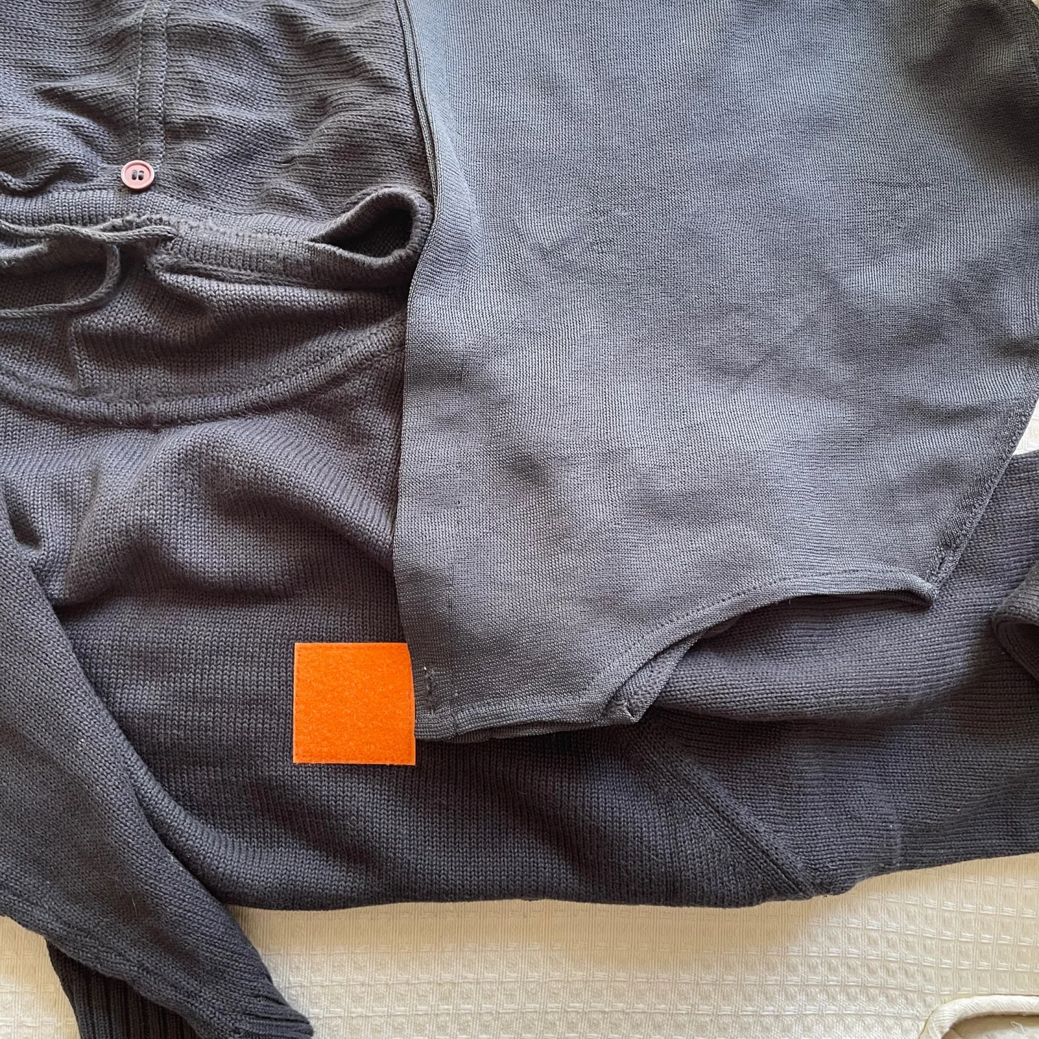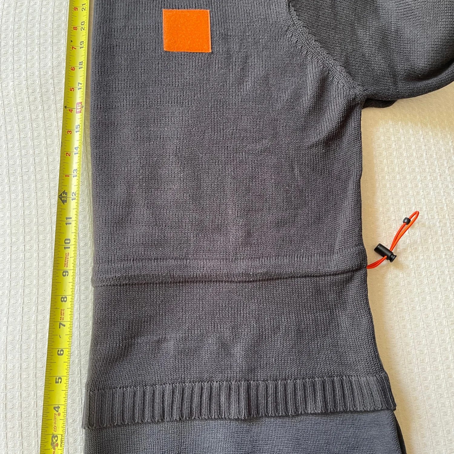 Vintage Parasuco grey knit hoodie made from 55% acrylic and 45% cotton with 100% polyester trim. Features an orange accent tag and a unique adjustable drawstring. This stylish hoodie is perfect for casual wear and layering. #vintage #knitwear