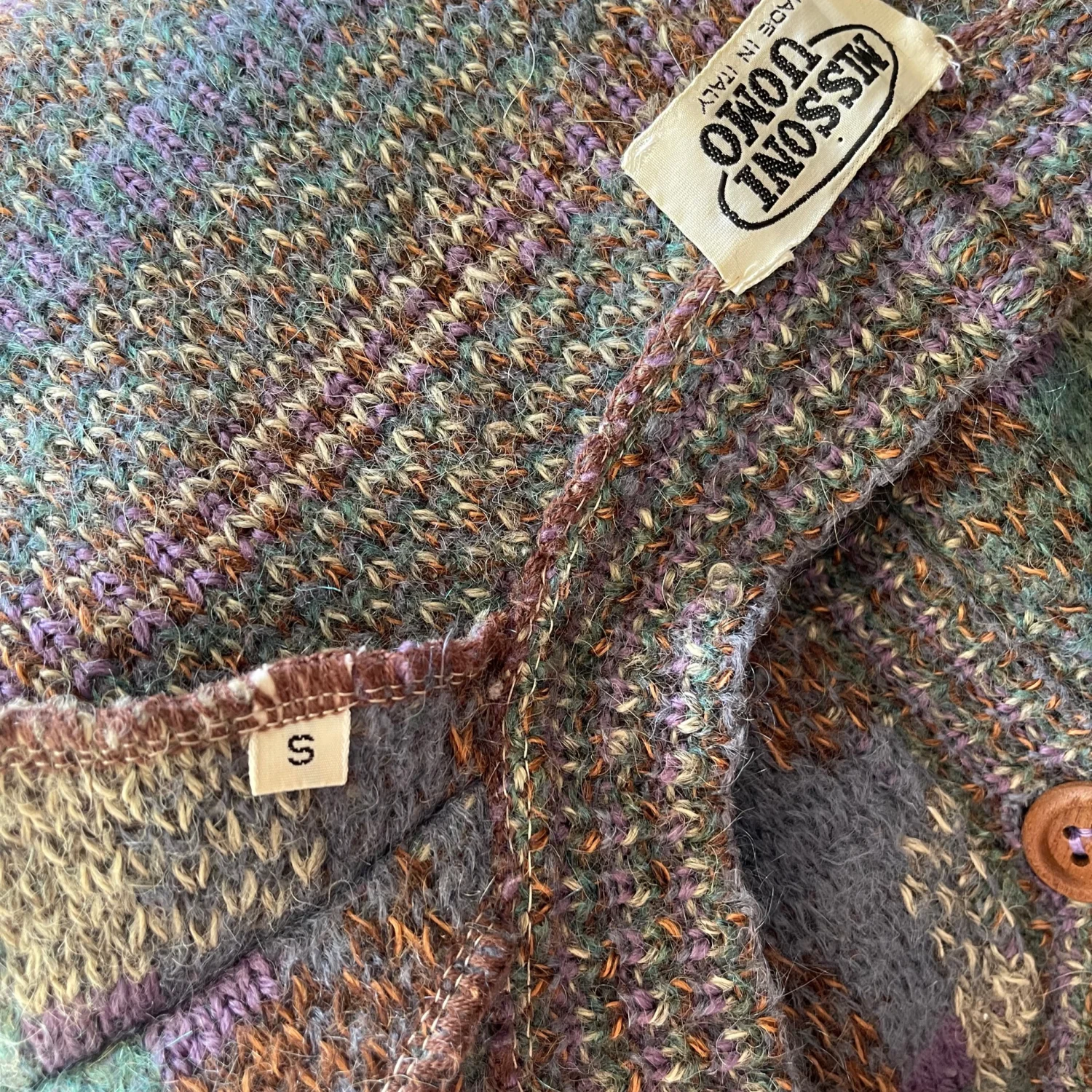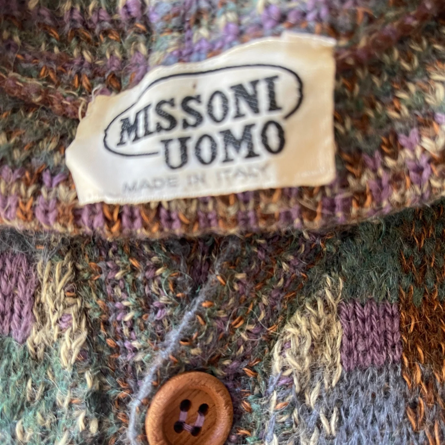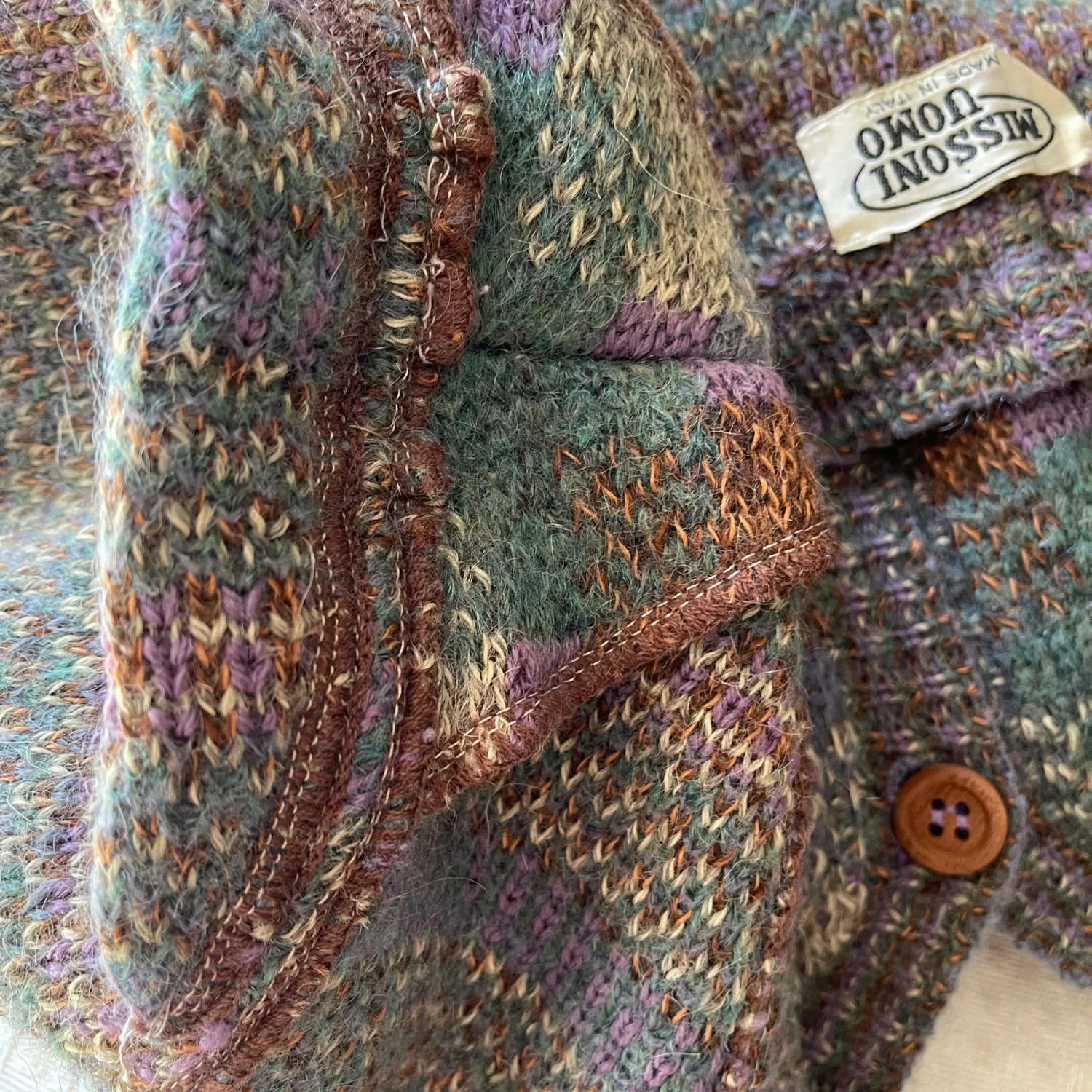 This cozy vintage cardigan sweater from Missoni Uomo features a multi-color geometric pattern in shades of grey, green, and brown. It is made of a soft wool blend, perfect for layering in cooler weather. The cardigan includes wooden buttons, a v-neckline, and two front pockets for practicality. Ideal for those who love a retro aesthetic. #Vintage #Sweater