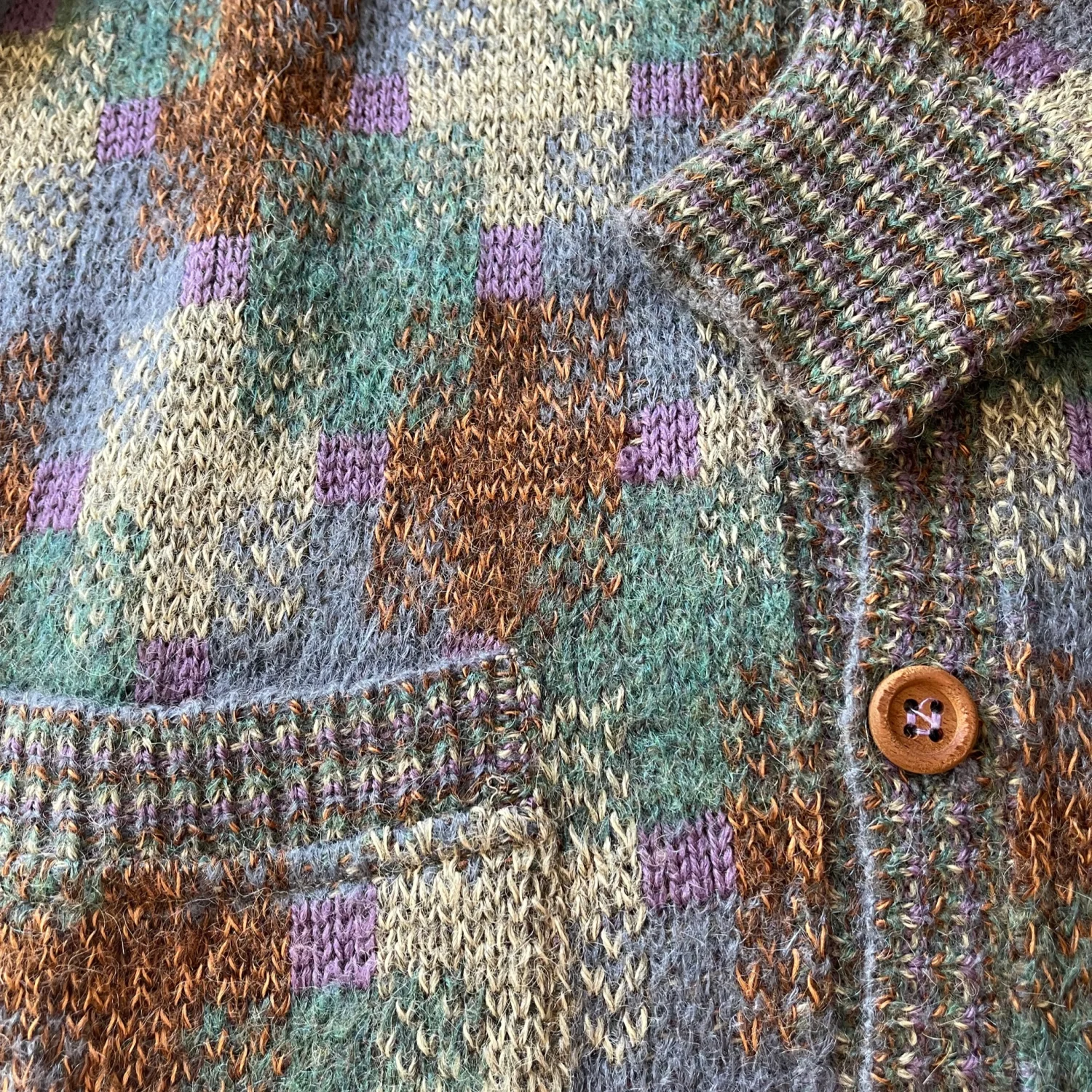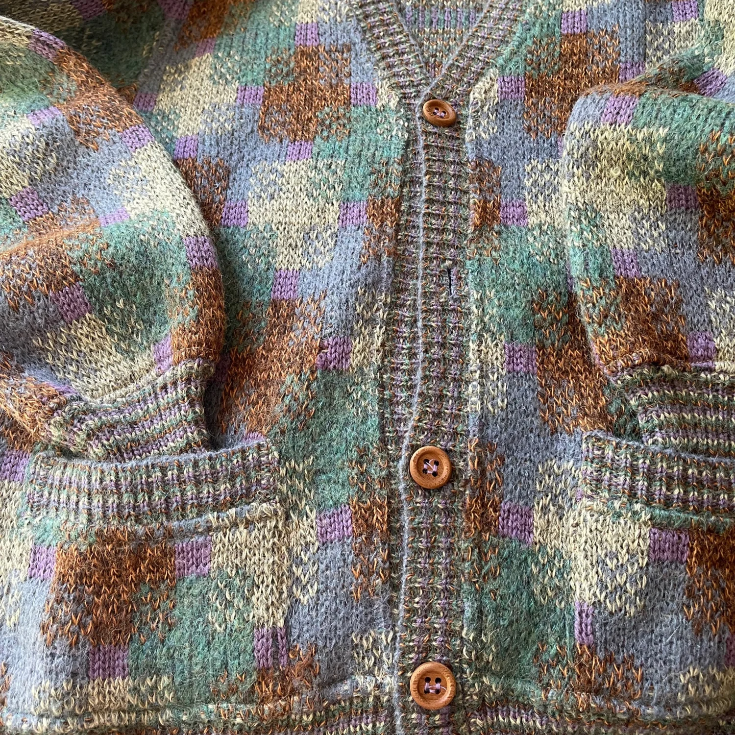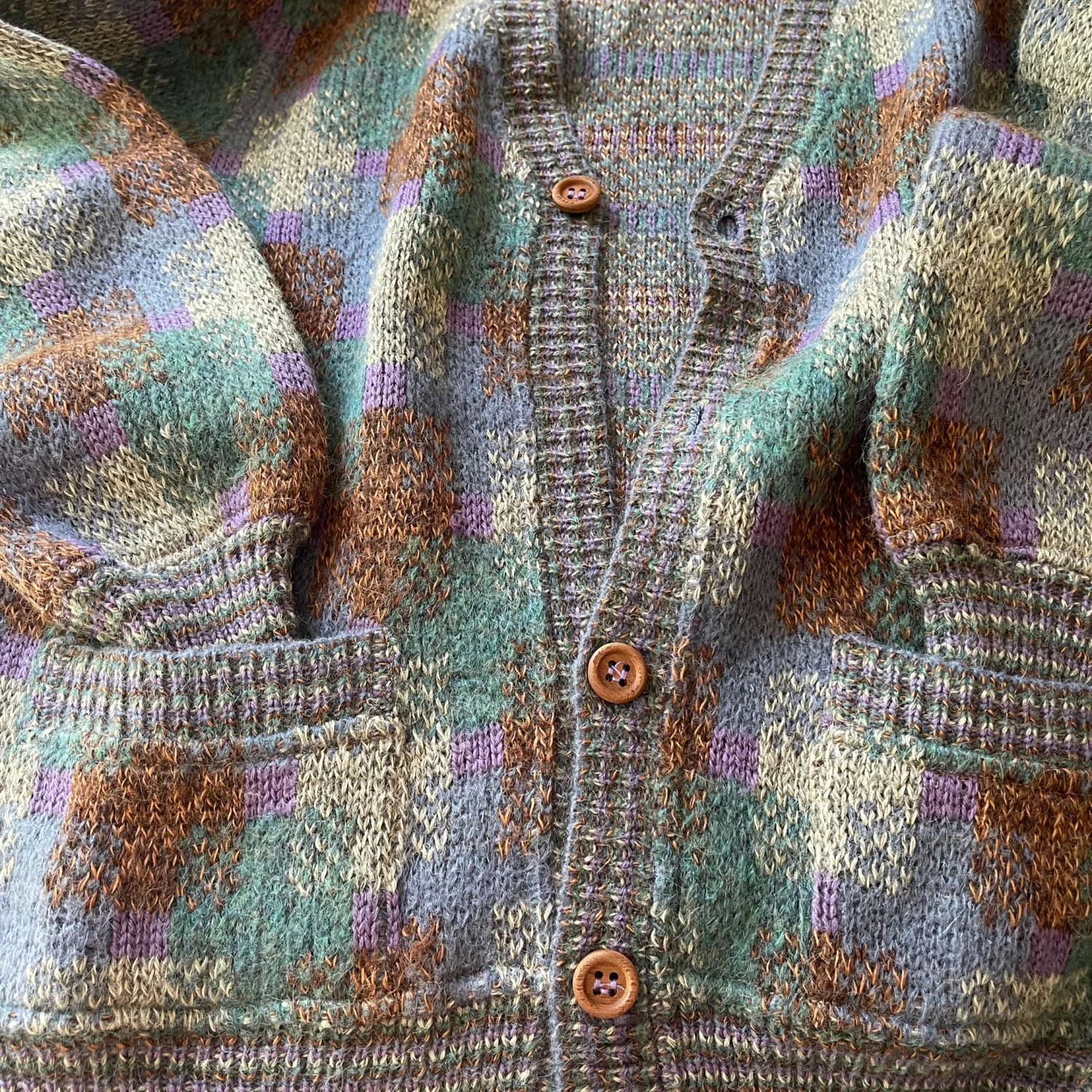 This cozy vintage cardigan sweater from Missoni Uomo features a multi-color geometric pattern in shades of grey, green, and brown. It is made of a soft wool blend, perfect for layering in cooler weather. The cardigan includes wooden buttons, a v-neckline, and two front pockets for practicality. Ideal for those who love a retro aesthetic. #Vintage #Sweater