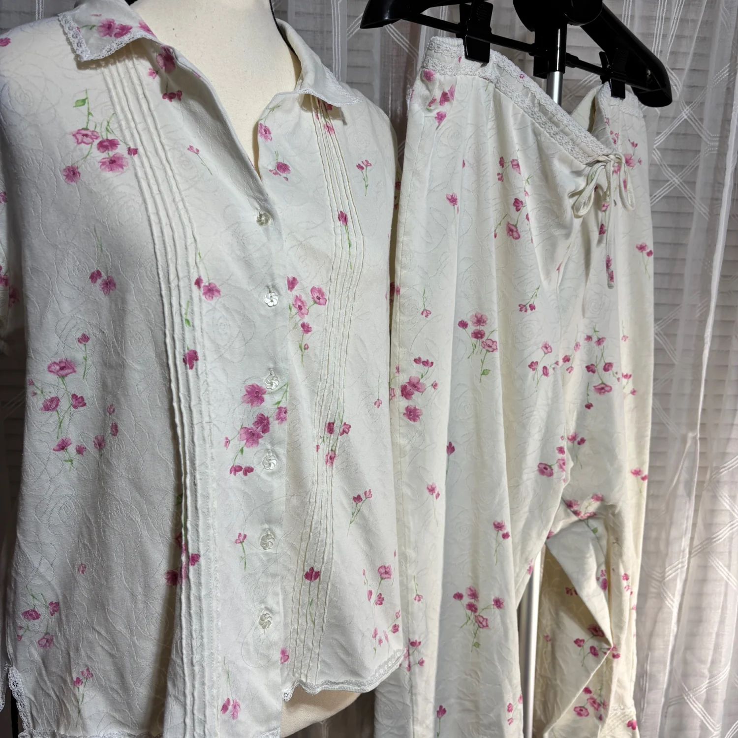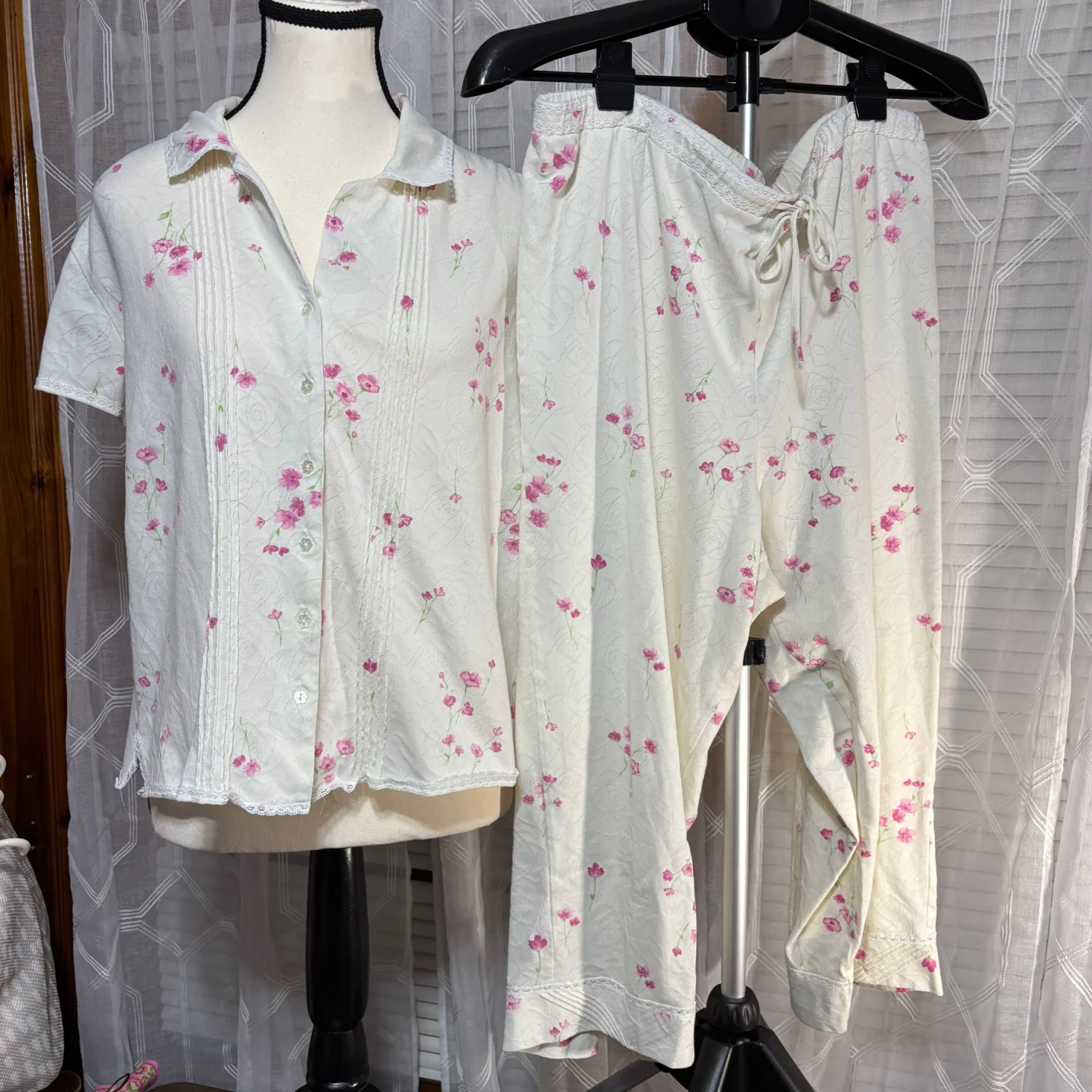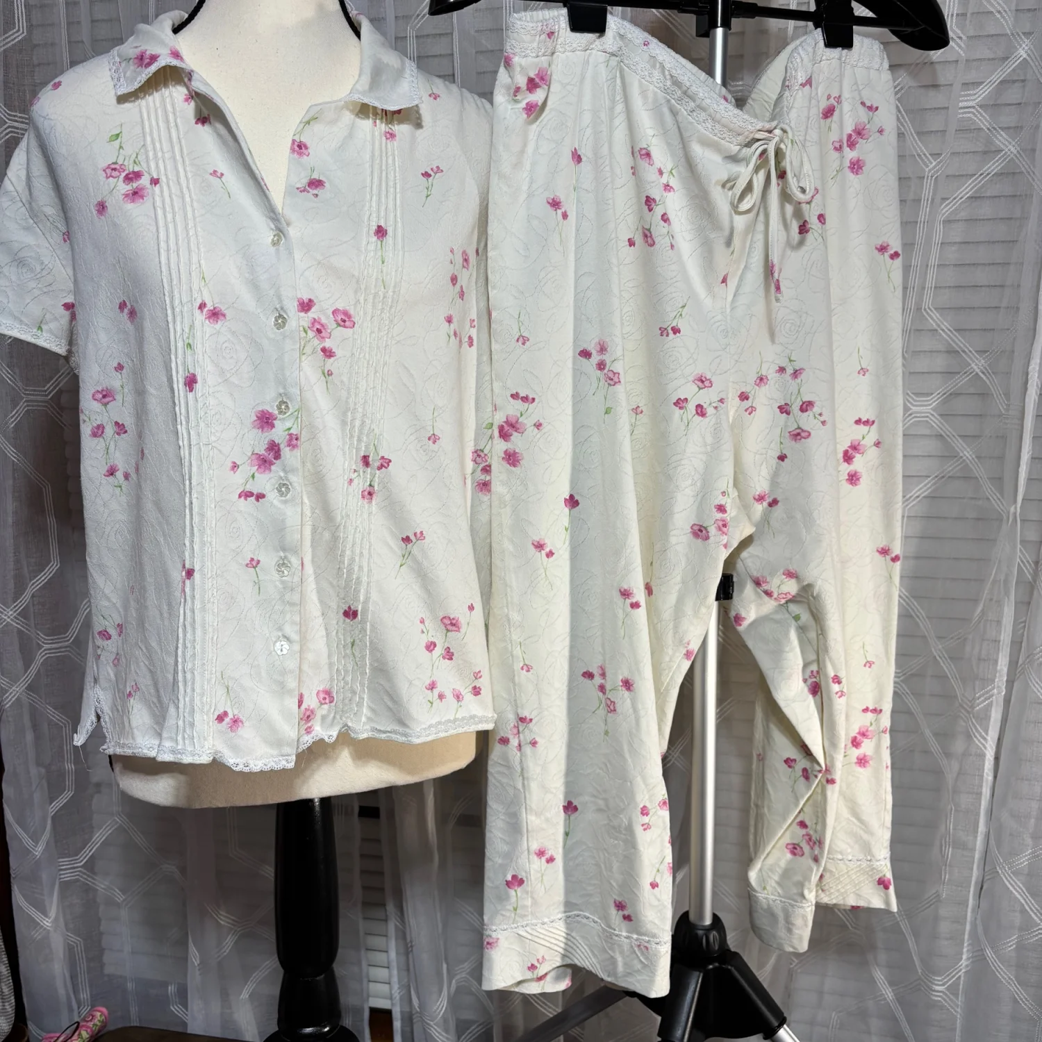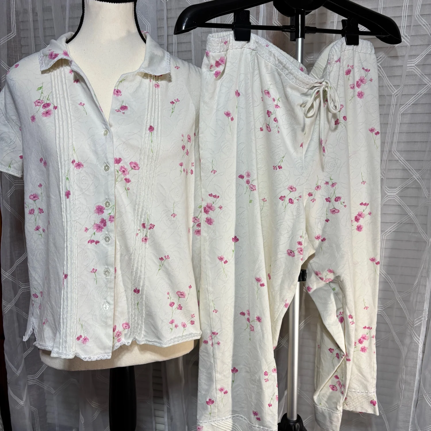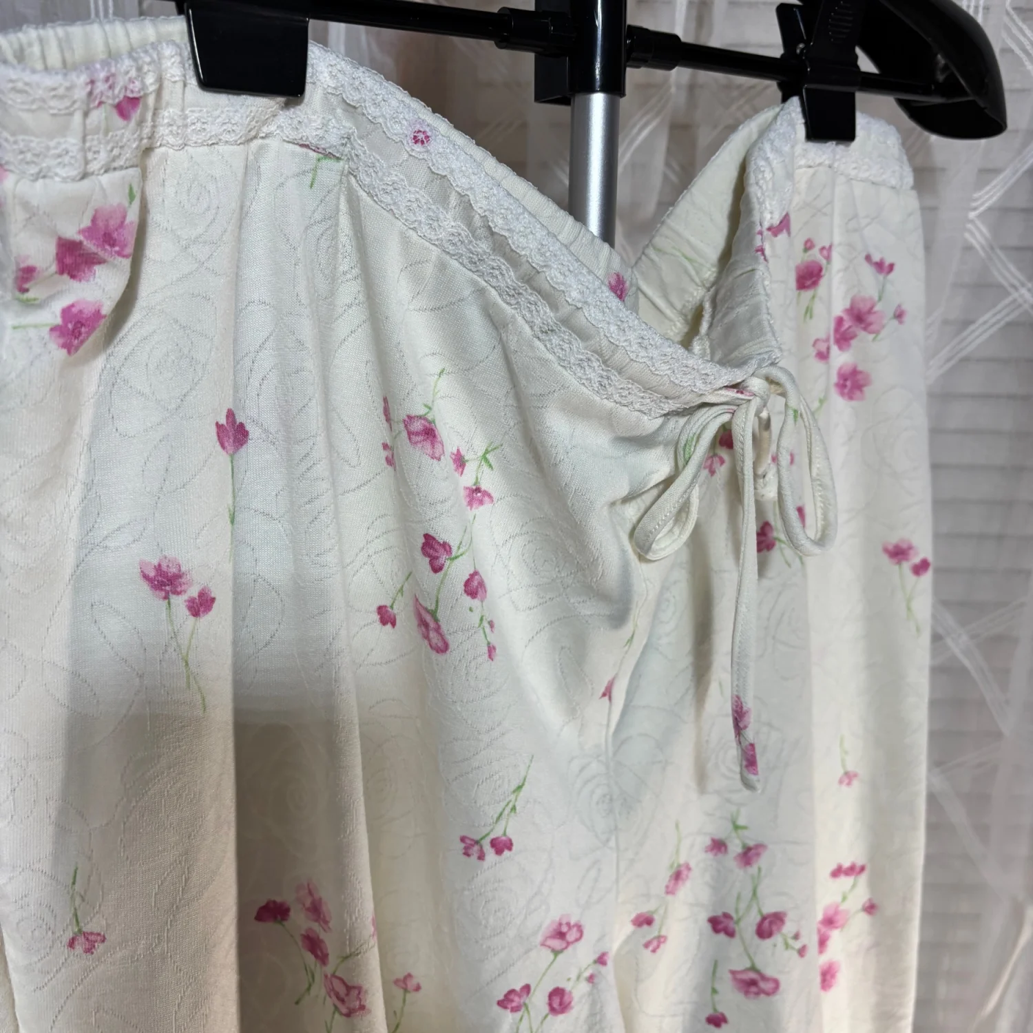 Aria sz Large 2pc pink floral & cream Women's Pajama Set drawstring crop pant 31”L 70% cotton