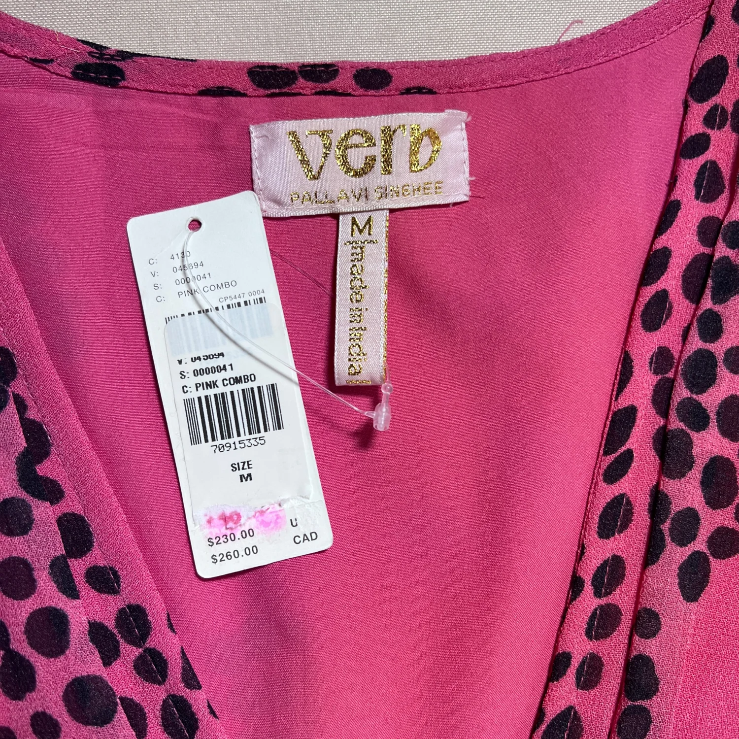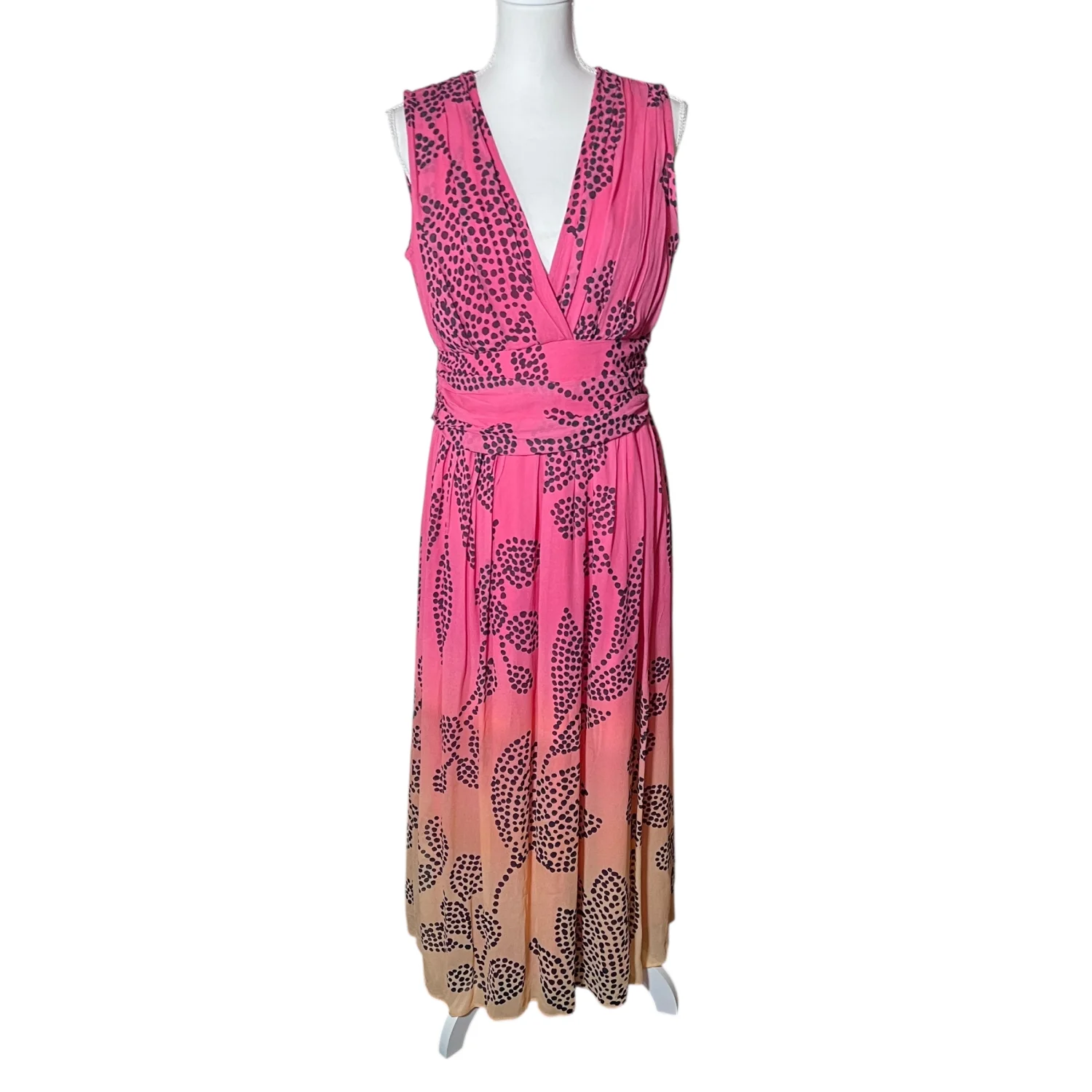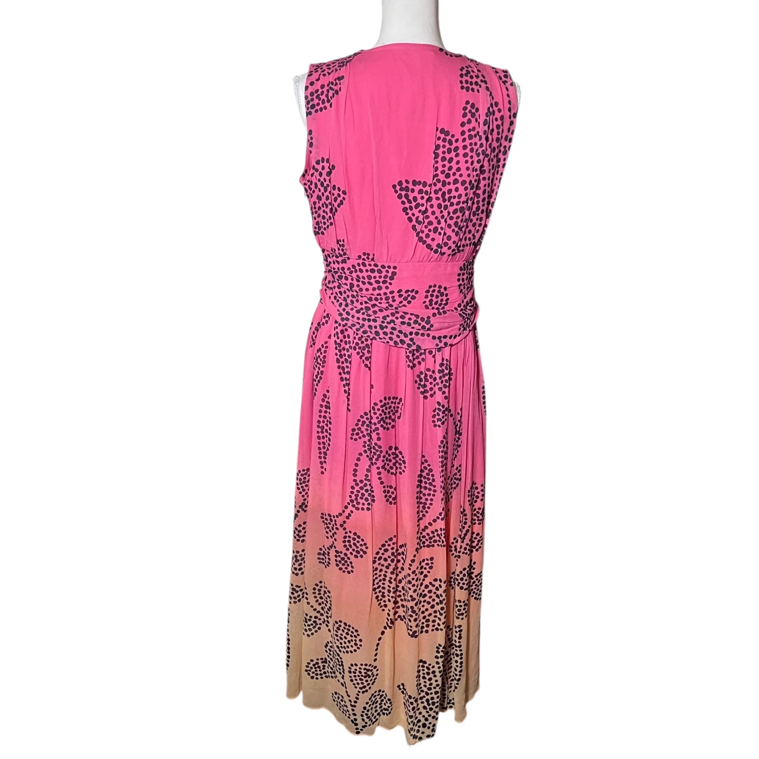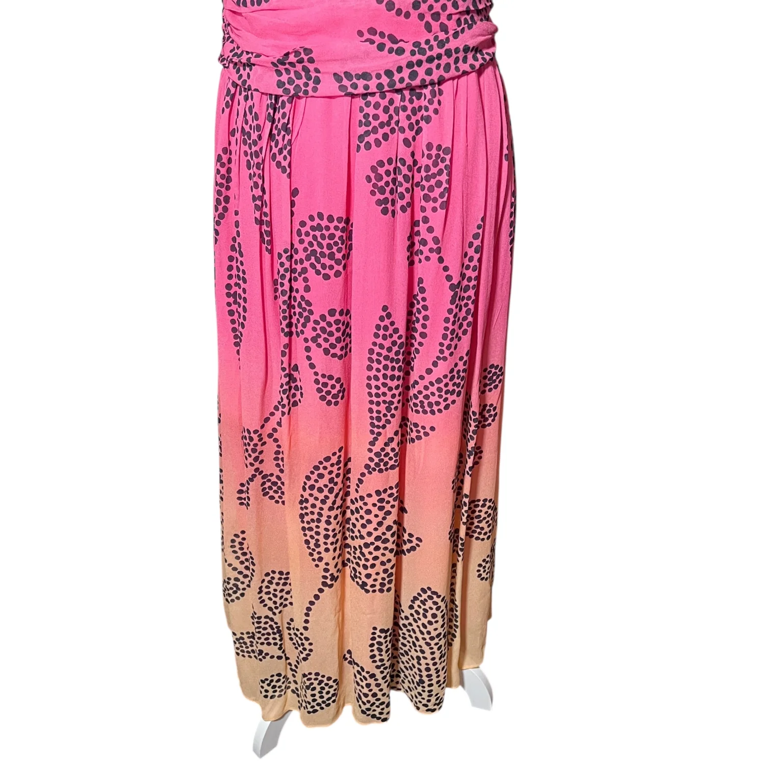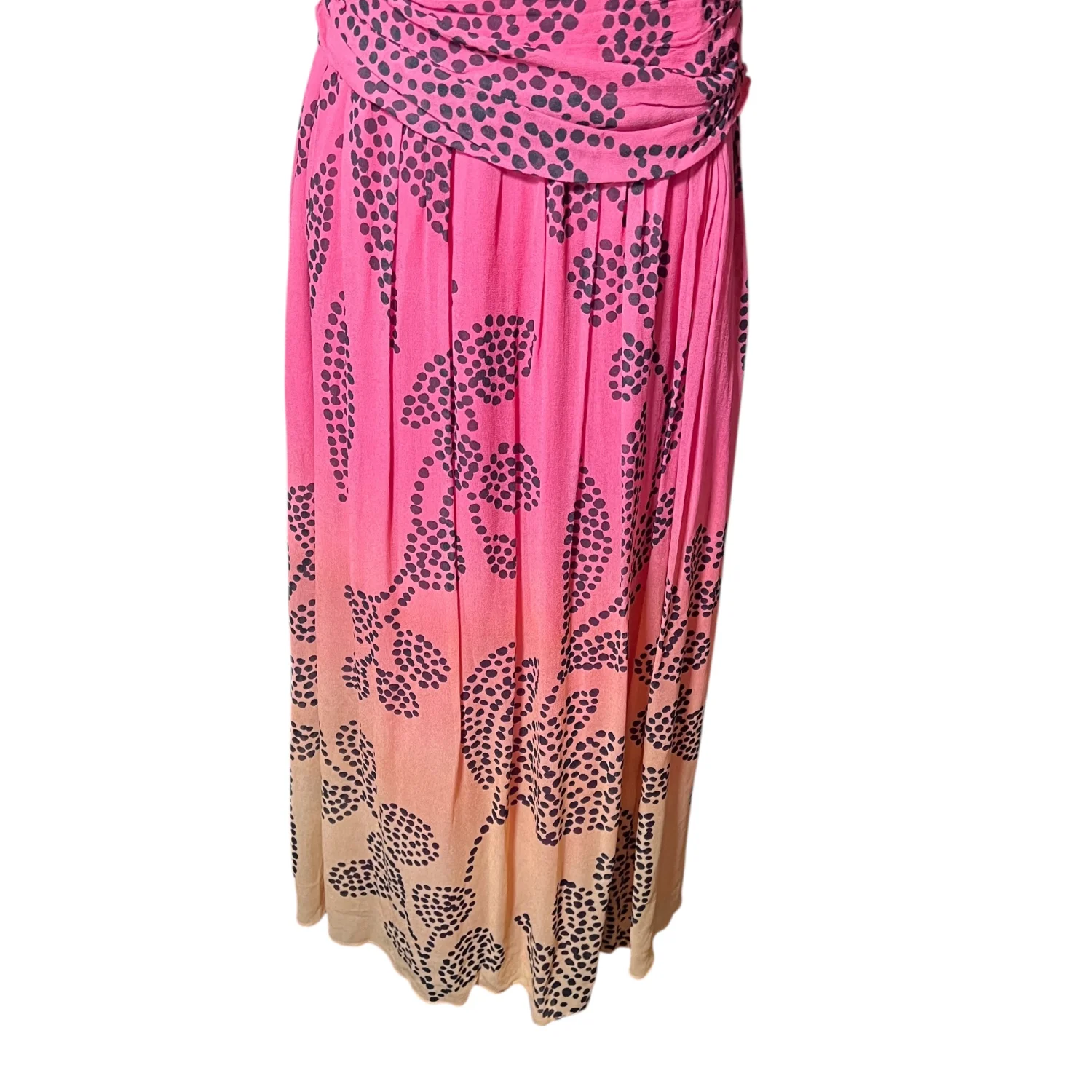 Verb by Pallavi Singhee maxi dress in a vibrant pink with a black that transitions to an ombre peach and cream. This sleeveless V-neck dress features a flattering ruched waistband and a flowing A-line skirt. The dress is perfect for a garden party, a sophisticated brunch, or a stylish evening out. Measurements while laying flat: • Bust: 17 in • Waist: 14 in • Length: 53.5 in Keywords: Verb, Pallavi Singhee, pink dress, polka dot, ombre, maxi dress, sleeveless, v-neck, ruched waist, flowy, garden party, brunch, evening, boho, chic
