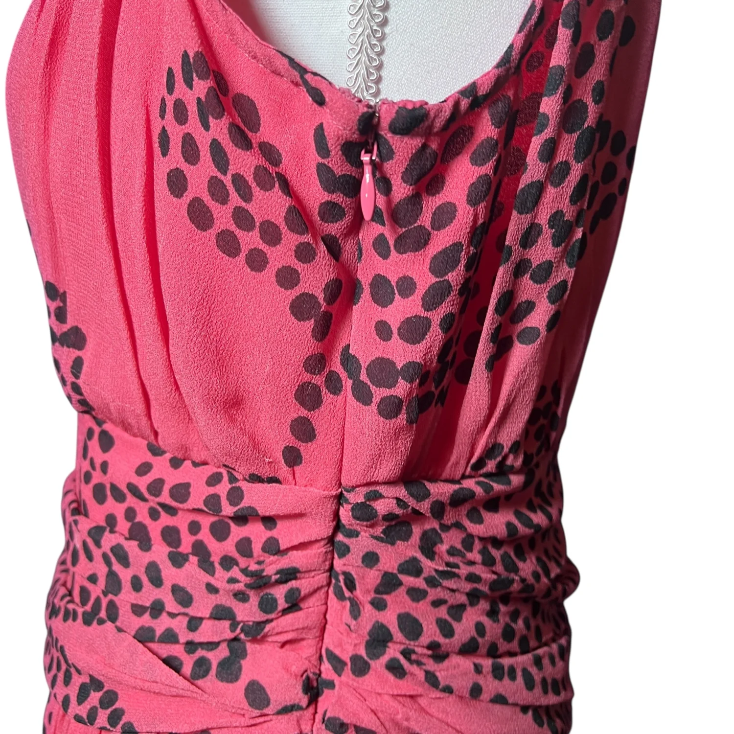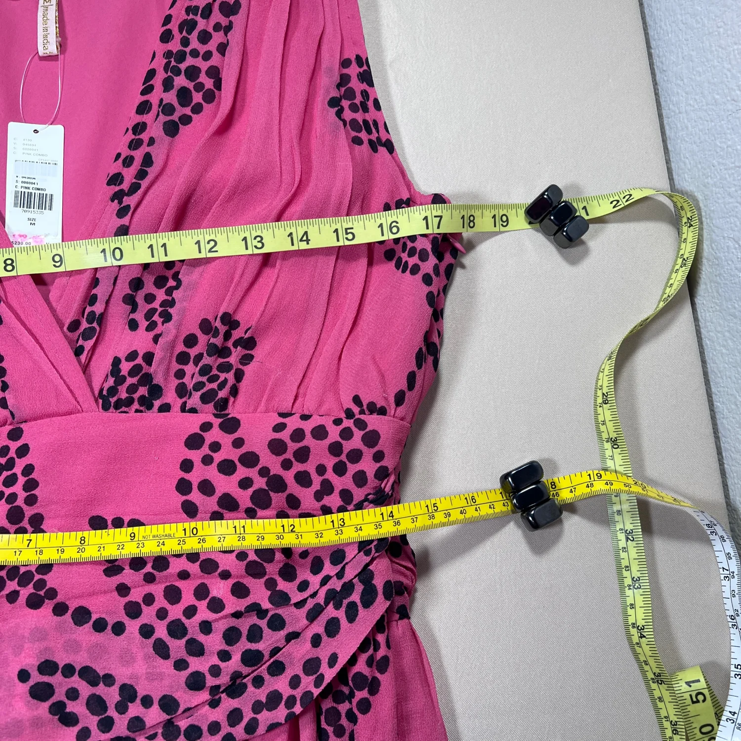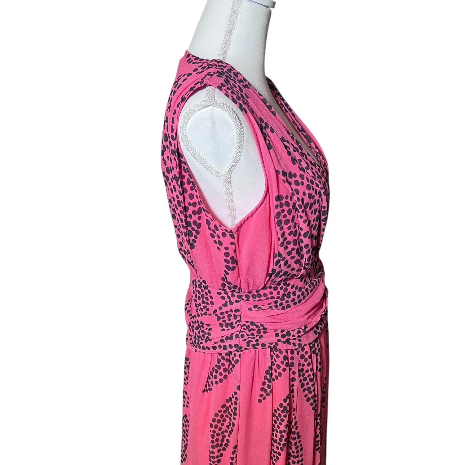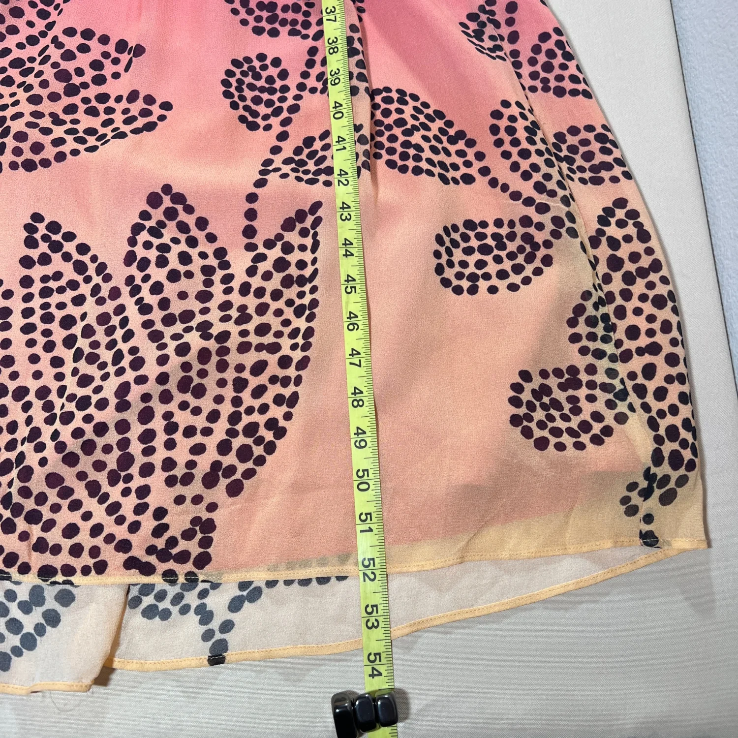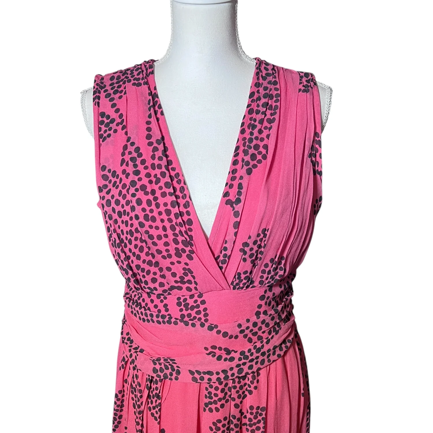 Verb by Pallavi Singhee maxi dress in a vibrant pink with a black that transitions to an ombre peach and cream. This sleeveless V-neck dress features a flattering ruched waistband and a flowing A-line skirt. The dress is perfect for a garden party, a sophisticated brunch, or a stylish evening out. Measurements while laying flat: • Bust: 17 in • Waist: 14 in • Length: 53.5 in Keywords: Verb, Pallavi Singhee, pink dress, polka dot, ombre, maxi dress, sleeveless, v-neck, ruched waist, flowy, garden party, brunch, evening, boho, chic