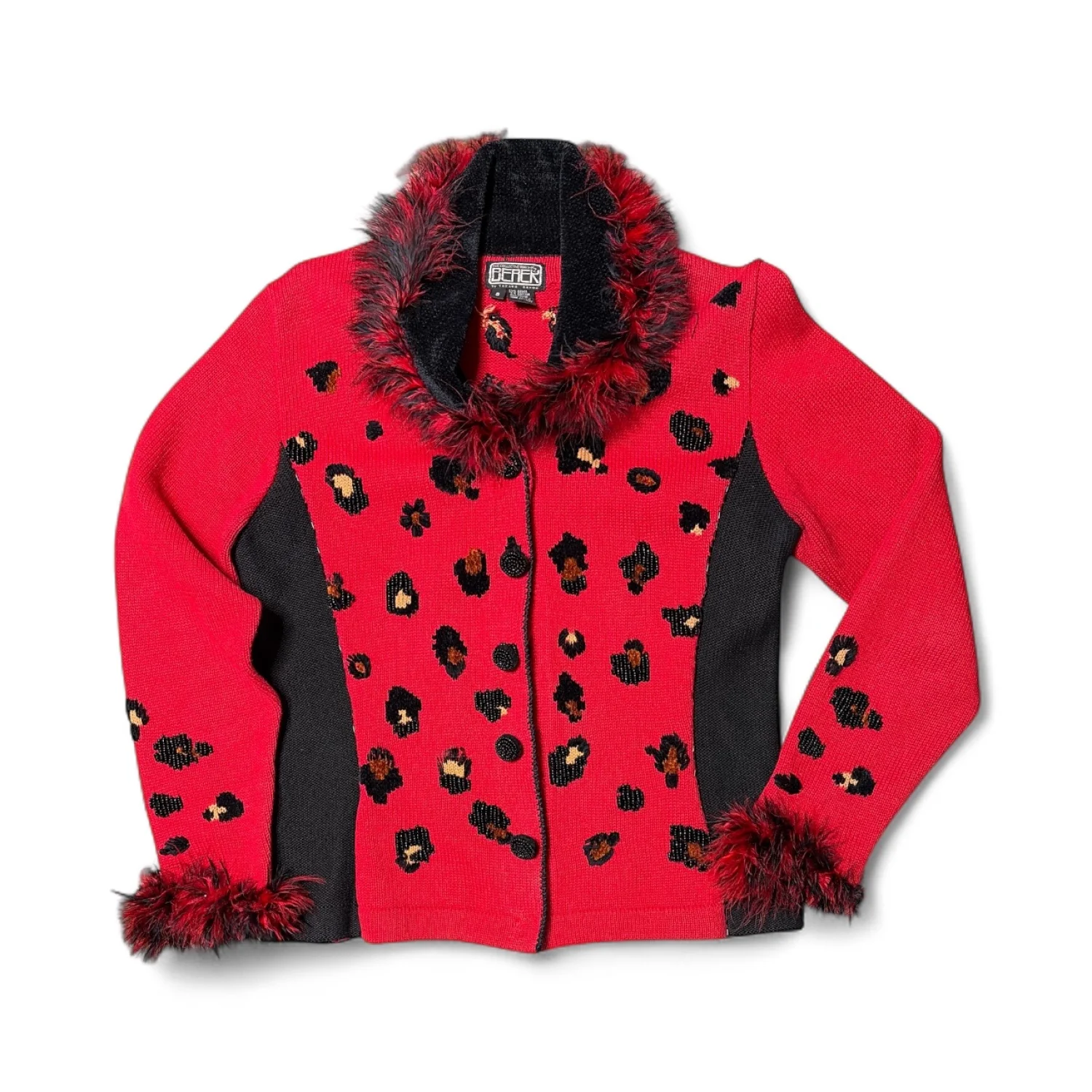 Berek Vintage Animal Print Red Cardigan Furry Accents size Small