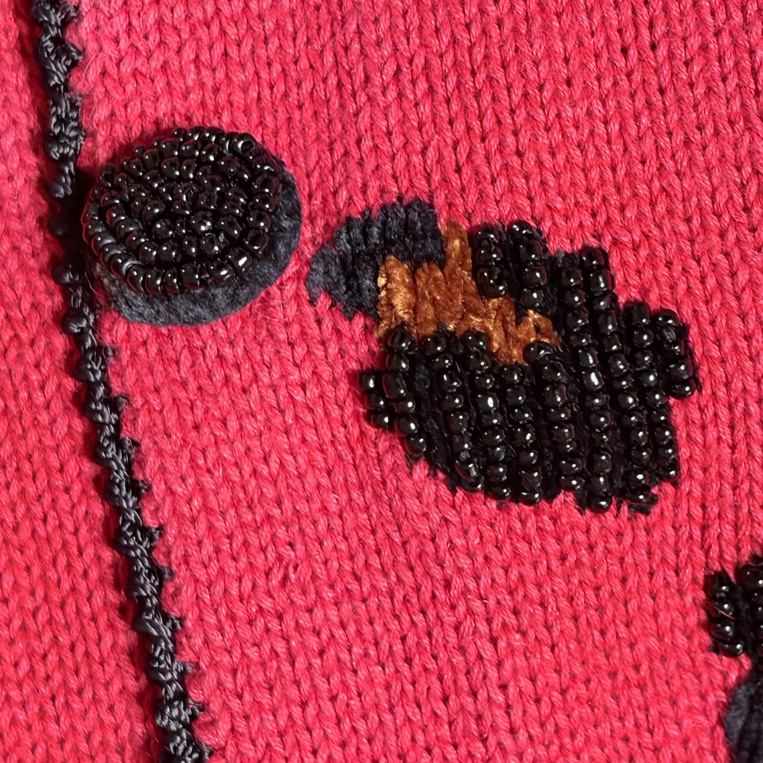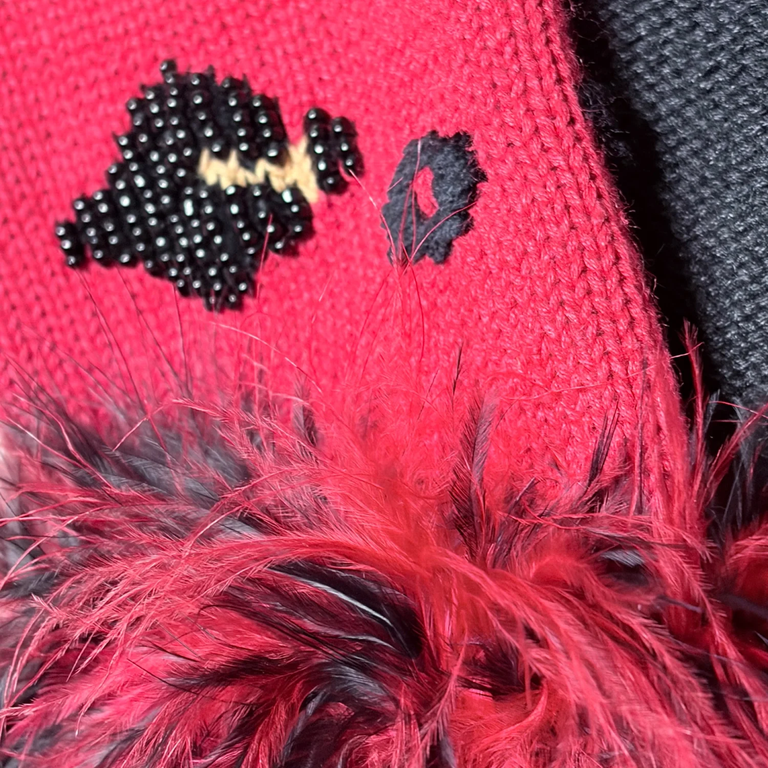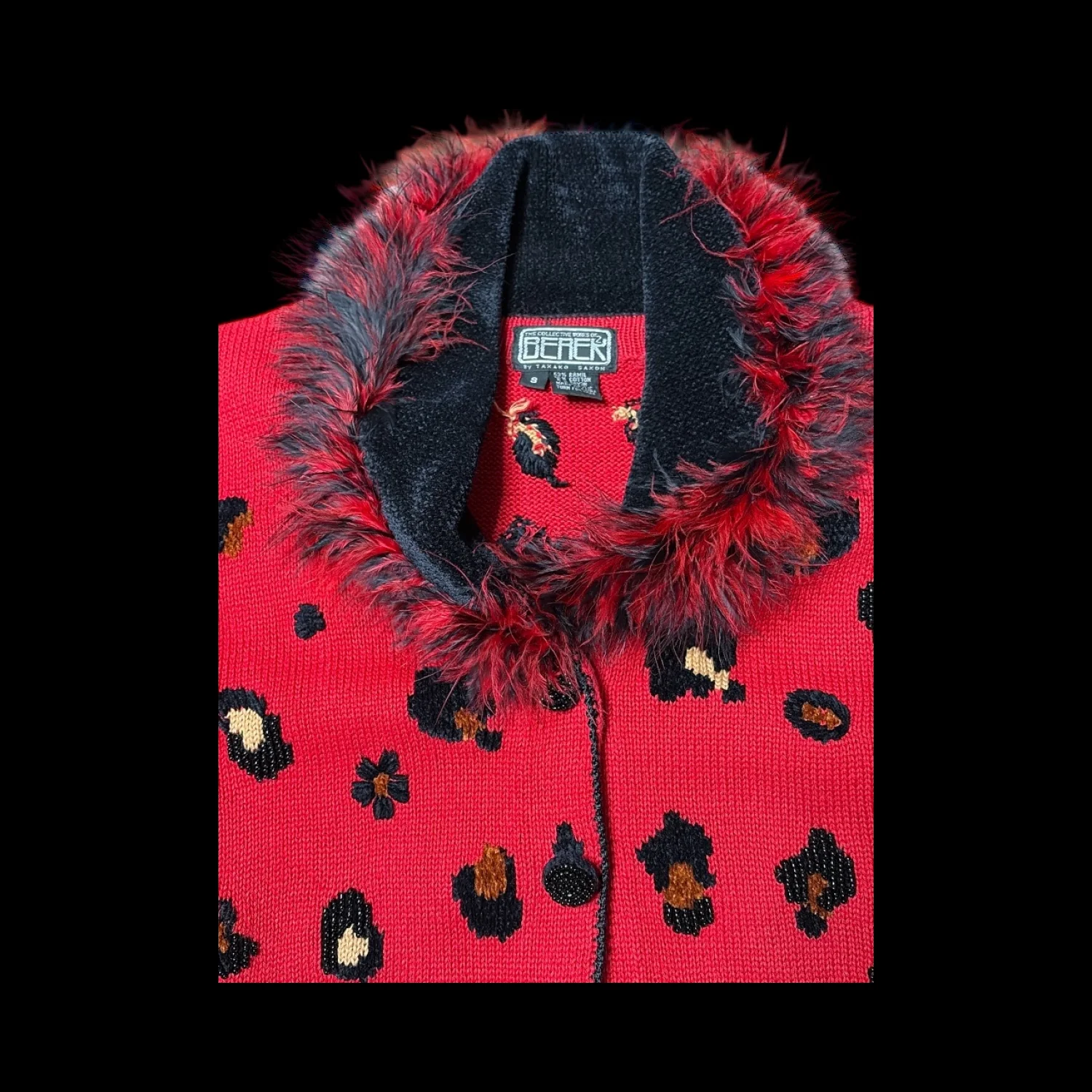 Berek Vintage Animal Print Red Cardigan Furry Accents Length: 24" Chest: 36" Waist: 30" Sleeve: 25" Shoulder: 32" Ramie/cotton/rayon/acrylic knit blend Beaded accents, faux fur trim, beaded button front, color blocking panels Velvet black collar signature Berek statement design Double button placet, beaded buttons on the exterior/ flat functional buttons inside for closure Great preloved condition size Small Turn heads with this bold and glamorous vintage Berek cardigan sweater featuring a striking red and leopard print knit design. Known for their statement pieces, Berek's vintage sweaters combine playful patterns, beaded embellishments, and luxurious details that make every outfit stand out. Vintage glam, animal print, 90s, beading, feathery faux fur, statement, wearable art, bold, maximalist