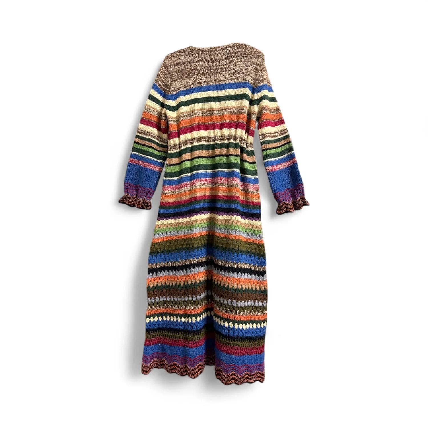 Relais, sold at Anthropologie, multi-color mixed knit Cardigan Sweater is a stunning addition to any wardrobe, featuring a long, duster-style silhouette that extends past the knees. This open-front cardigan showcases a vibrant pattern of a myriad color stripes, crafted from a soft knit material. Its long sleeves and flared hem add a touch of elegance, making it perfect for both casual and formal occasions. Soft scallop hem and sleeve cuffs Pull string laced around the waist cinch and tie closure Has seen minimal light wear- rare piling here and there 30% wool and 70% acrylic, hand knit. size Large bohemian country, cottagecore, knit duster, warm, cozy, comfy, dazzling, hand-knit, transitional, striped, vintage