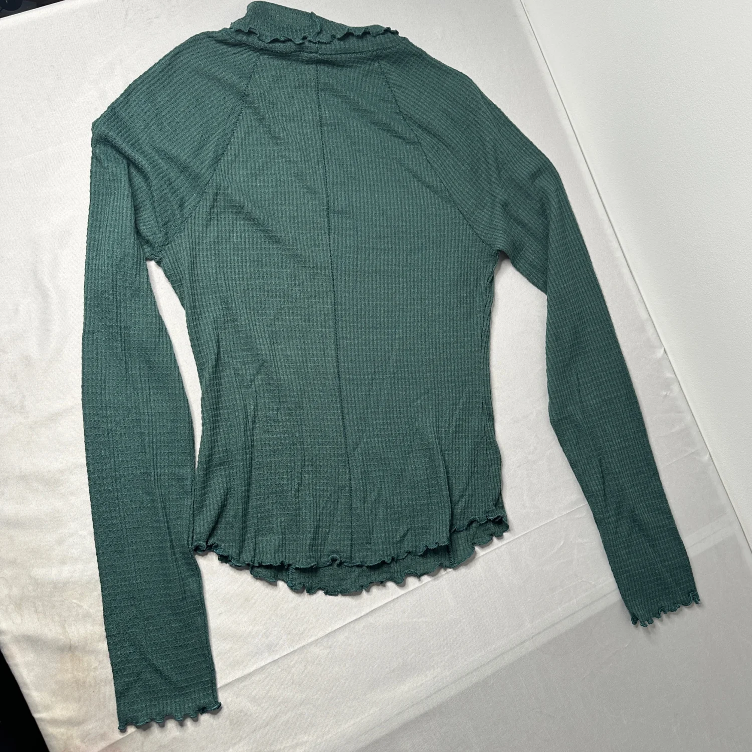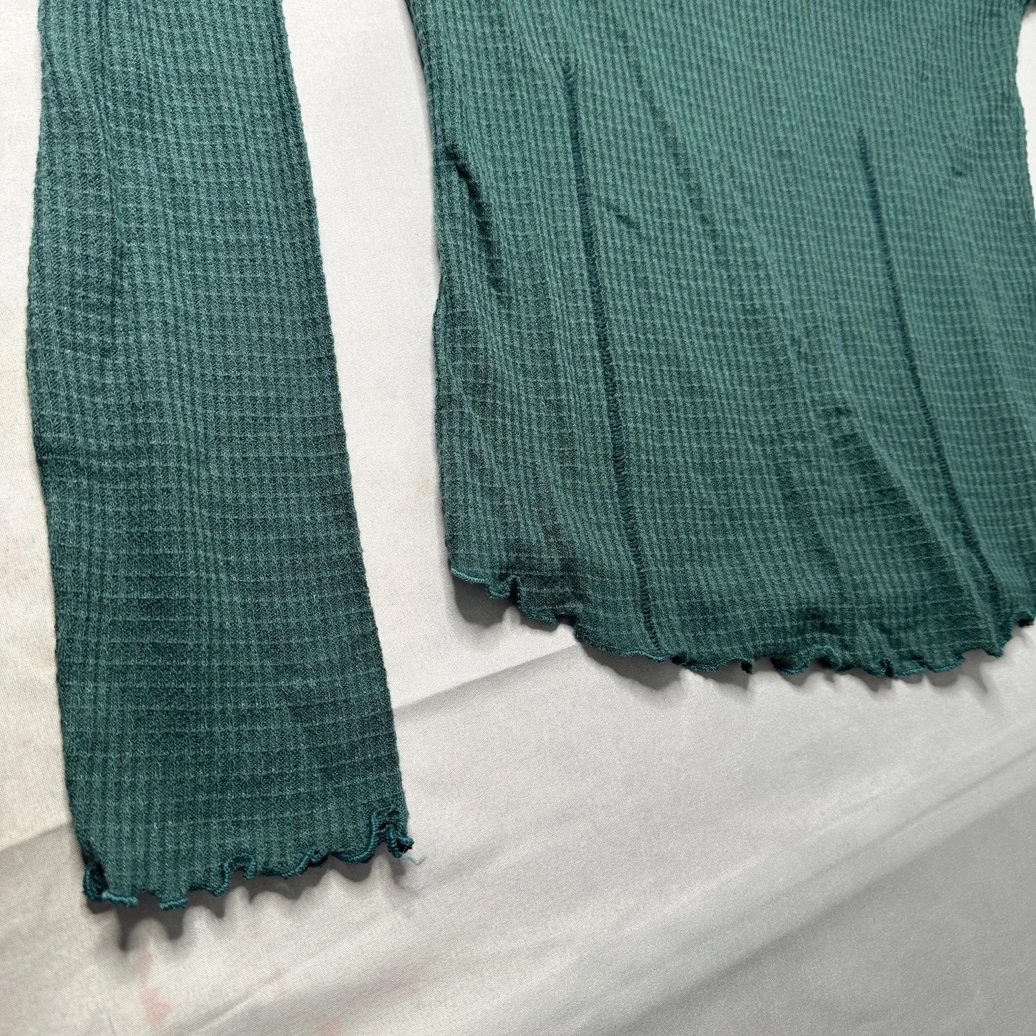 Soft, cozy, and effortlessly cute Free People Intimately thermal in a dreamy washed teal green 💚 Lightweight waffle knit with tons of stretch, featuring a relaxed turtleneck, raglan sleeves, and delicate lettuce edge trim at the hem, cuffs, and neckline for that feminine, lived-in vibe. Perfect for layering under slip dresses, oversized jackets, or wearing on its own for an easy everyday look. ✨ Super soft + stretchy ✨ Flattering fitted silhouette ✨ Signature FP thermal texture Size: Small Condition: See photos