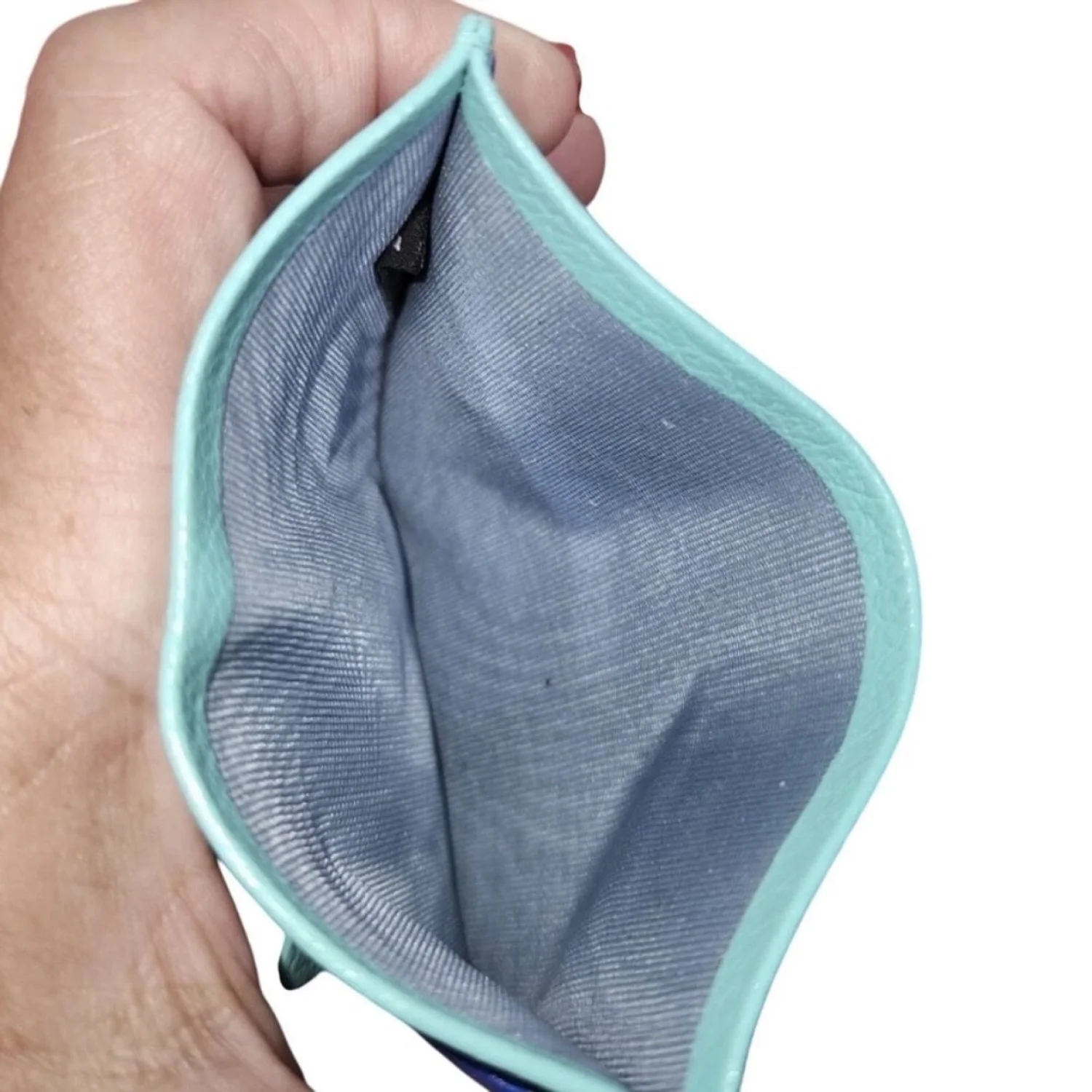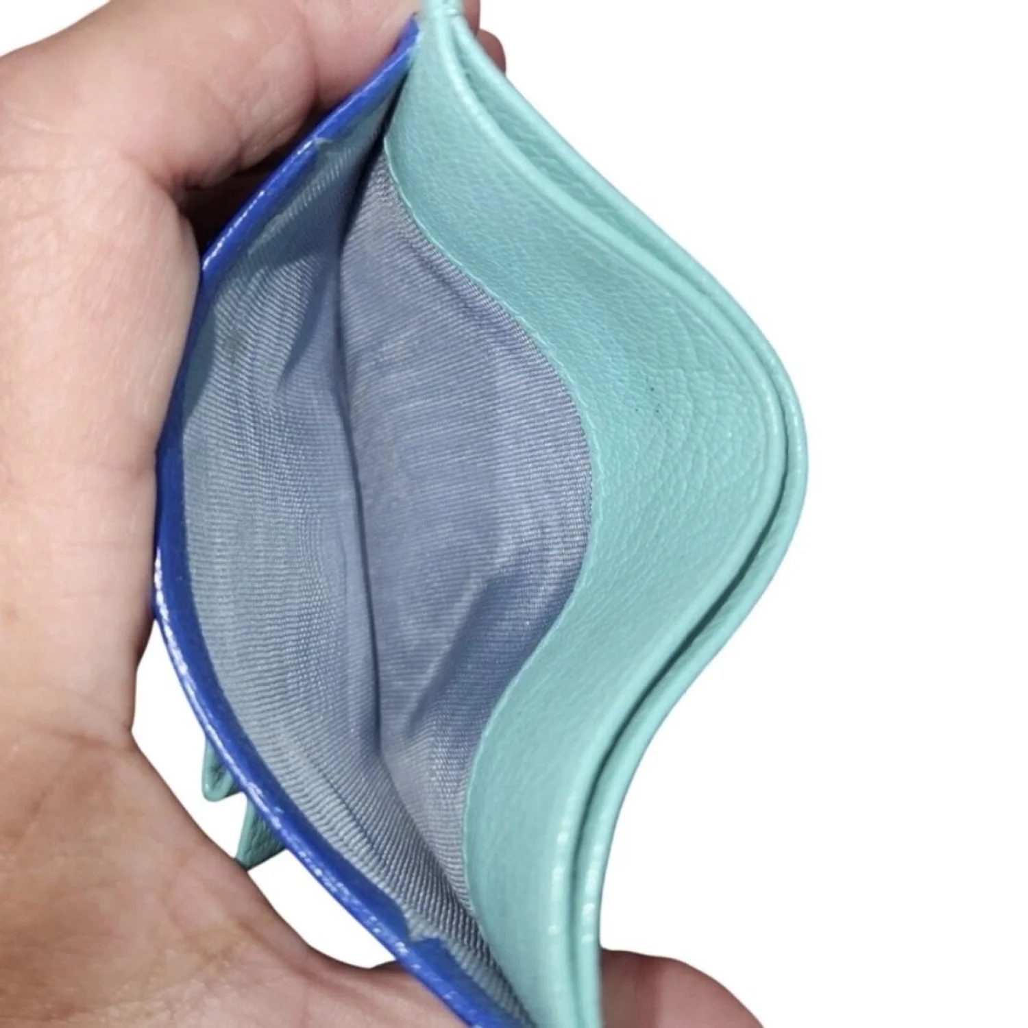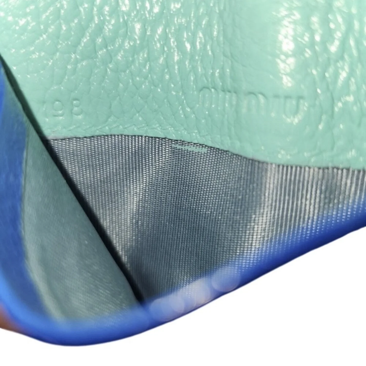 Authentic Miu Miu leather card case / slim wallet in a striking blue and aqua two-tone pebbled leather, finished with the signature bow detail and gold logo. A compact, lightweight piece perfect for cards or a minimalist carry. Condition details: • Exterior leather is in very good condition with vibrant color • Interior shows a small area of cosmetic touch-up / repaint near one seam (see close-up photos) • No structural damage, no peeling • Stitching intact and fully functional Please review all photos carefully, especially the interior, as they are part of the description. Details • Brand: Miu Miu • Material: Pebbled leather • Color: Blue / Aqua • Style: Card case / slim wallet • Logo: Gold-tone “miu miu” • Made in Italy