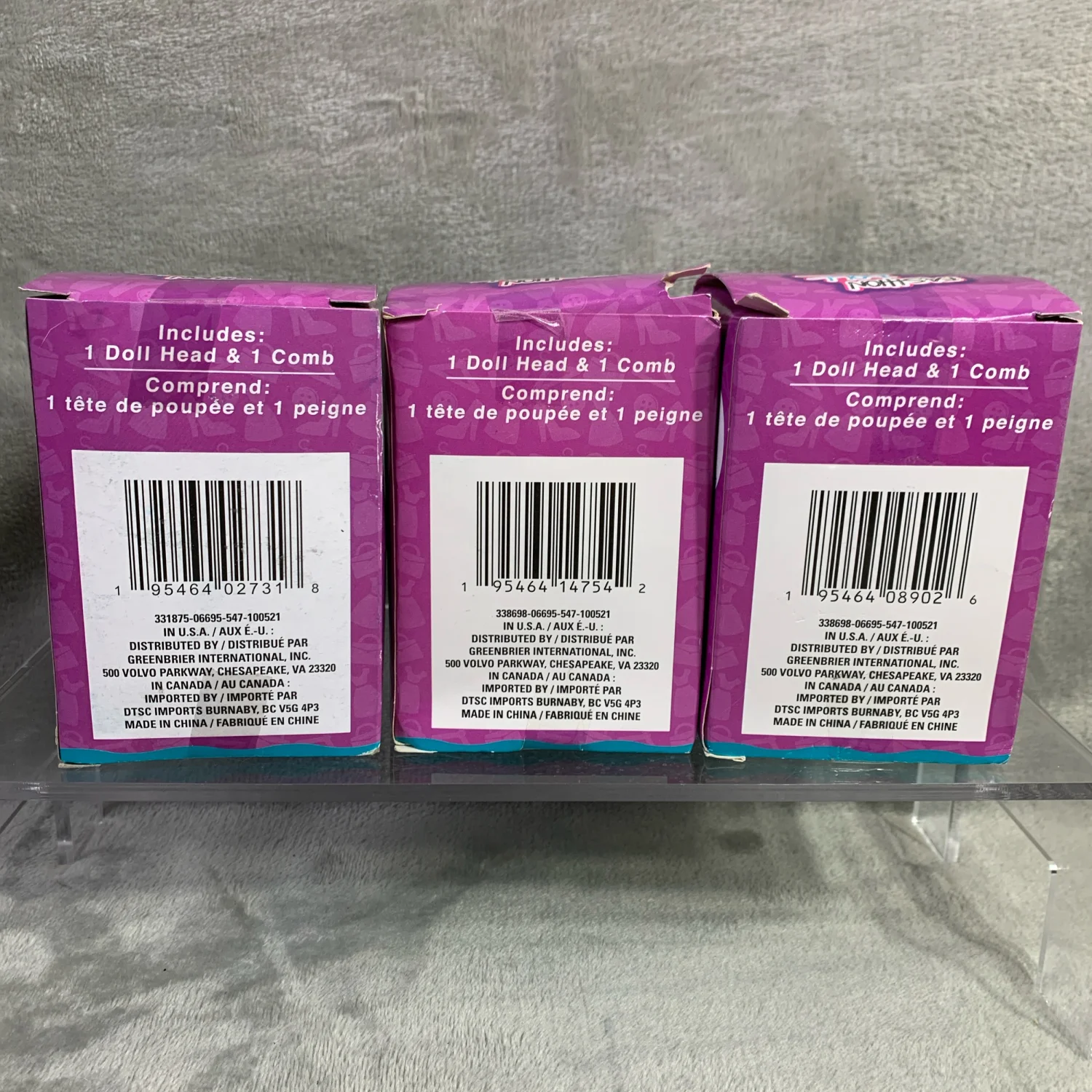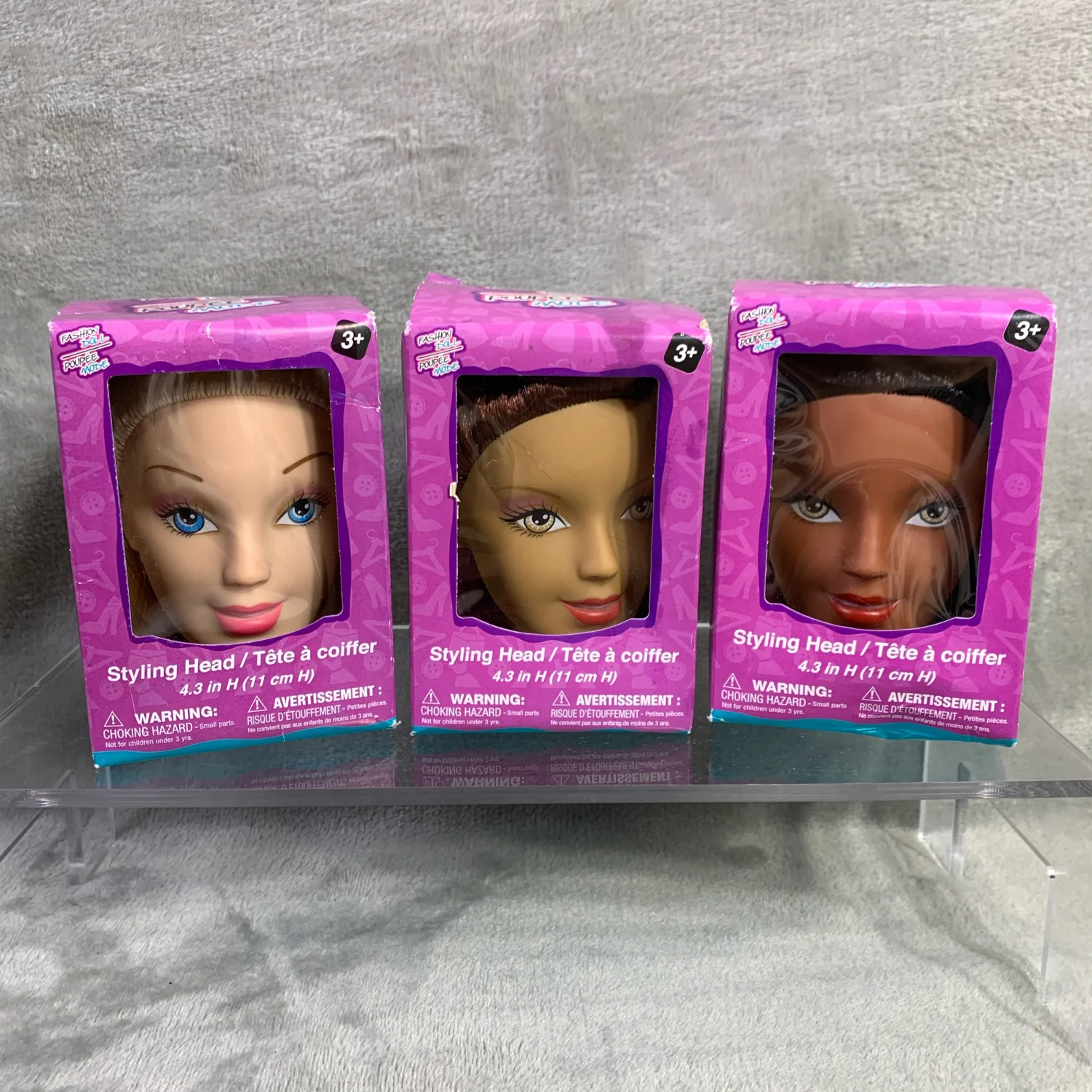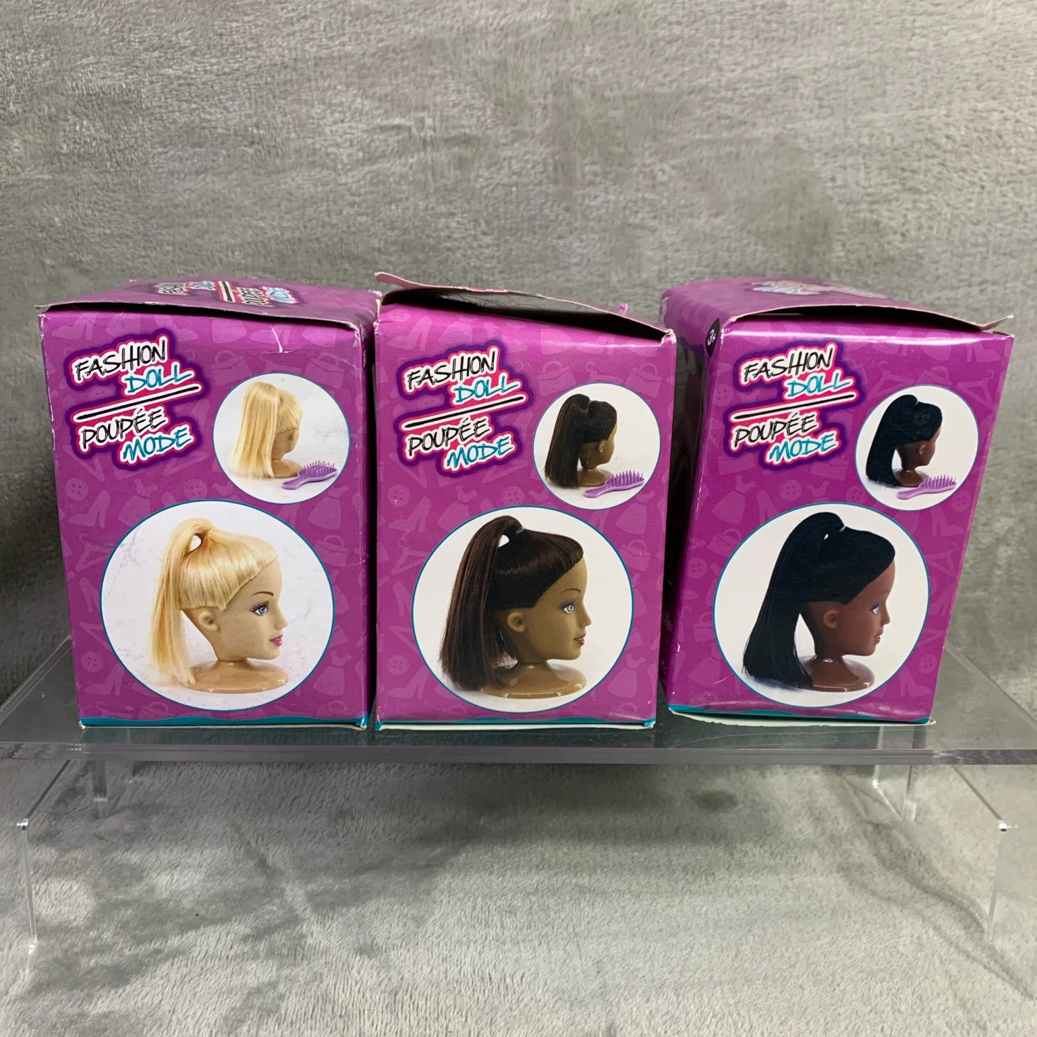 Set includes 3 styling doll heads with combs. Light skin with blonde hair and blue eyes Tan skin with brown hair and eyes Dark skin with black hair and brown eyes Boxes are imperfect. Never been opened.