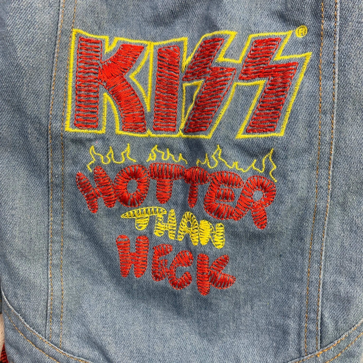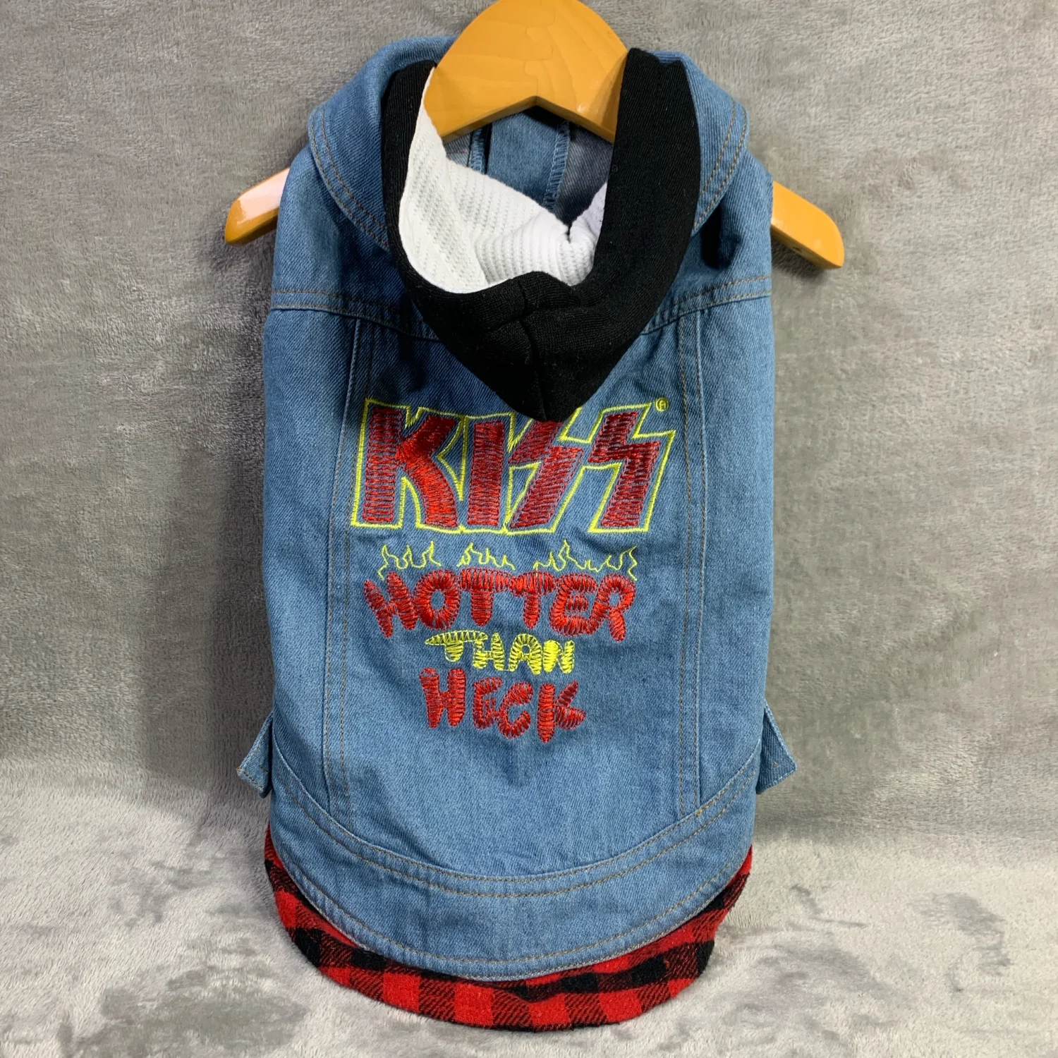 Denim vest embroidered with KISS Hotter Than Heck on back. Black hood. Metal button closure. Red and black plaid trim. Tag Sz: M