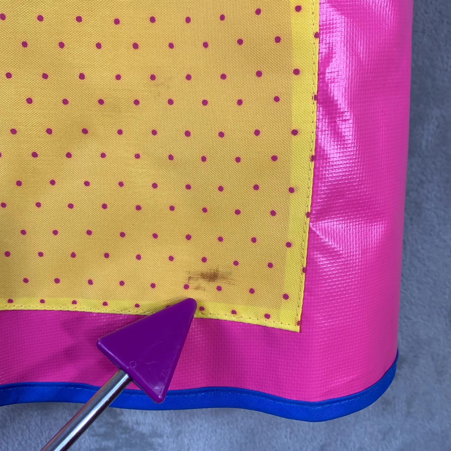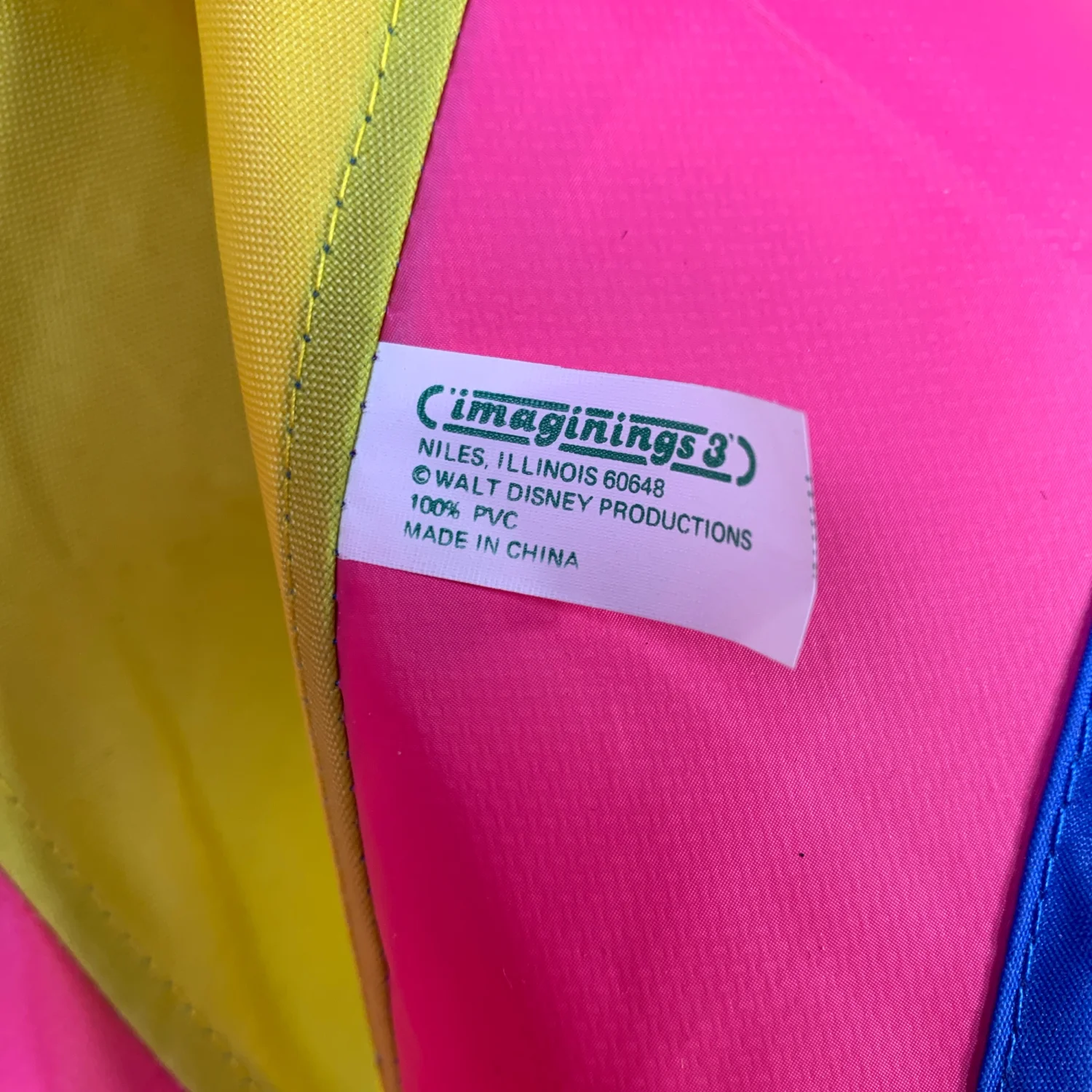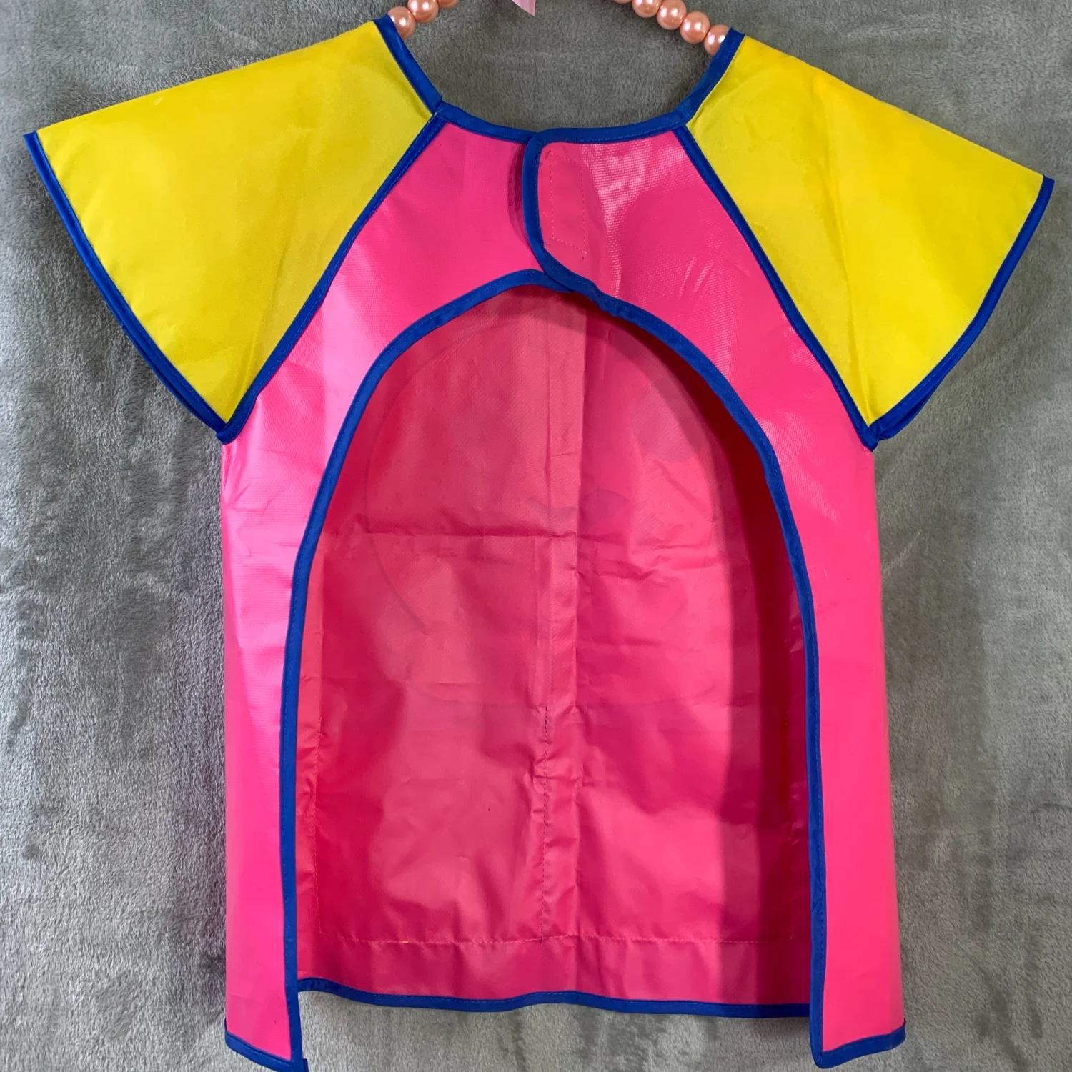 100% PVC. Hook and loop back closure. Bright pink with yellow sleeves and blue trim. 2 front pockets. Measurements approximate inches Chest: 28 Length: 20 Discoloration on pocket. Graphic imperfections. Please view all photos. Kids crafts, art, painting, kidcore, crafty, cooking, dress up, playing