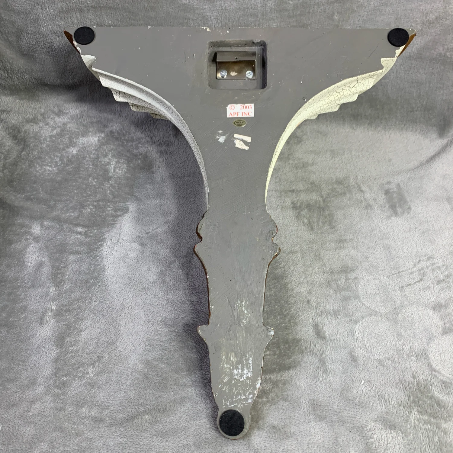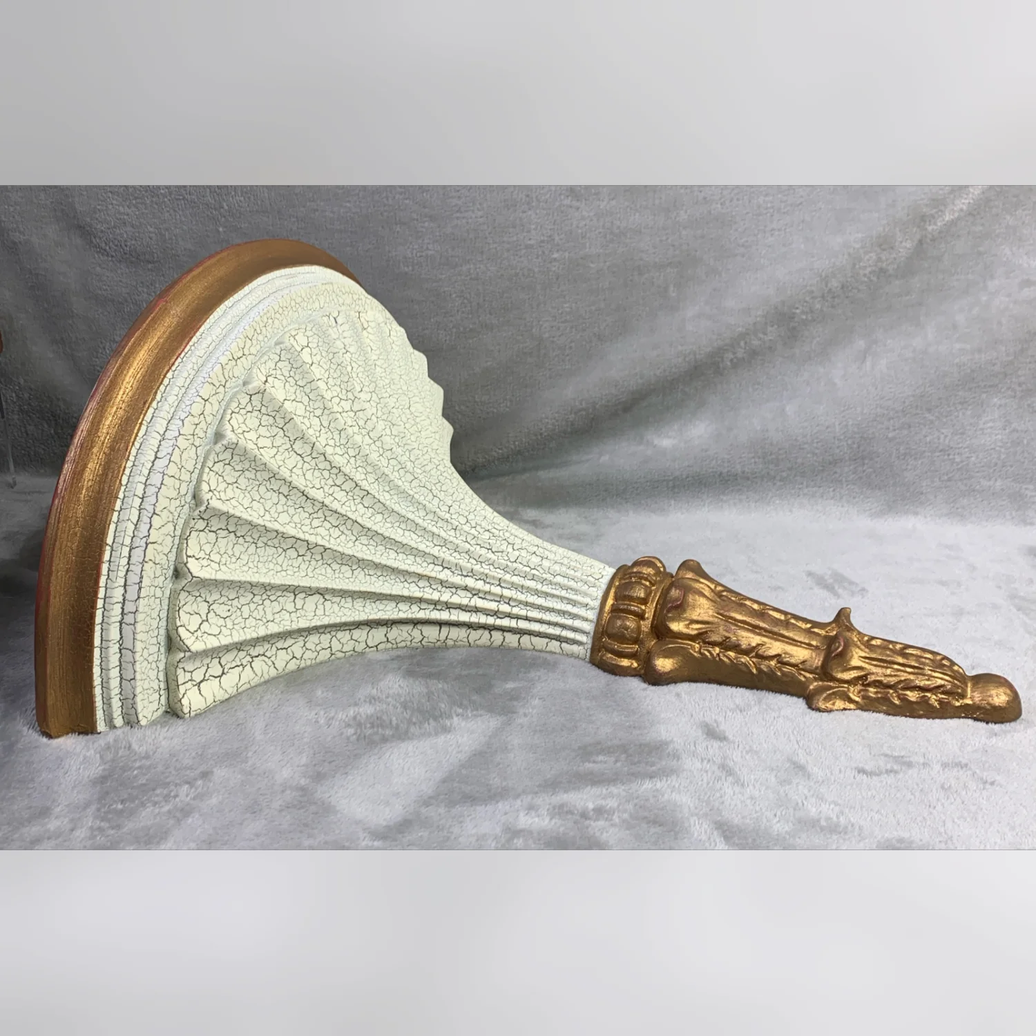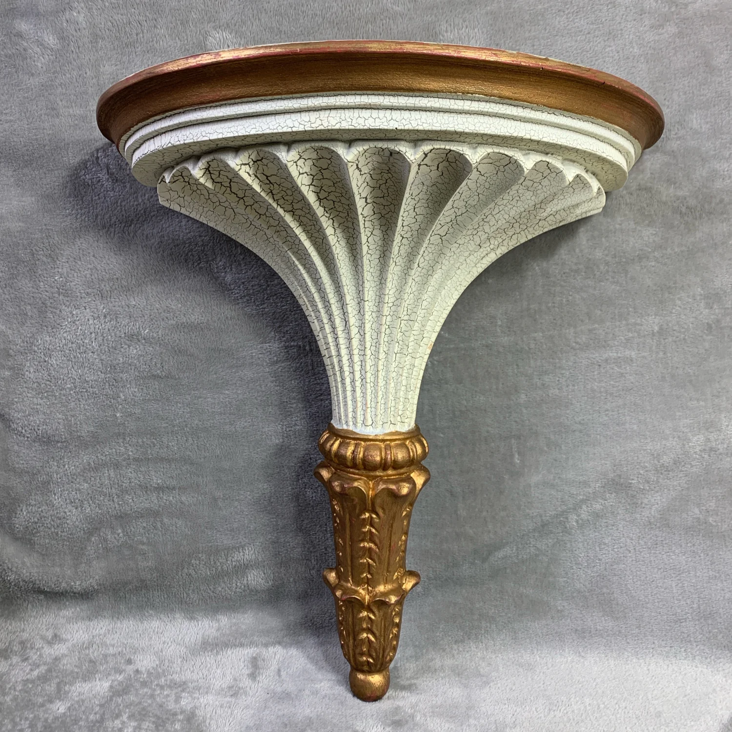 2003 resin wall shelf. Crackled off white with ornate gold tone accents. Weighs 3 lbs. Measurements in photos. Signs of wear on back. Overall good condition.