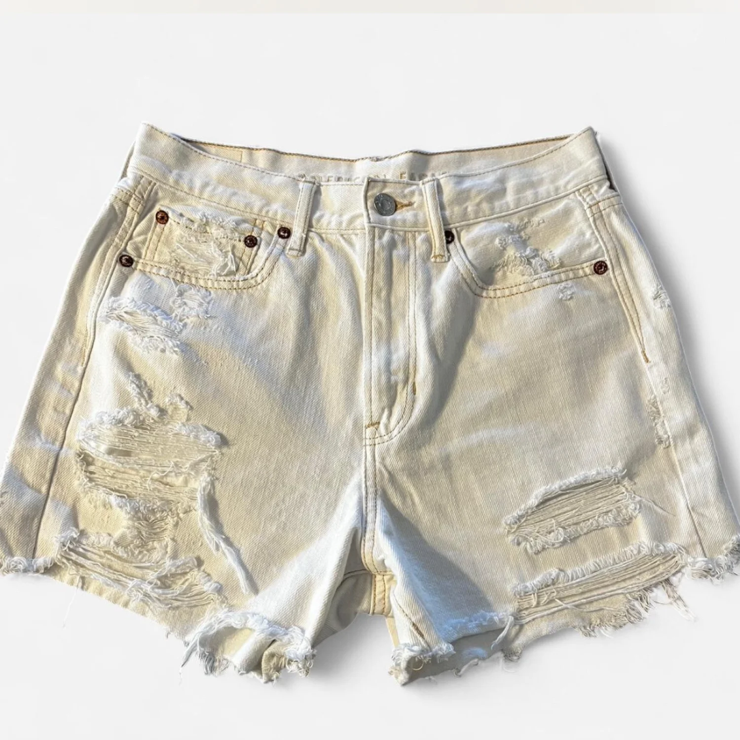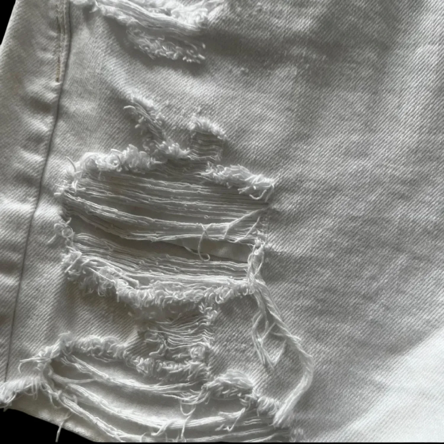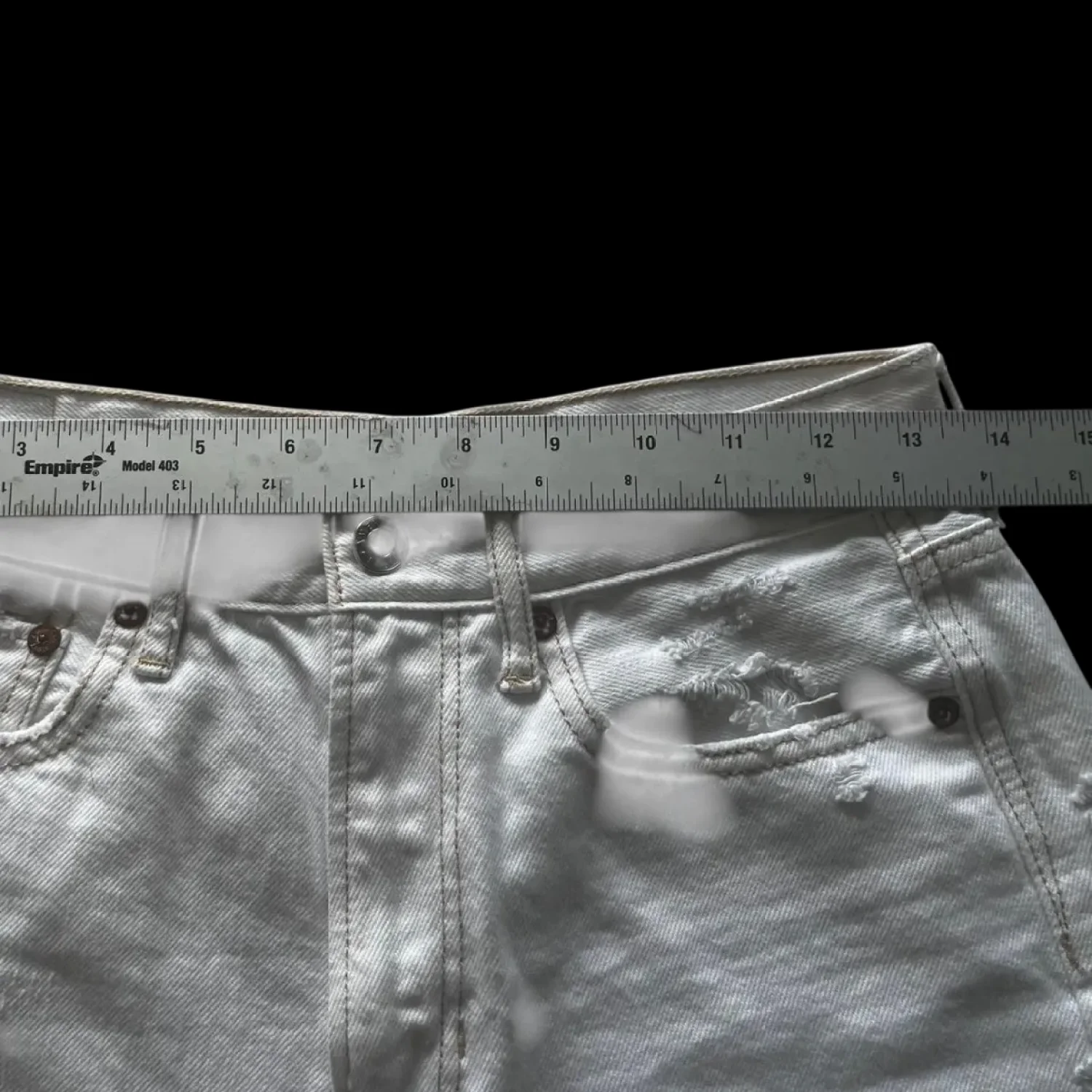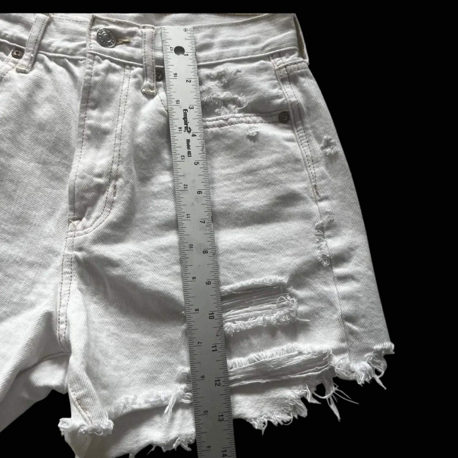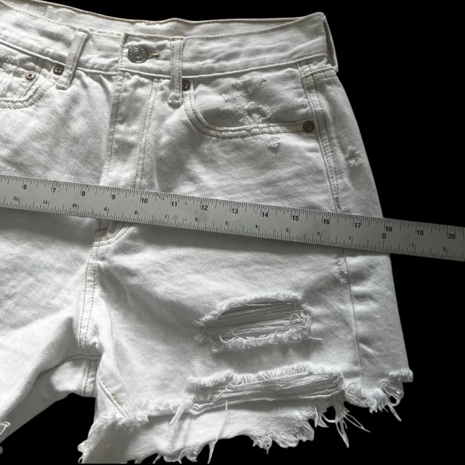 Festival-ready high-rise denim shorts in bleached white with heavy distressing and frayed hem. ⨠Details: ⢠Tag: American Eagle ⢠Size: Small ⢠Approx. waist: 13.5ā flat ⢠Approx. rise: 11ā ⢠Ripped front, raw hem, soft broken-in cotton denim ⢠Classic 5-pocket style, zip fly Perfect for summer streetwear, Y2K outfits, or pairing with graphic tees and boots. š¦ Bundle available š« Smoke-free home