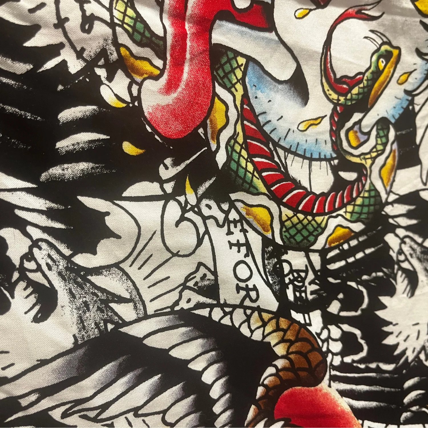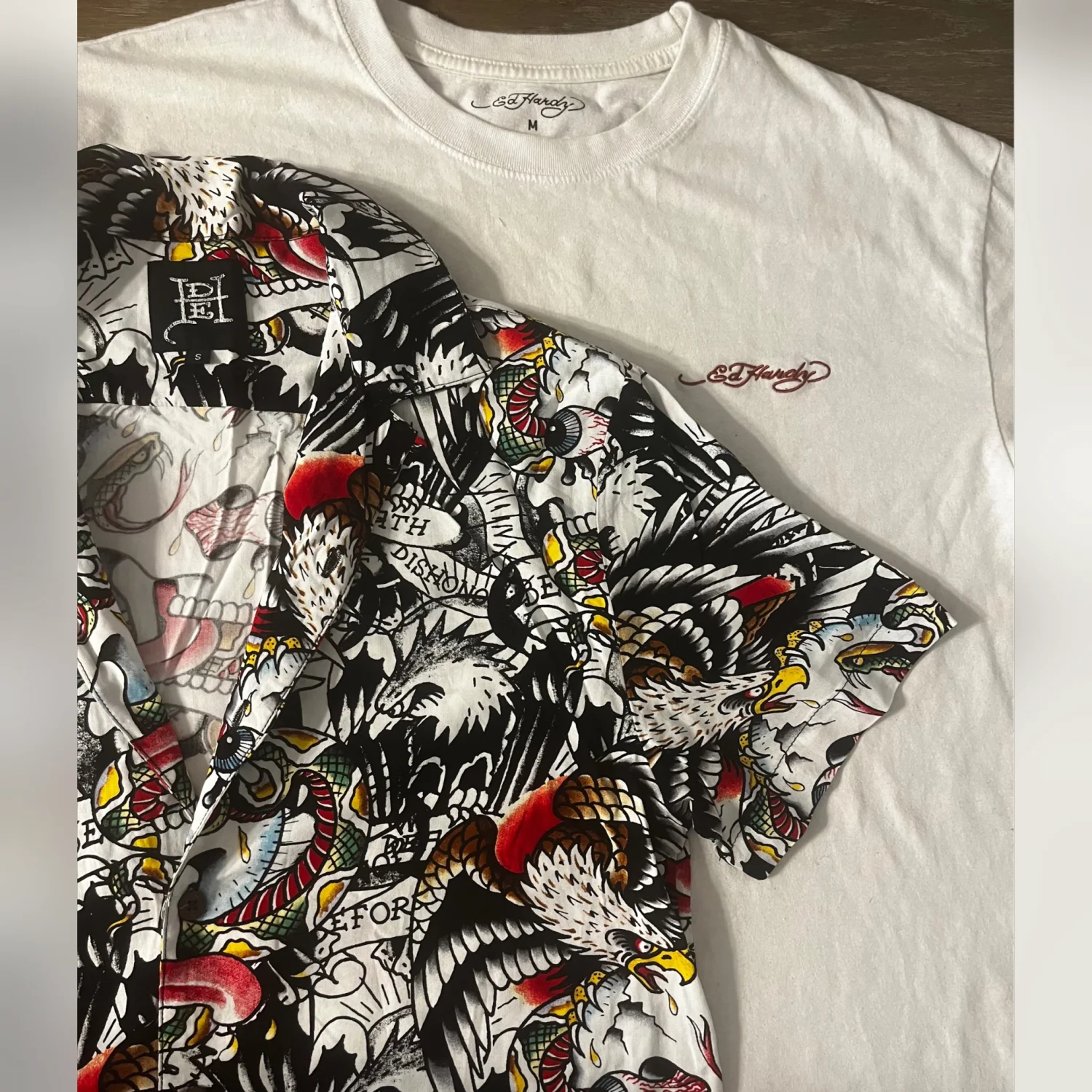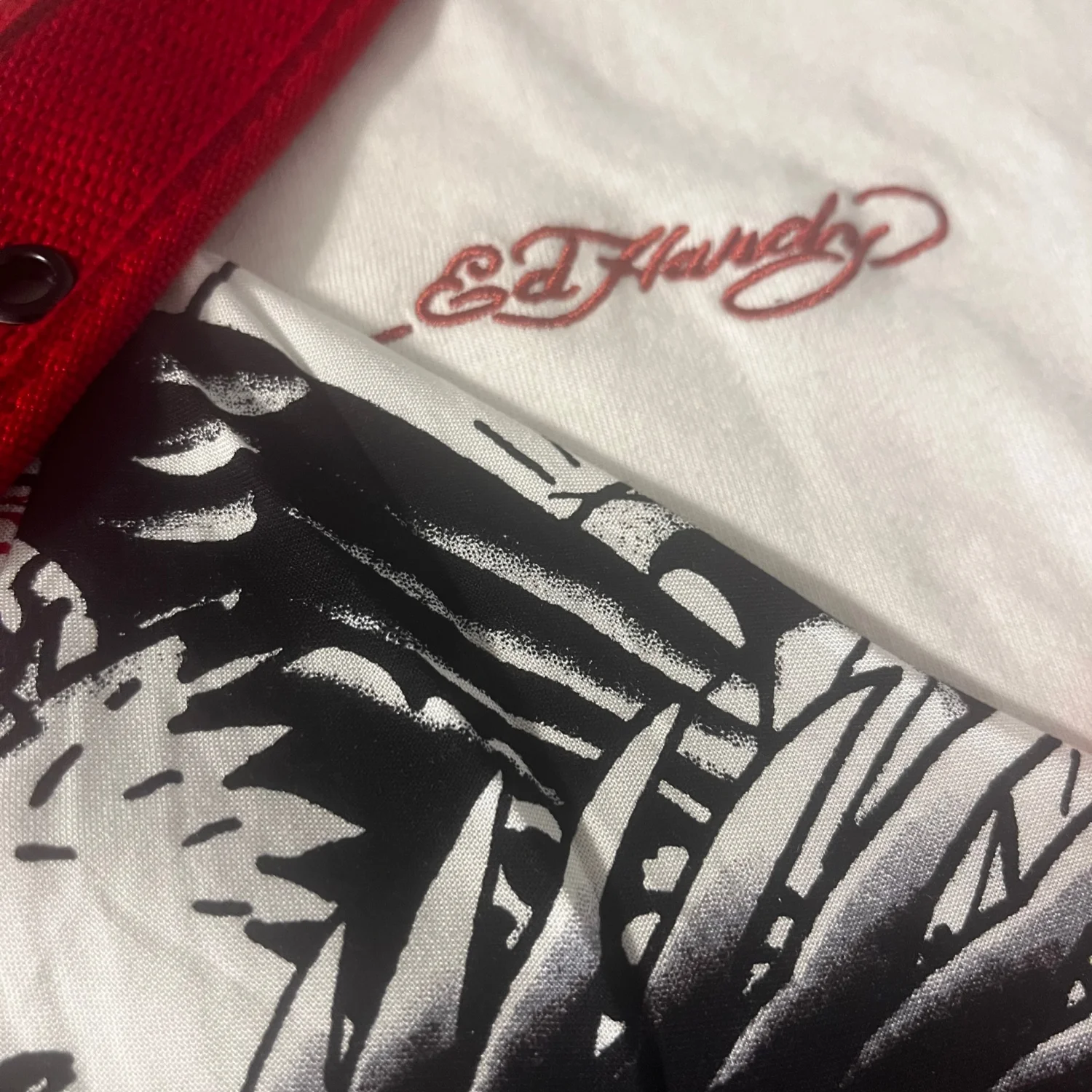 This set includes an Ed Hardy graphic print short-sleeve shirt and a classic white Ed Hardy t-shirt, along with a vibrant red belt. The short-sleeve shirt features a striking black and white graphic design with pops of red, yellow, and other colors, embodying the bold tattoo-inspired style Ed Hardy is known for. The white t-shirt is simple yet distinctive, with the Ed Hardy logo embroidered on the chest. This set is perfect for lovers of streetwear and tattoo art. #EdHardy #Streetwear #TattooArt