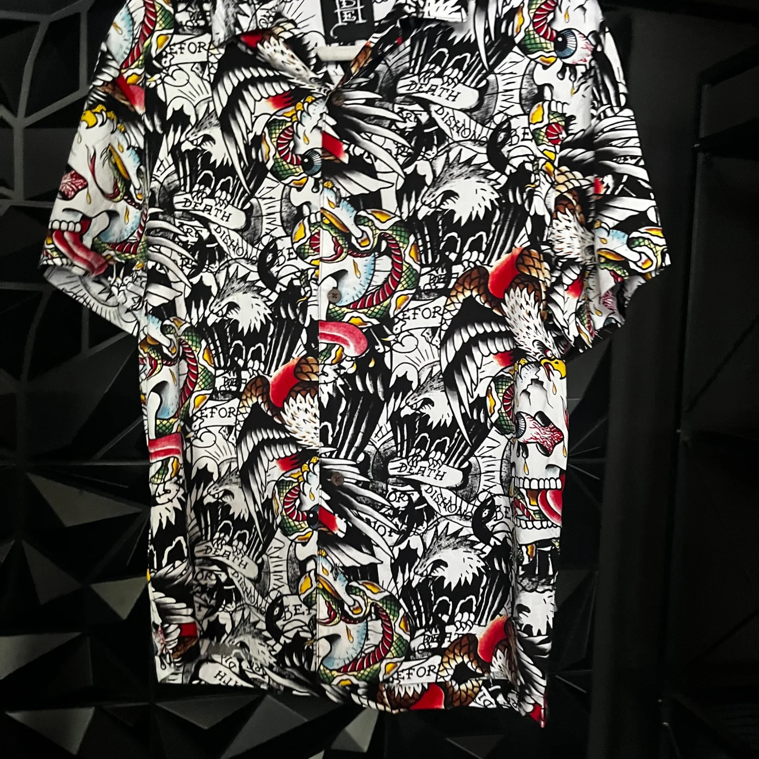 This vibrant button-up shirt features a bold tattoo-style graphic design with eagles, snakes, and 'Death Before Dishonor' motifs. Made from lightweight and breathable fabric, it's perfect for making a statement. Ideal for casual outings. #tattooart #graphicshirt #edhardy
