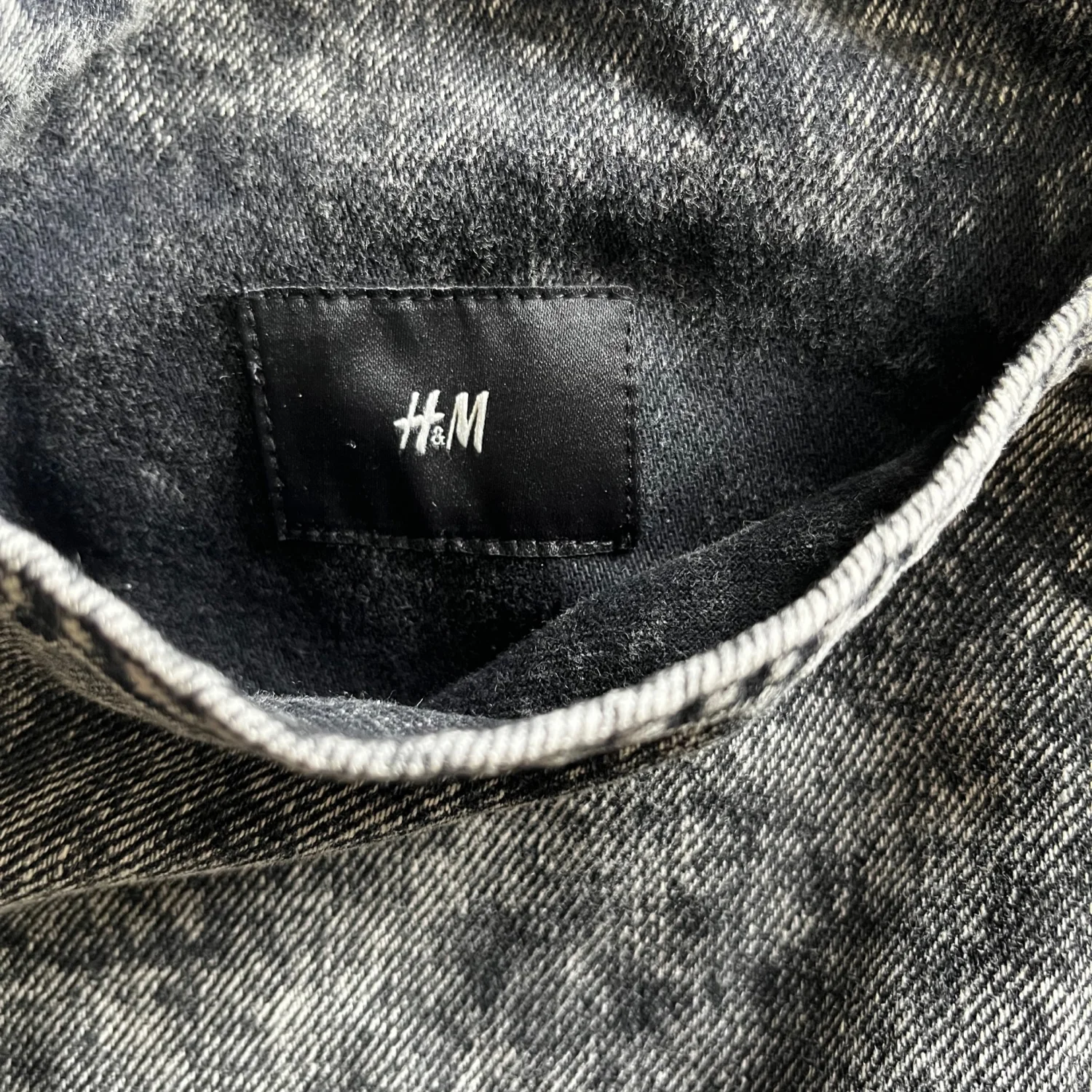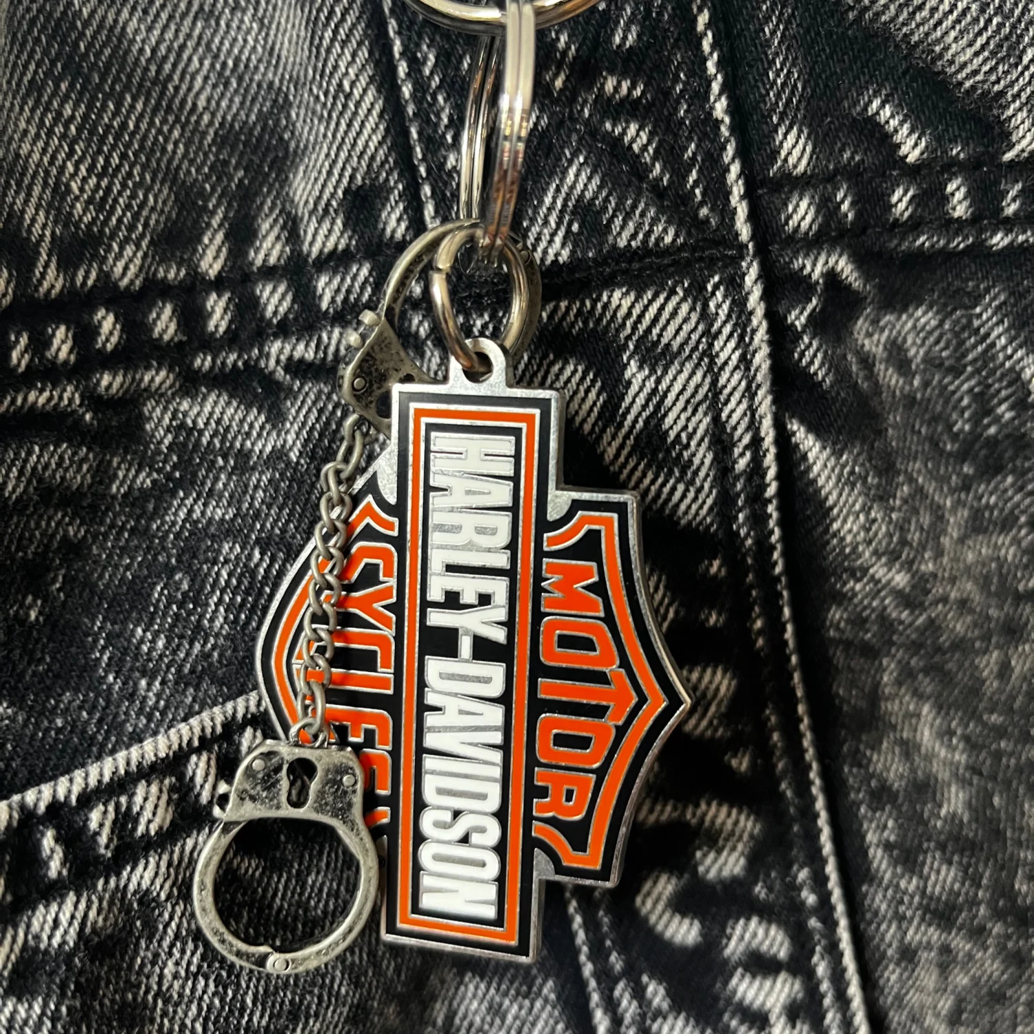This stylish black denim tote bag from H&M features a unique acid-wash design. It has a spacious interior with a sturdy double-handle, perfect for daily use or casual outings. The bag is adorned with a Harley-Davidson keychain for a touch of biker flair. Ideal for carrying essentials with style. #casual #denim #tote