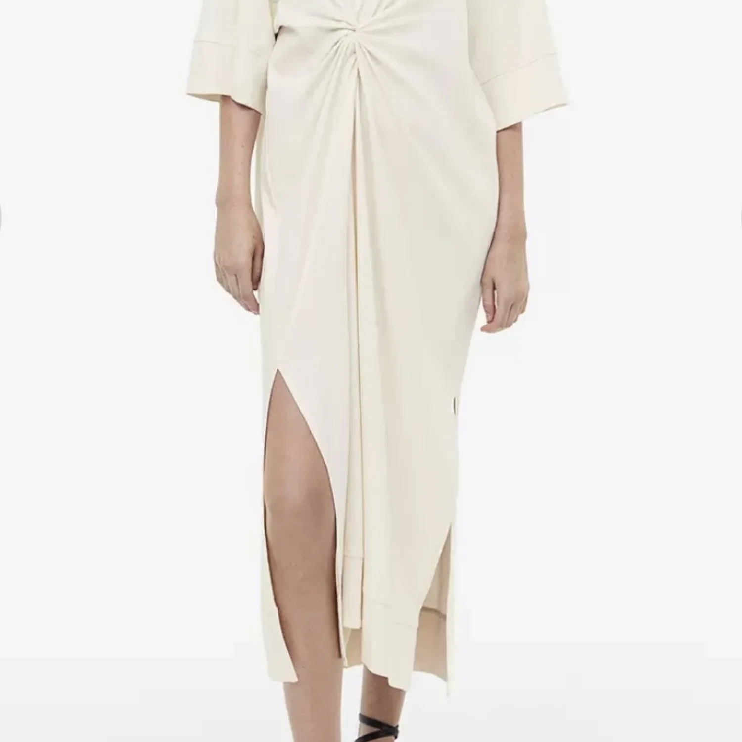 Effortlessly minimal and modern šæ This soft cotton-blend midi dress by H&M features a front twist detail for subtle shape, a clean crew neckline, and oversized sleeves. Perfect for everyday wear, minimalist wardrobes, or travel-ready style. ⨠Details: ⢠Brand: H&M ⢠Condition: Brand New ⢠Size: [Add Size Here] ⢠Color: Cream / Off-White ⢠Features: āā Front twist knot detail āā Soft stretch jersey āā Elbow-length sleeves āā Side slit for movement āā Midi length š§ŗ Style it with sandals for warm days or layer with boots & a coat for a neutralcore look