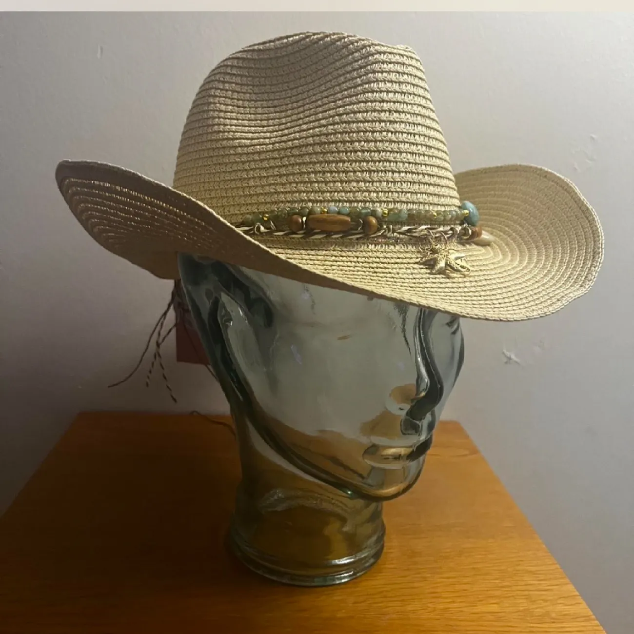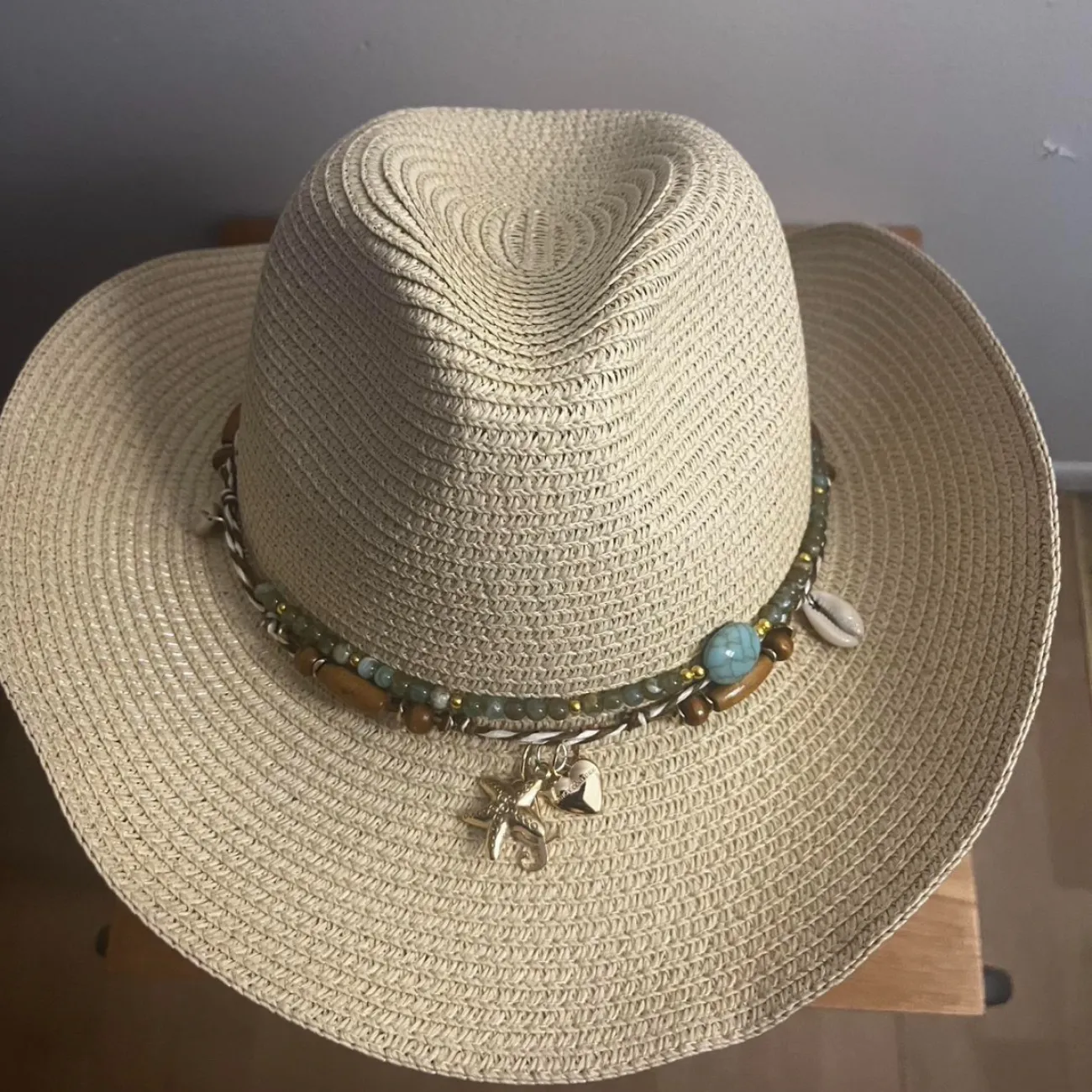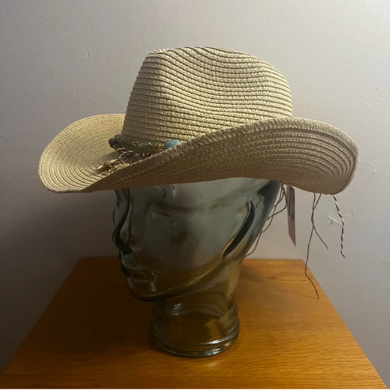 This Juicy Couture straw cowboy hat is perfect for outdoor adventures or adding a touch of Western style to your outfit. It features a decorative band with beads and charms, enhancing its unique look. Made from quality straw material, it's lightweight and comfortable for sunny days. One size fits most. #JuicyCouture #WesternStyle #CowboyHat