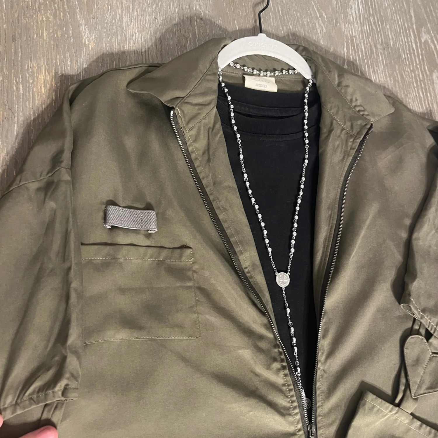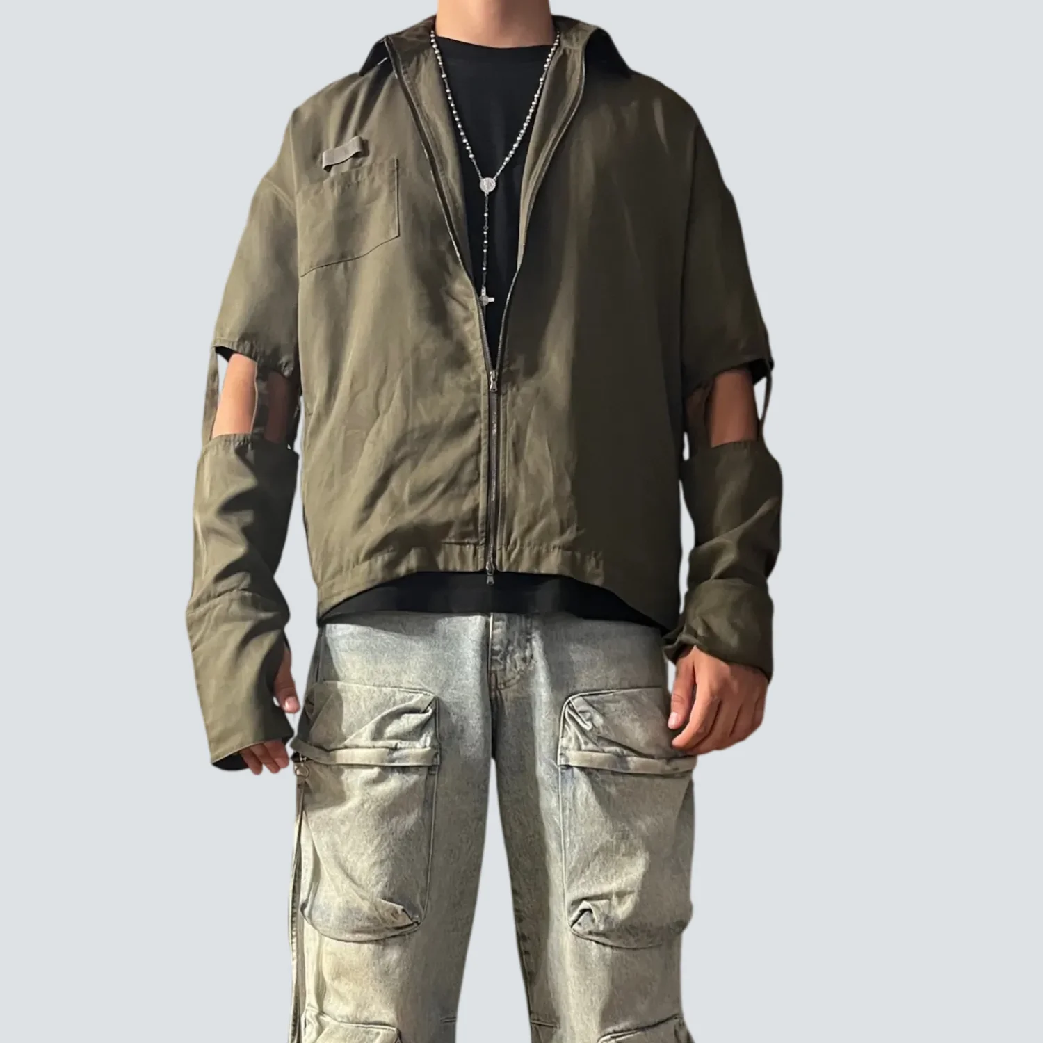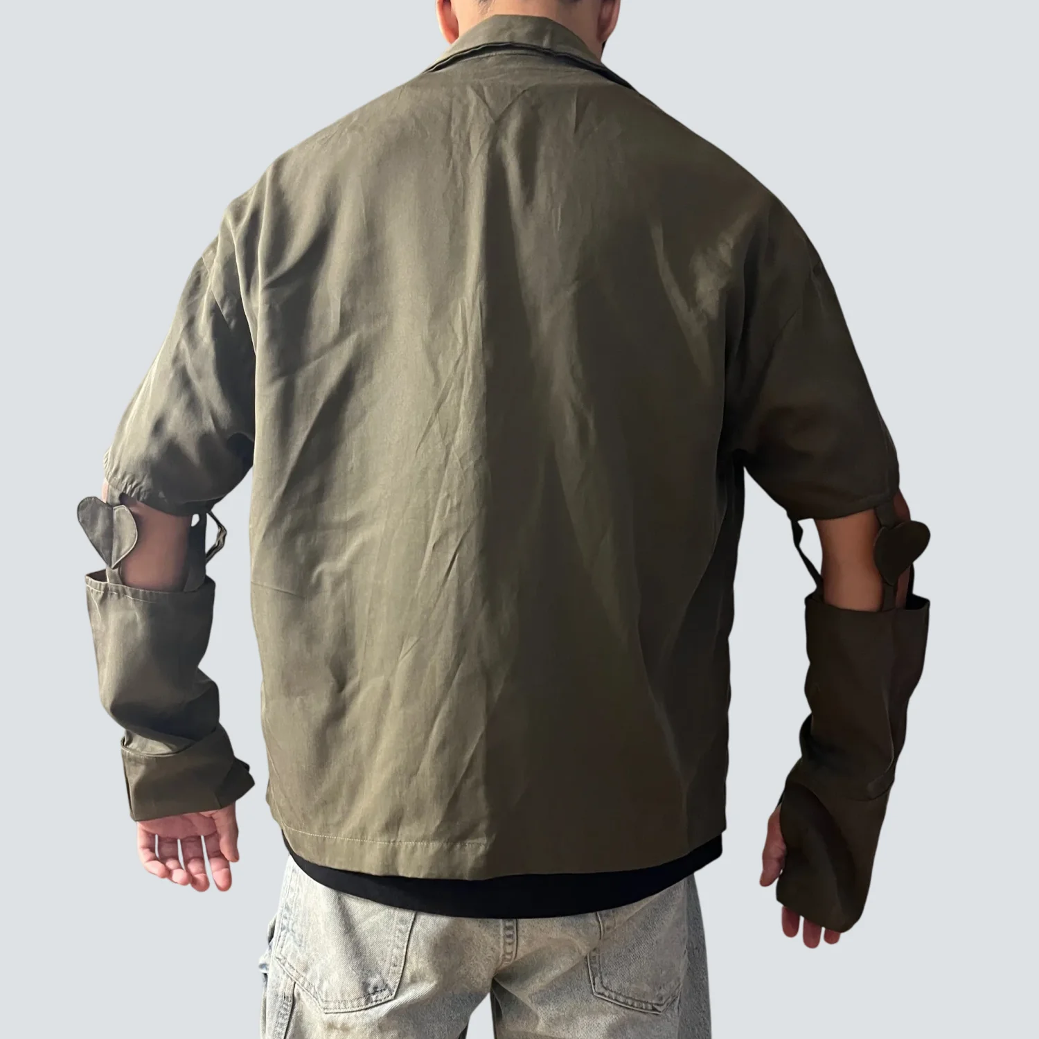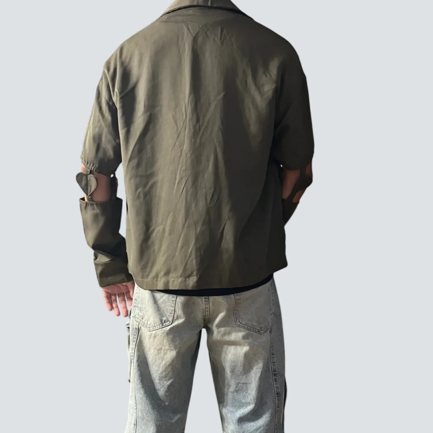 This unique olive green jacket features cut-out sleeves for a modern and edgy look. Made with durable fabric, it includes a full front zipper, chest pocket, and a relaxed fit. The jacket's standout feature is the heart-shaped detailing on the cut-out sleeves, adding a touch of distinctive style. Perfect for casual wear or making a fashion statement. #streetwear #fashionforward #edgy