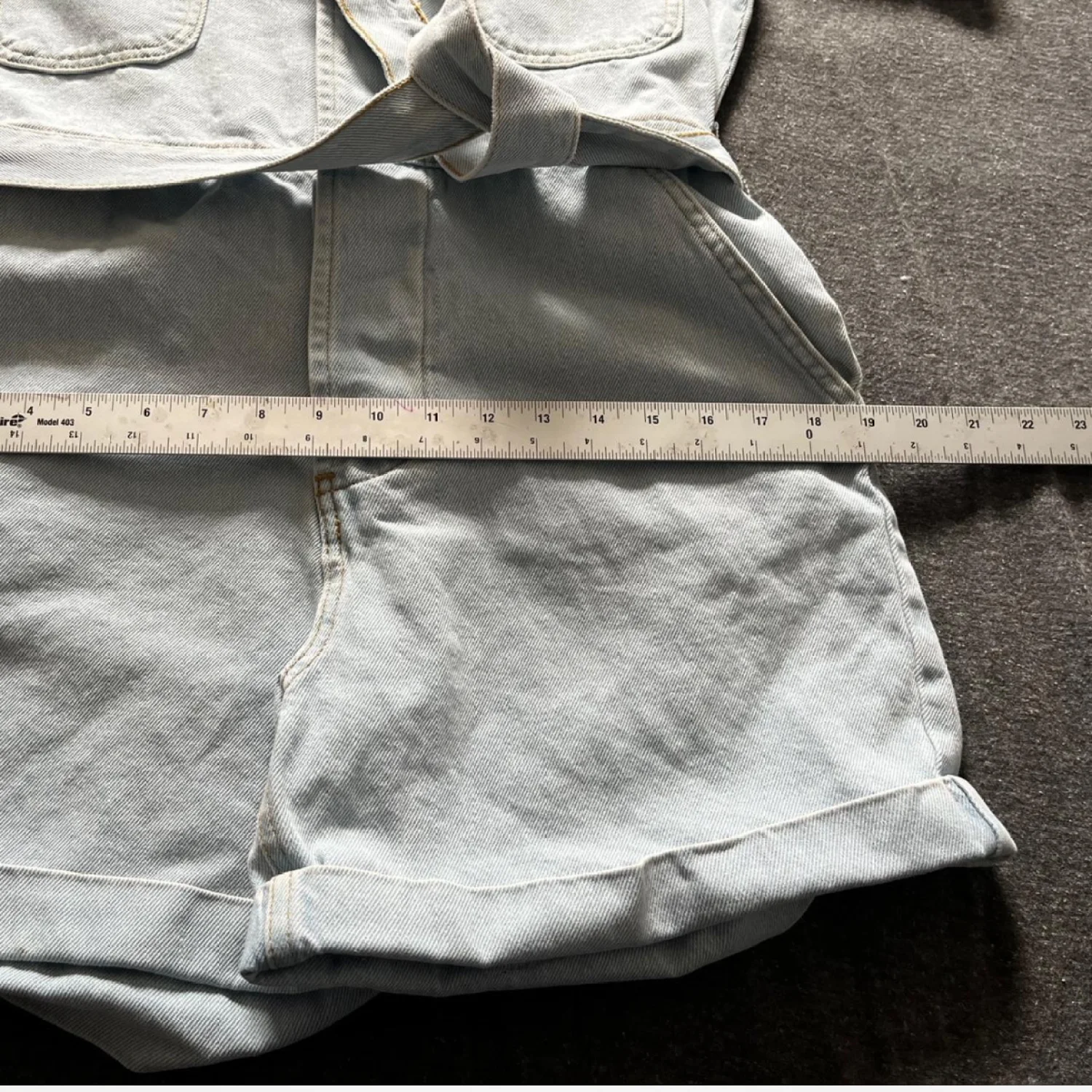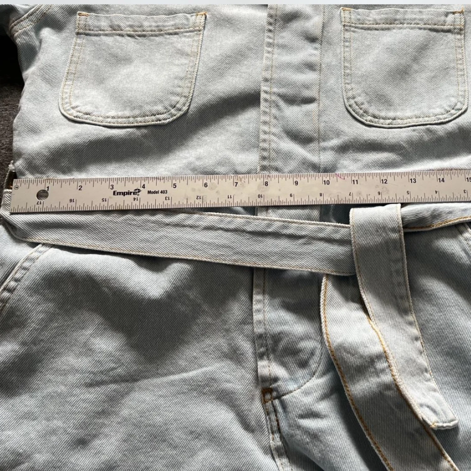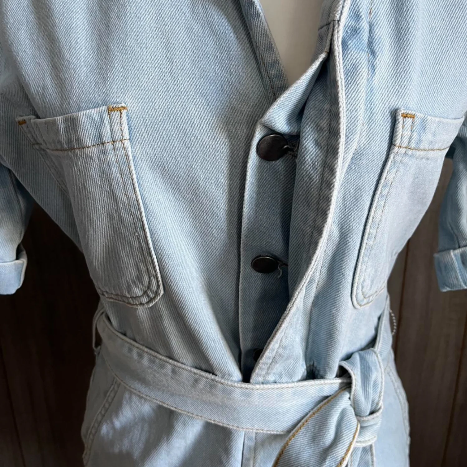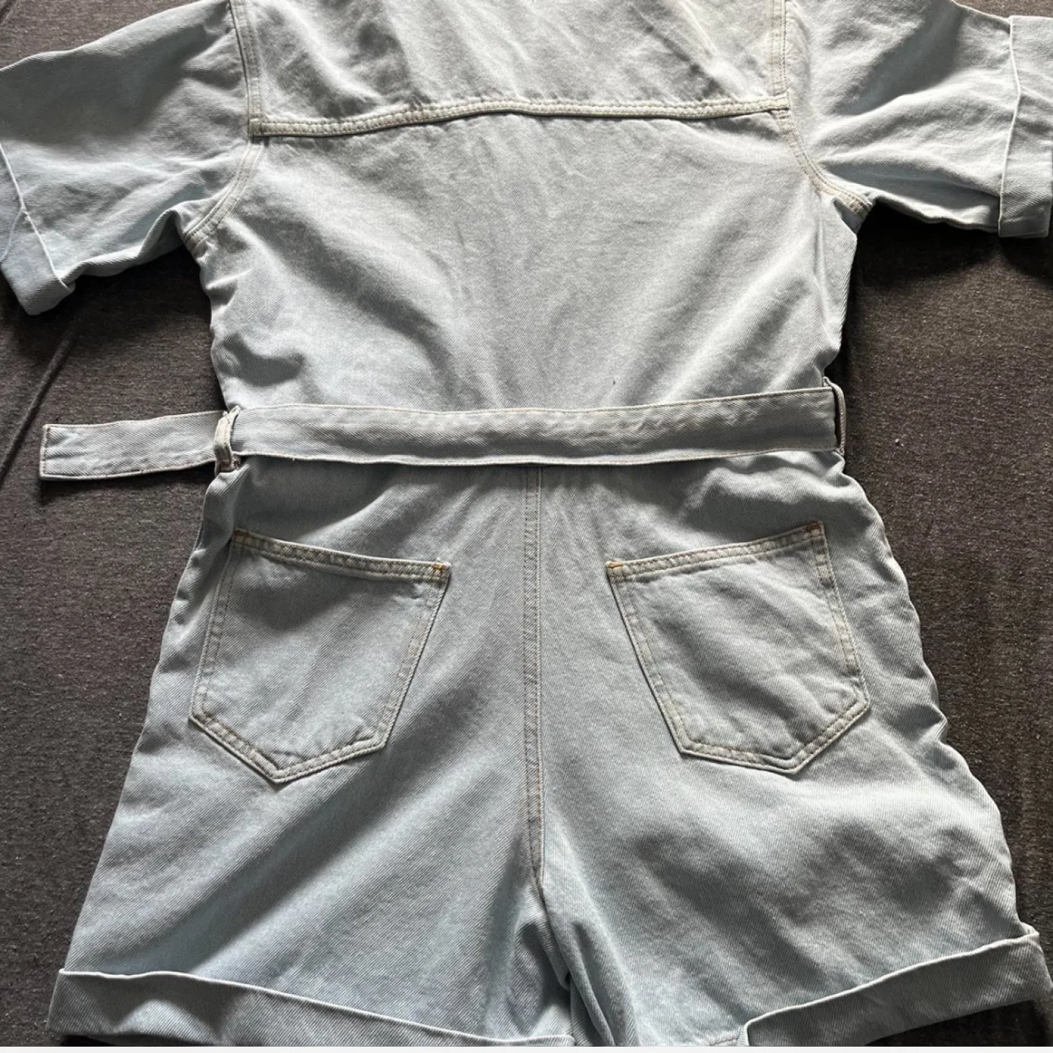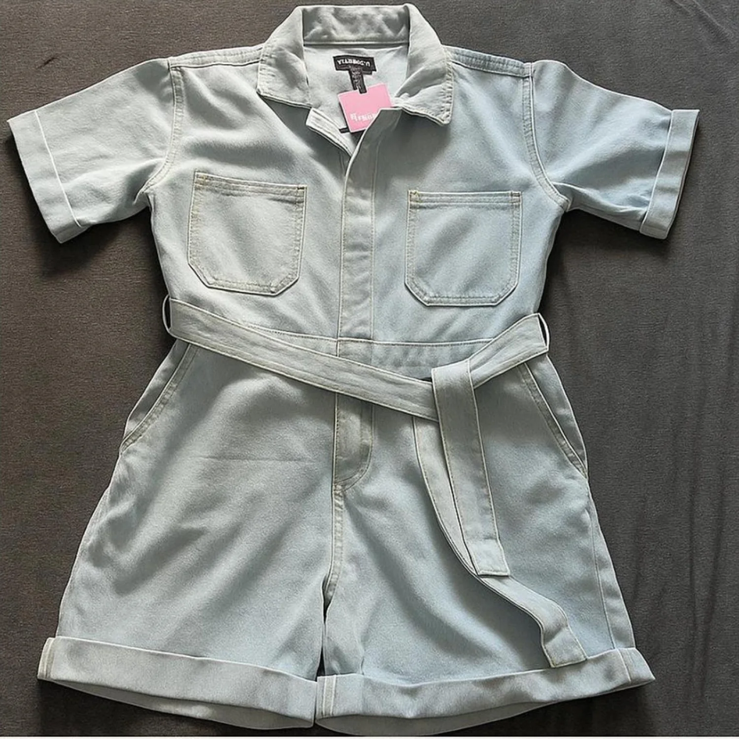 Light wash denim romper featuring a classic collar and short sleeves. This stylish piece includes a matching belt for a flattering fit and cuffed shorts for a casual vibe. The romper has four pockets, two on the chest and two on the back, providing a functional yet fashionable touch. Perfect for a laid-back day out. #denim #romper #casualwear #denimromper #pltstyle #utilityjumpsuit #casualcool #lightwashdenim #summerfit #shortjumpsuit #beltedromper #streetwearchic #fashiondeal #rescopestyle #closetrefresh #nwtfinds