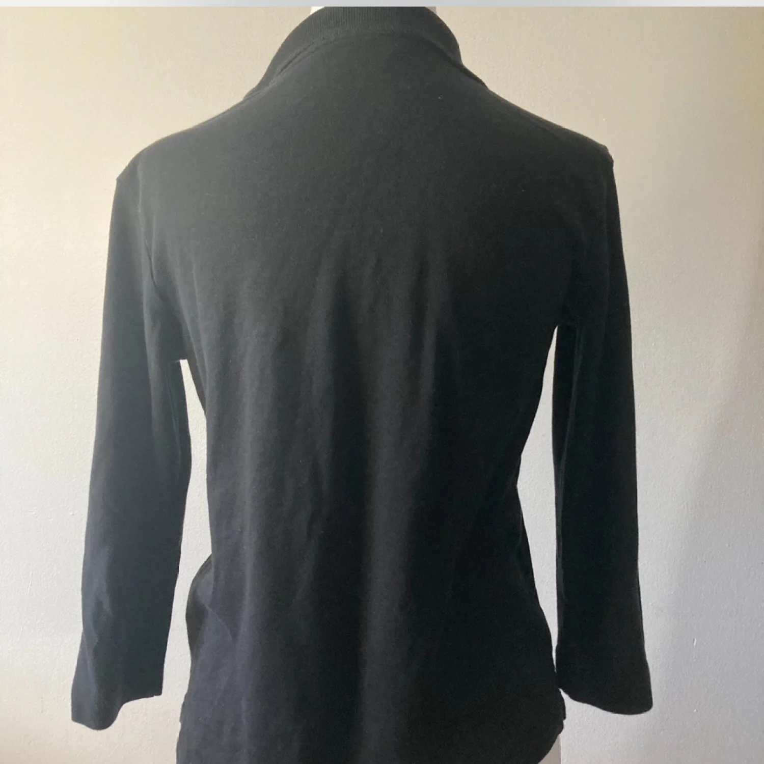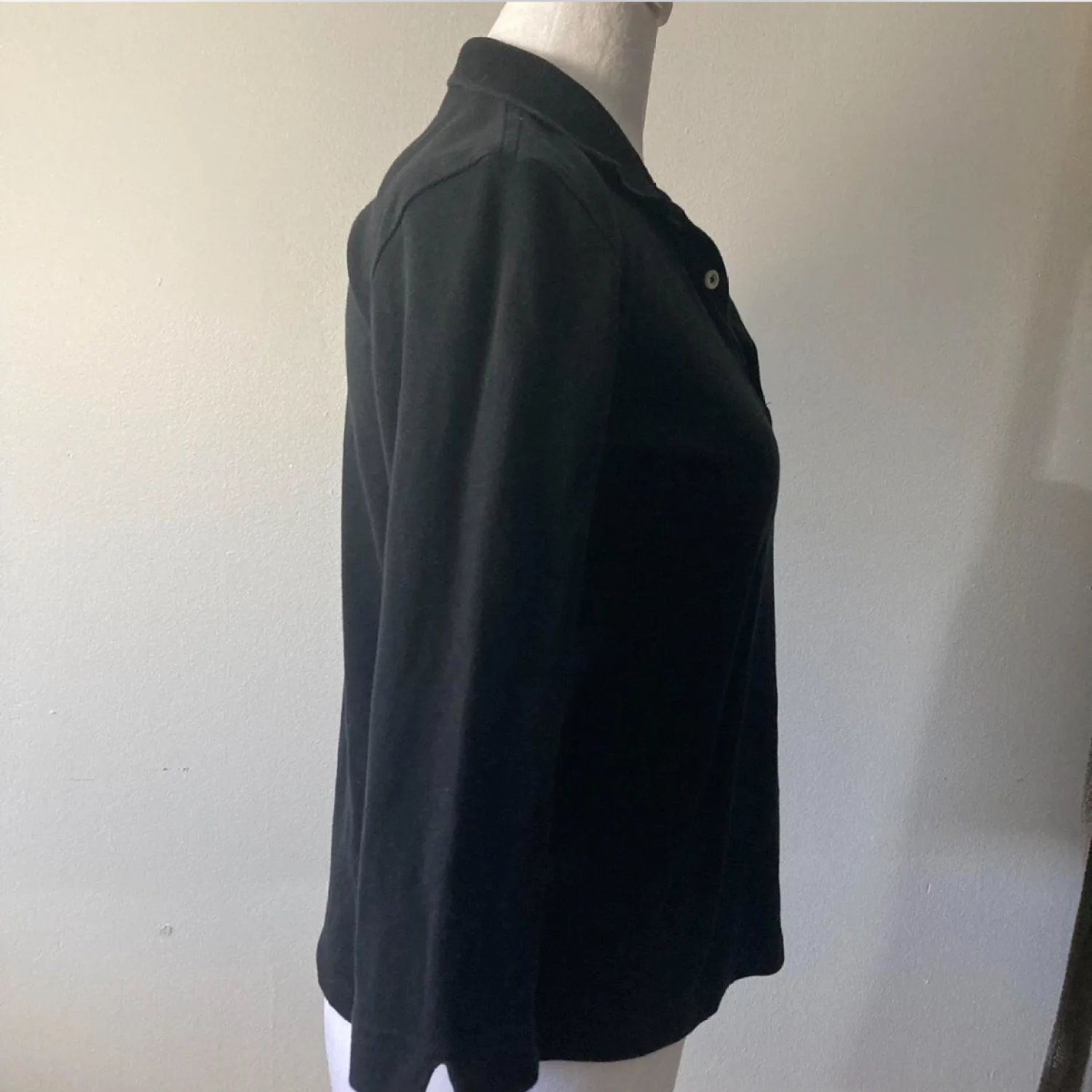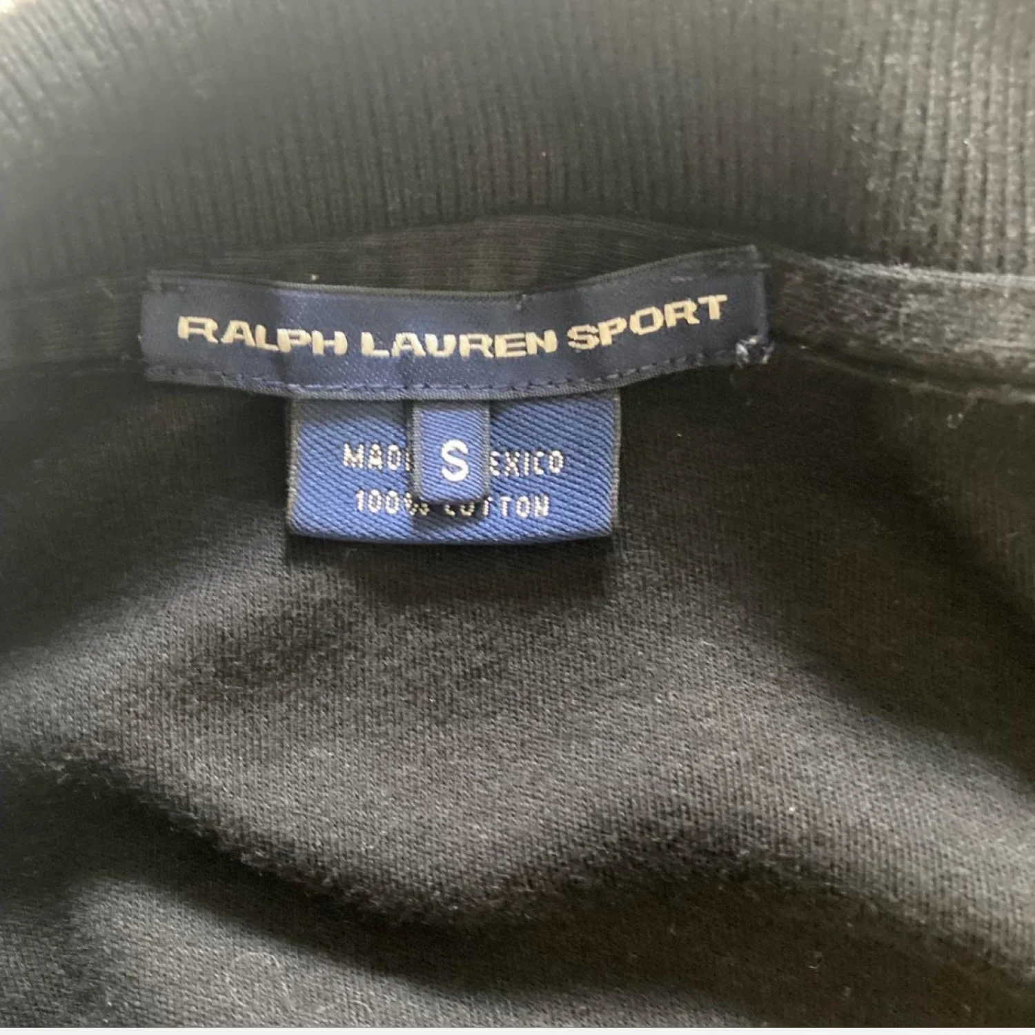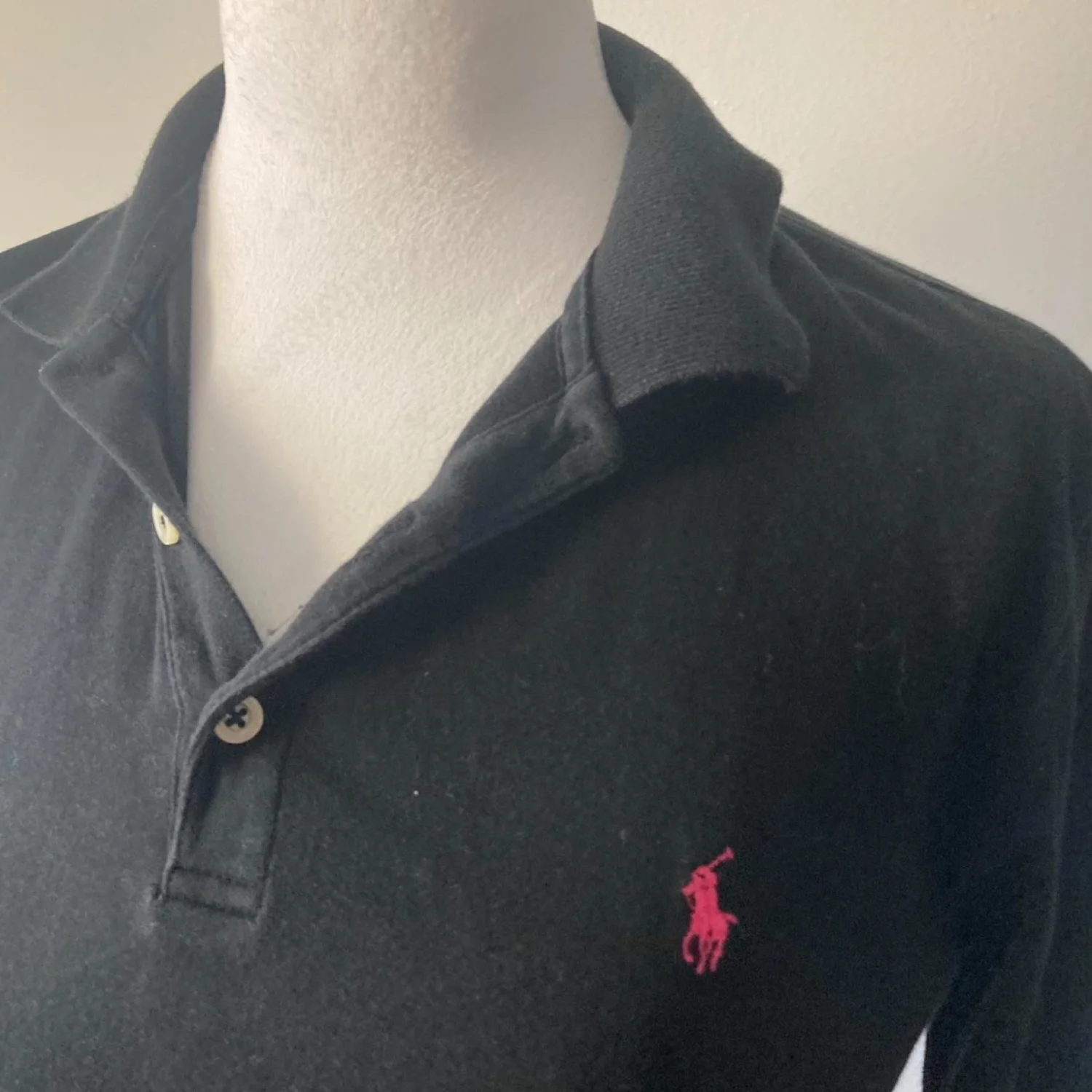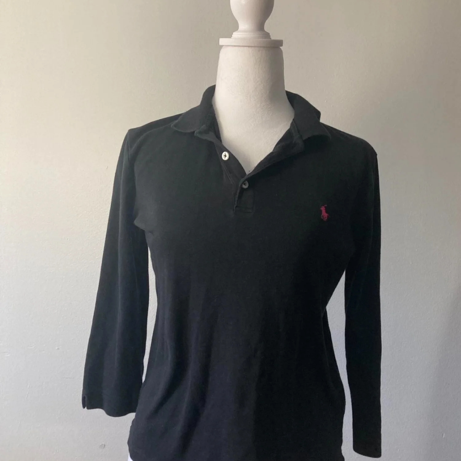 Ralph Lauren Sport black long-sleeve polo shirt featuring the iconic small red polo player logo on the chest. Made from 100% cotton for comfort. Perfect for casual or slightly formal occasions. Size Small. Care instructions: Machine wash cold with like colors. #RalphLauren #PoloShirt #CasualWear