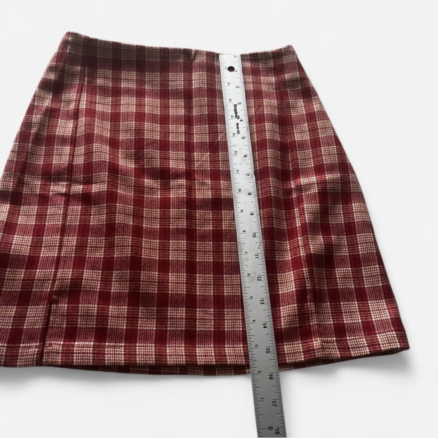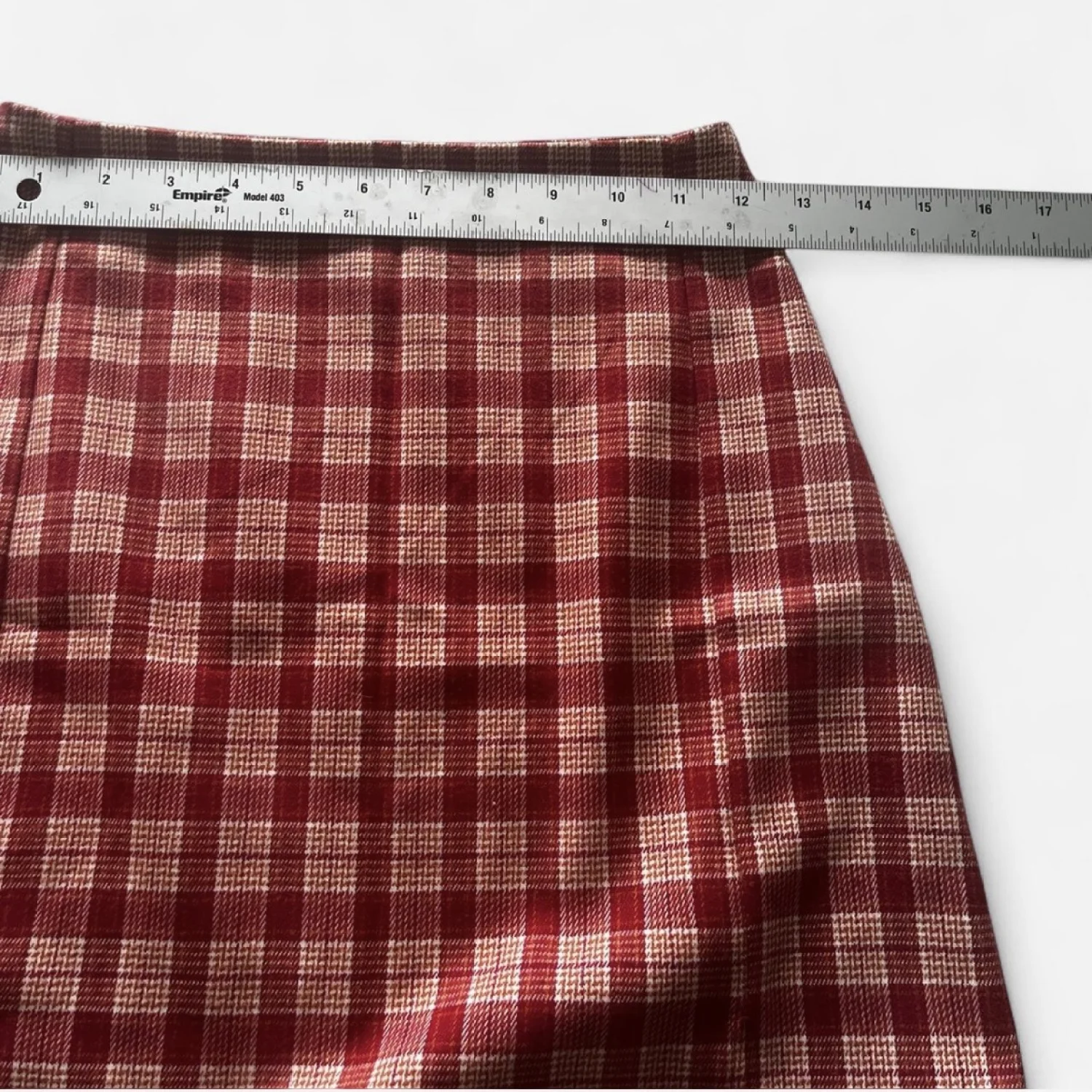 Chic red plaid A-line skirt, perfect for casual or semi-formal occasions. Features a classic plaid pattern in red and beige tones, offering a stylish vintage look. The skirt is an ideal choice for fall and winter outfits, easily paired with tights and boots. #vintage #plaid #a-lineskirt