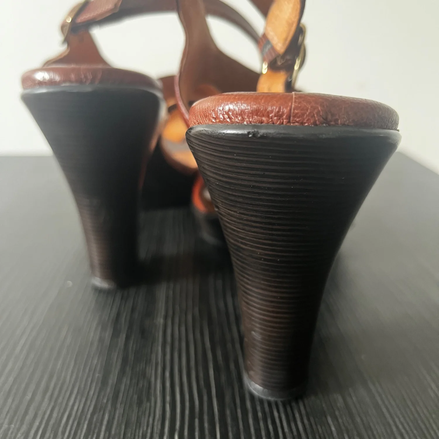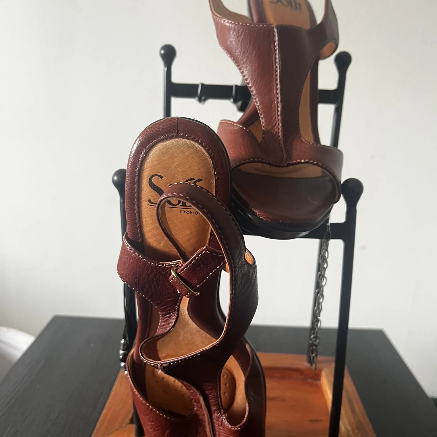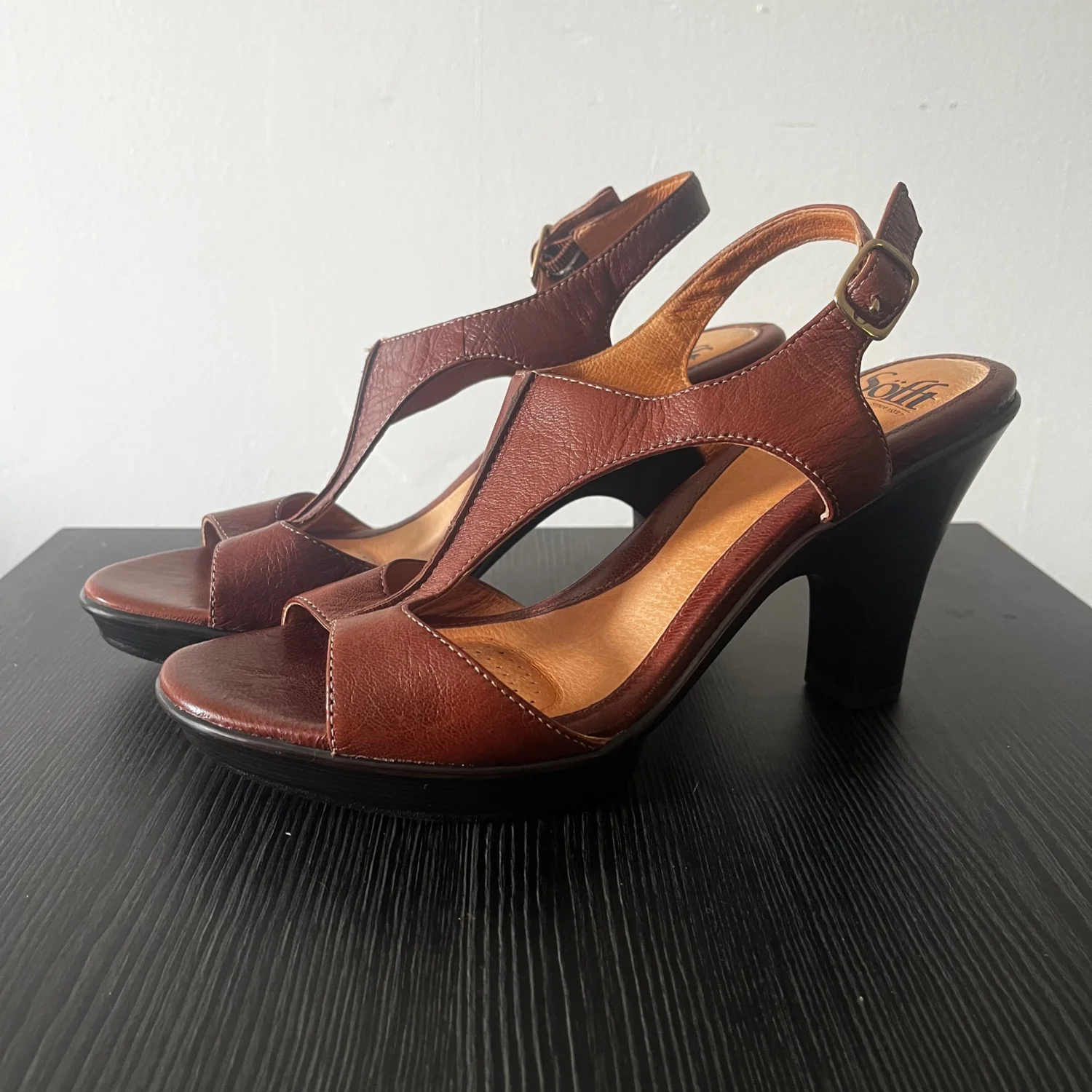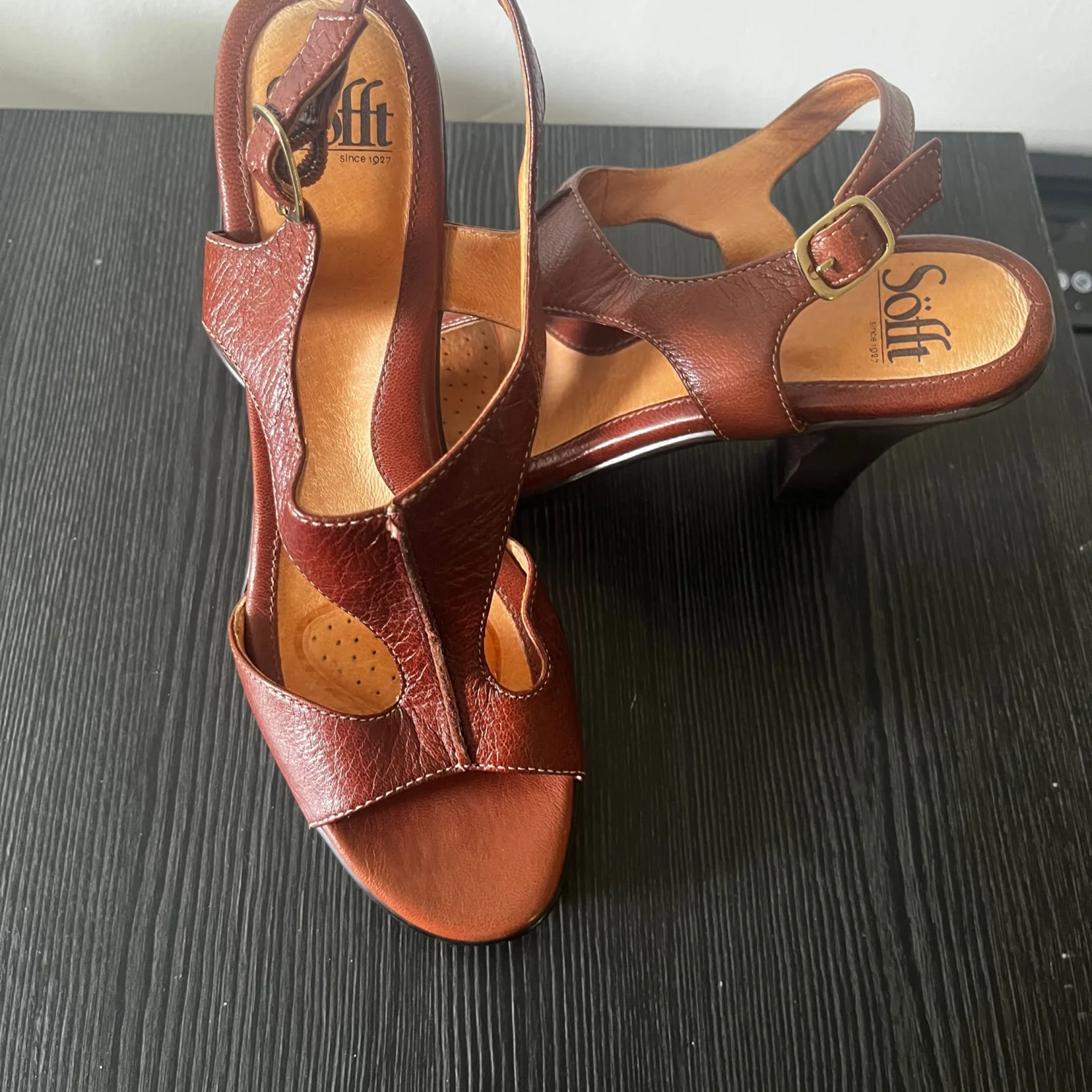Stylish brown leather high heel sandals by Söfft. These sandals feature a leather upper and cushioned footbed for comfort. They have a sturdy heel and a strap with a buckle closure for a secure fit. Perfect for a dressy occasion or a night out. #leather #highheels #söfft • #SofftShoes • #LeatherHeels • #ComfortChic • #DateNightStyle • #ClassicBrown