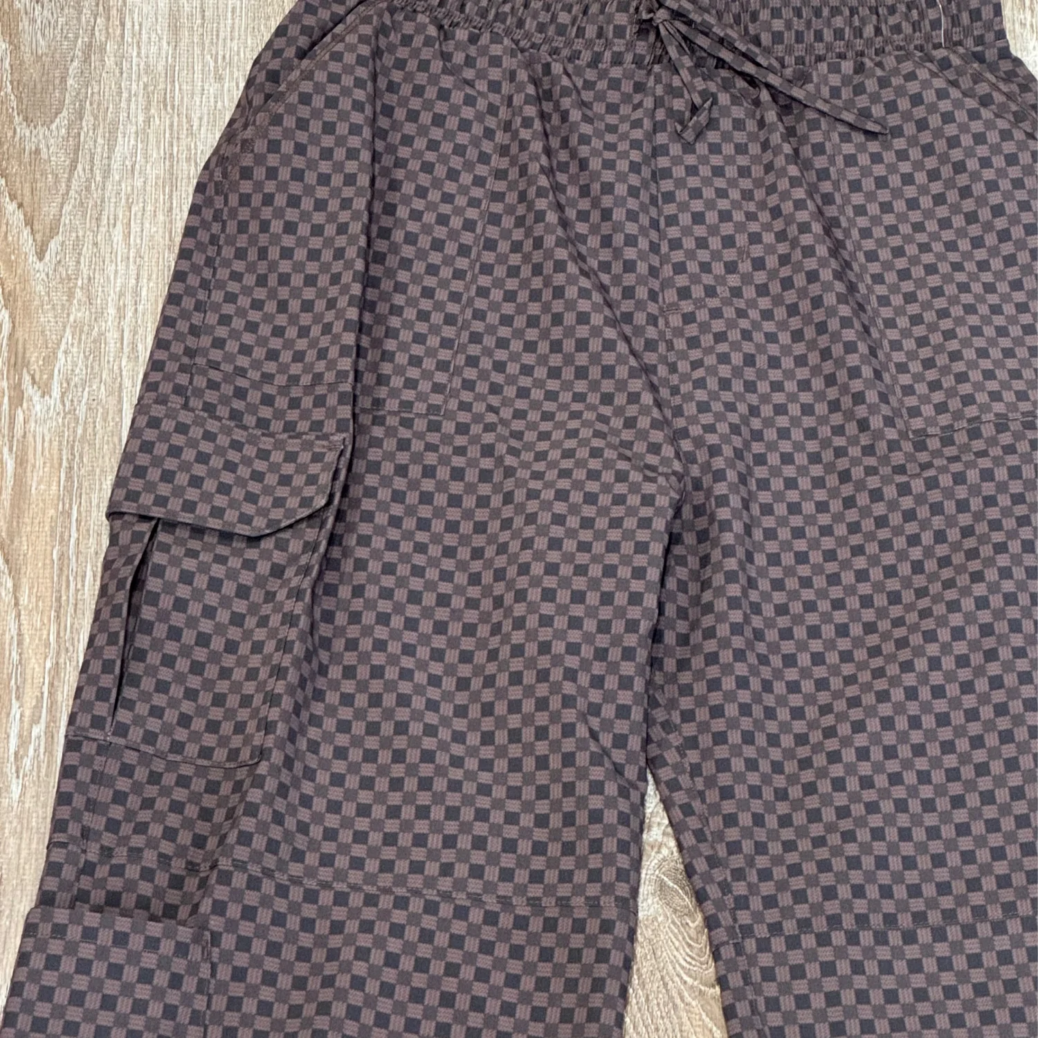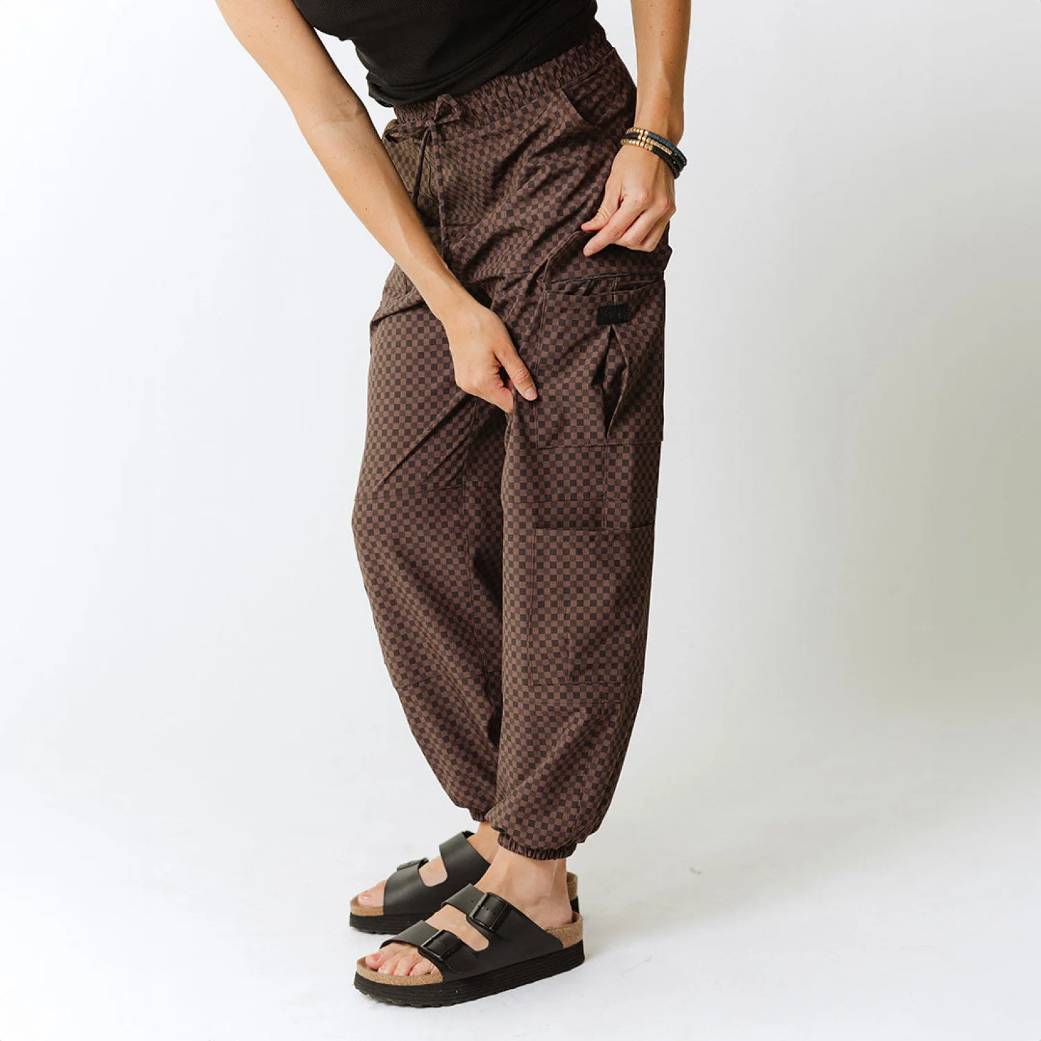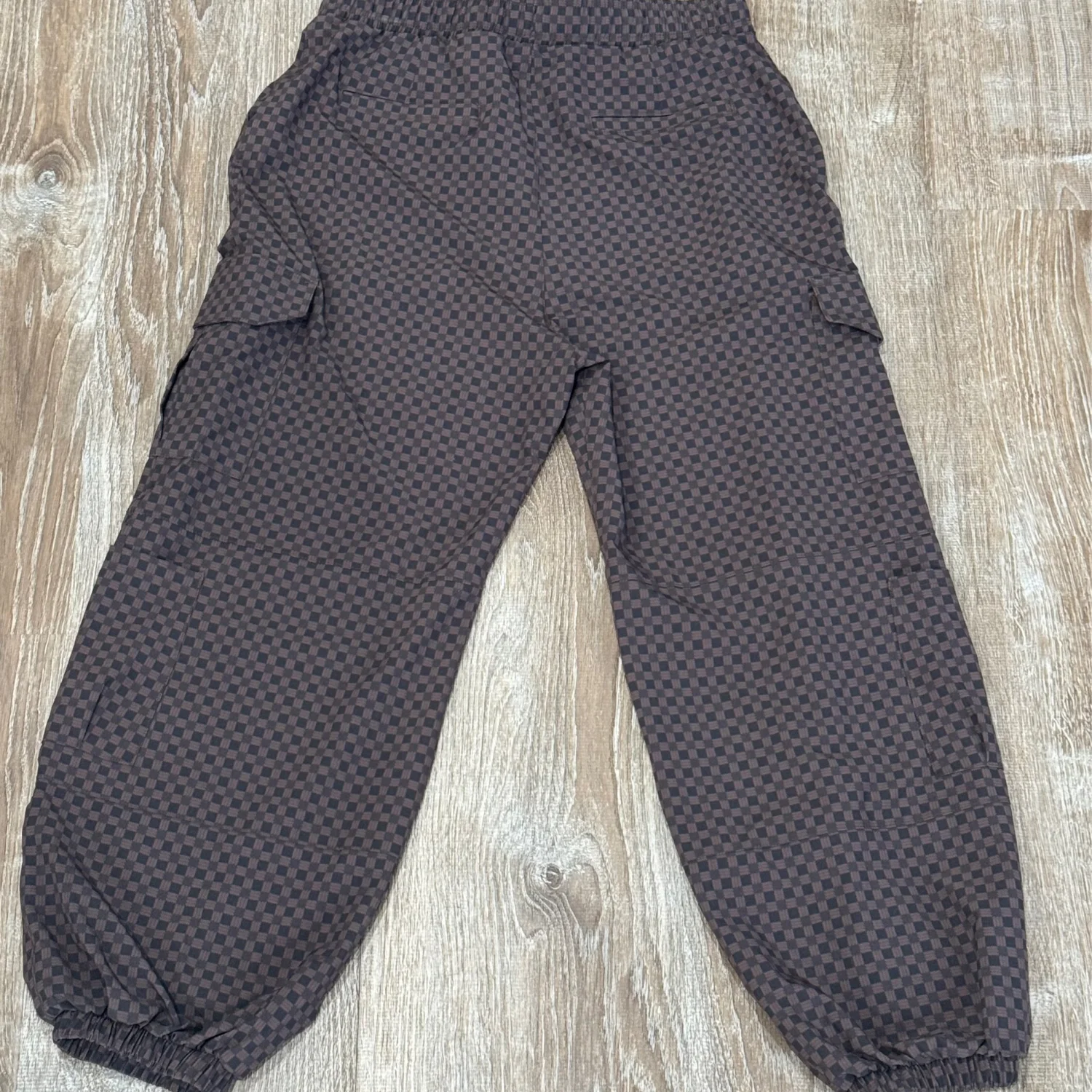 New without tags Albion Women's Cargo Joggers Best-selling brown and black Wicker print ,Comfy and functional pants. Stylish and comfortable women’s brown checkered pants, perfect for casual outings. Size: Small/Petite Waist: 28-30” Hip: 37.5-39.5” Billowy fit Perfect travel pants Full length Adjustable drawstring waistband Wrinkle-free, Jetsetter fabric Material: 90% Nylon - 10% Spandex Wash cold and lay flat or hang to dry Made in Guatemala MSRP: $100
