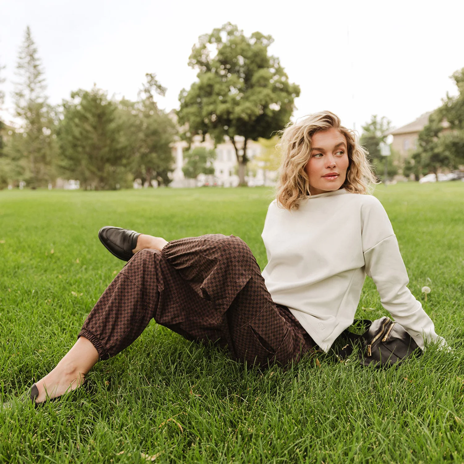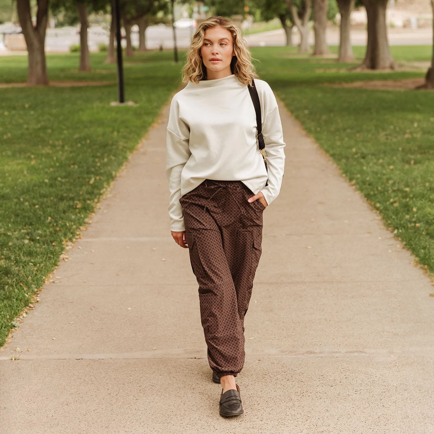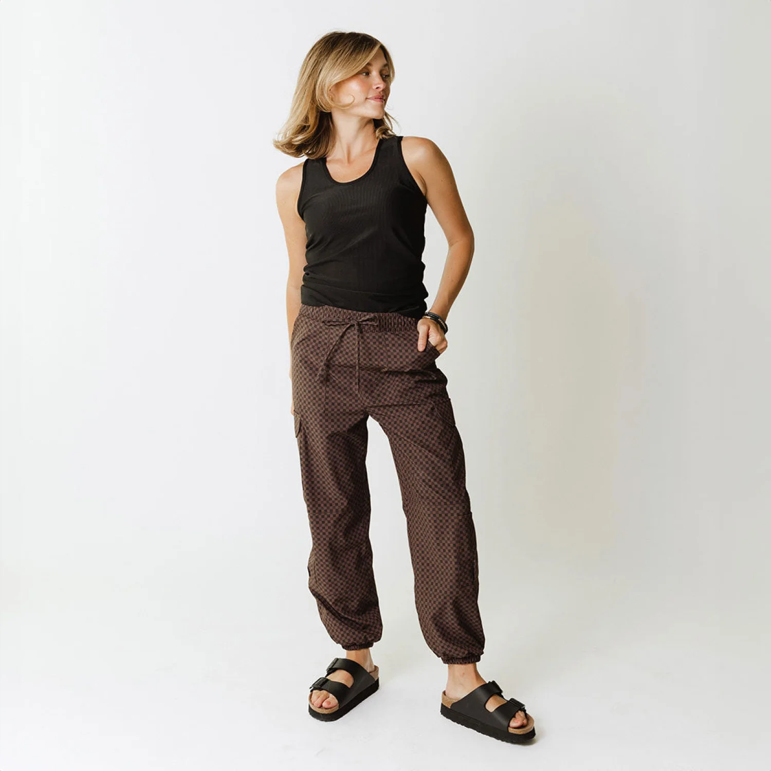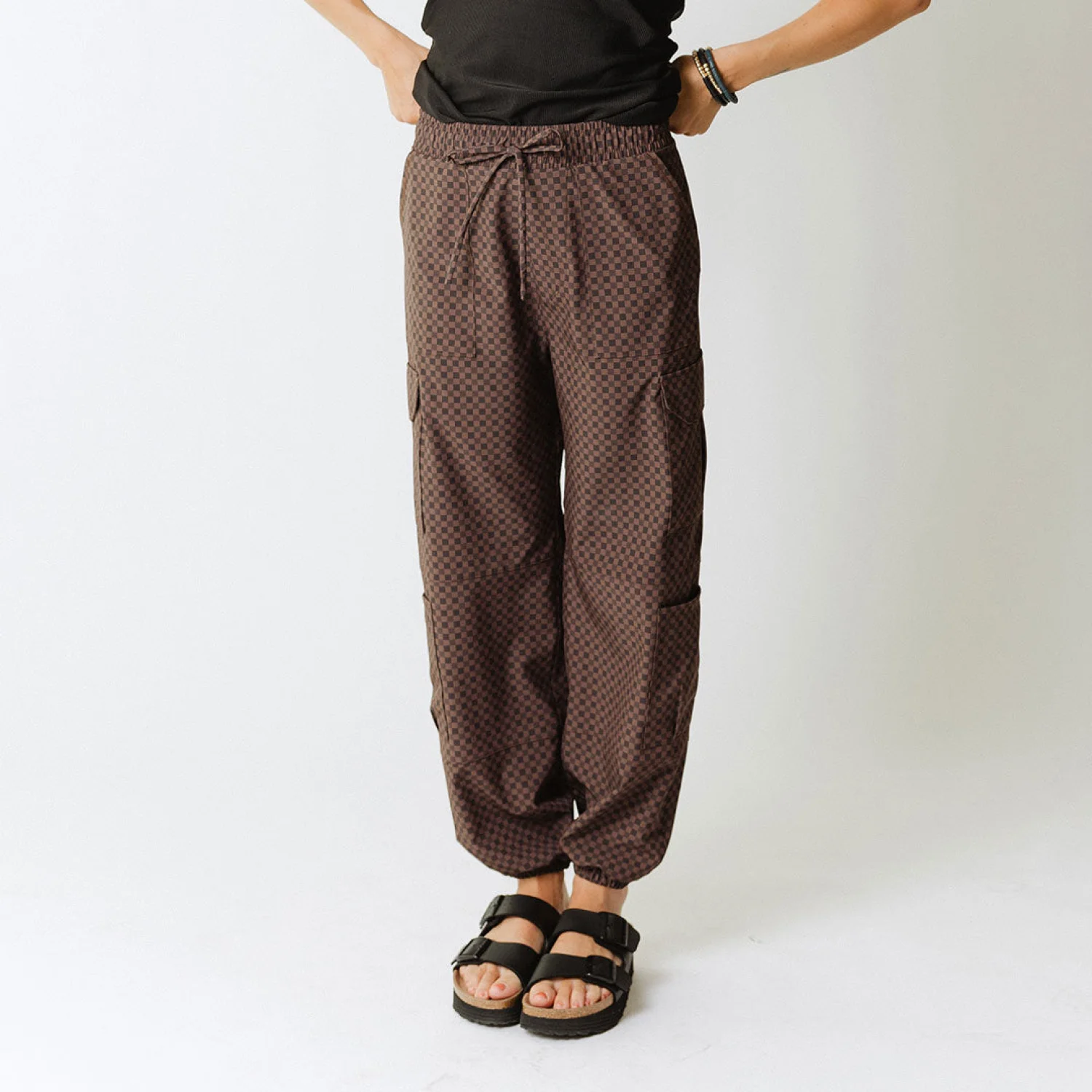 New without tags Albion Women's Cargo Joggers Best-selling brown and black Wicker print ,Comfy and functional pants. Stylish and comfortable women’s brown checkered pants, perfect for casual outings. Size: Small/Petite Waist: 28-30” Hip: 37.5-39.5” Billowy fit Perfect travel pants Full length Adjustable drawstring waistband Wrinkle-free, Jetsetter fabric Material: 90% Nylon - 10% Spandex Wash cold and lay flat or hang to dry Made in Guatemala MSRP: $100