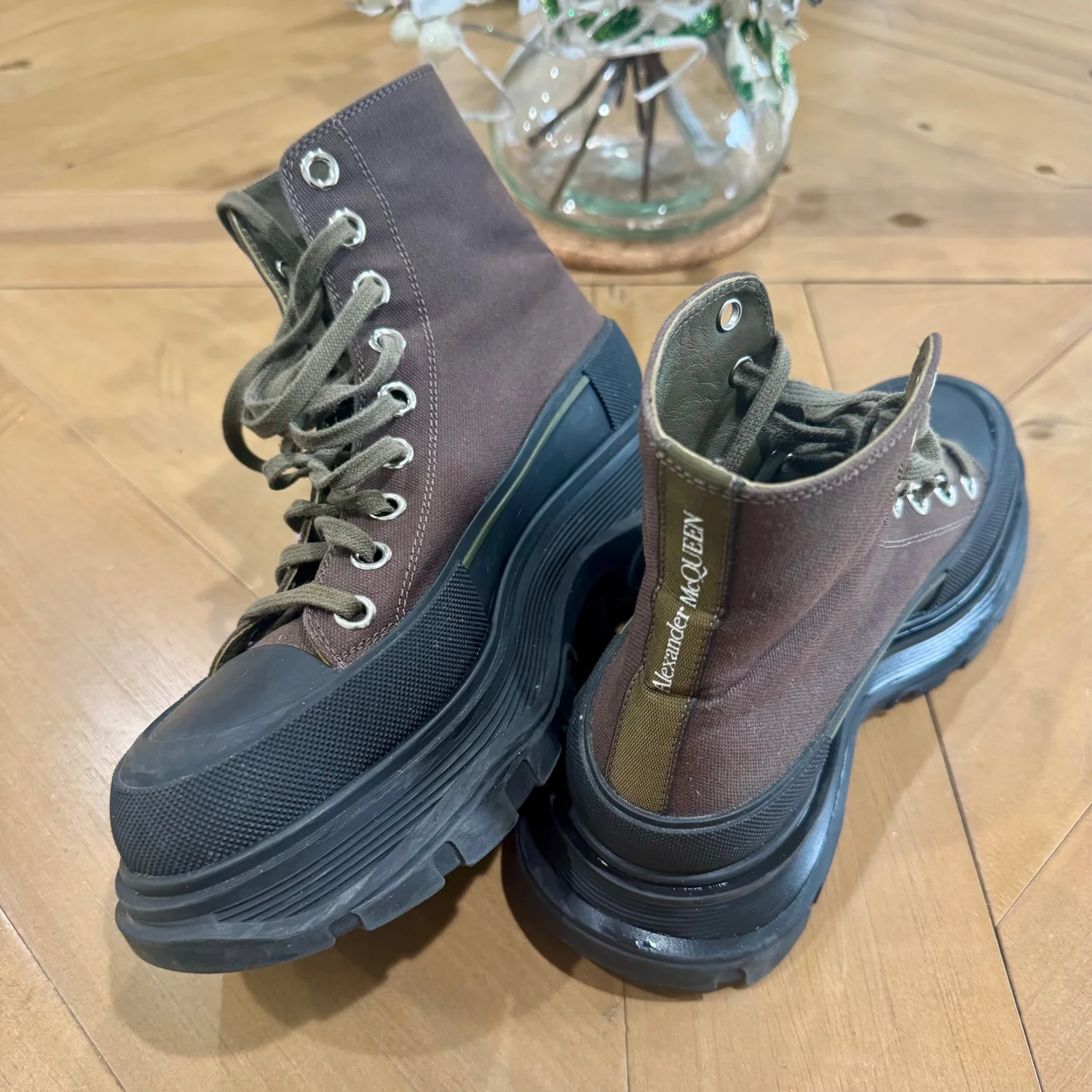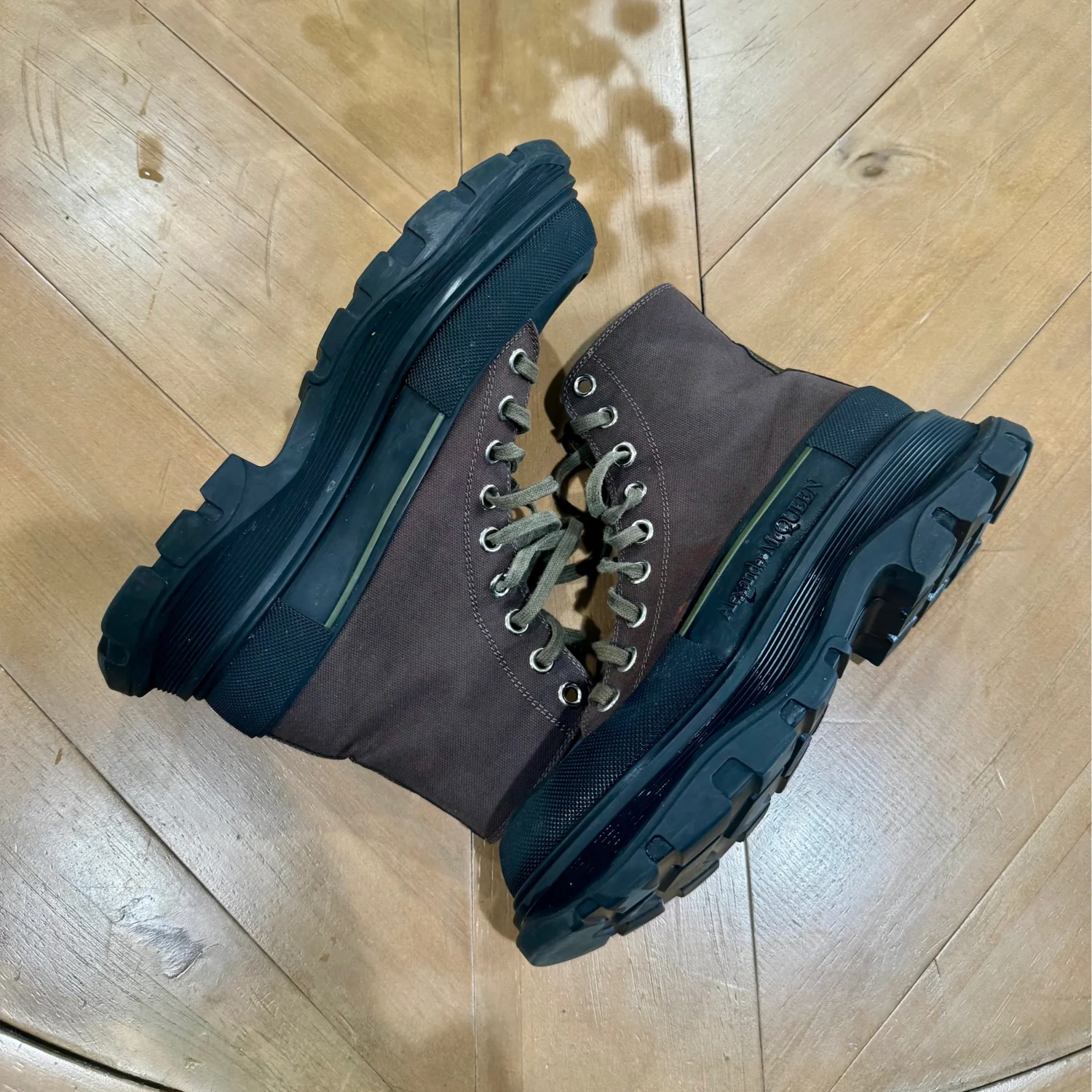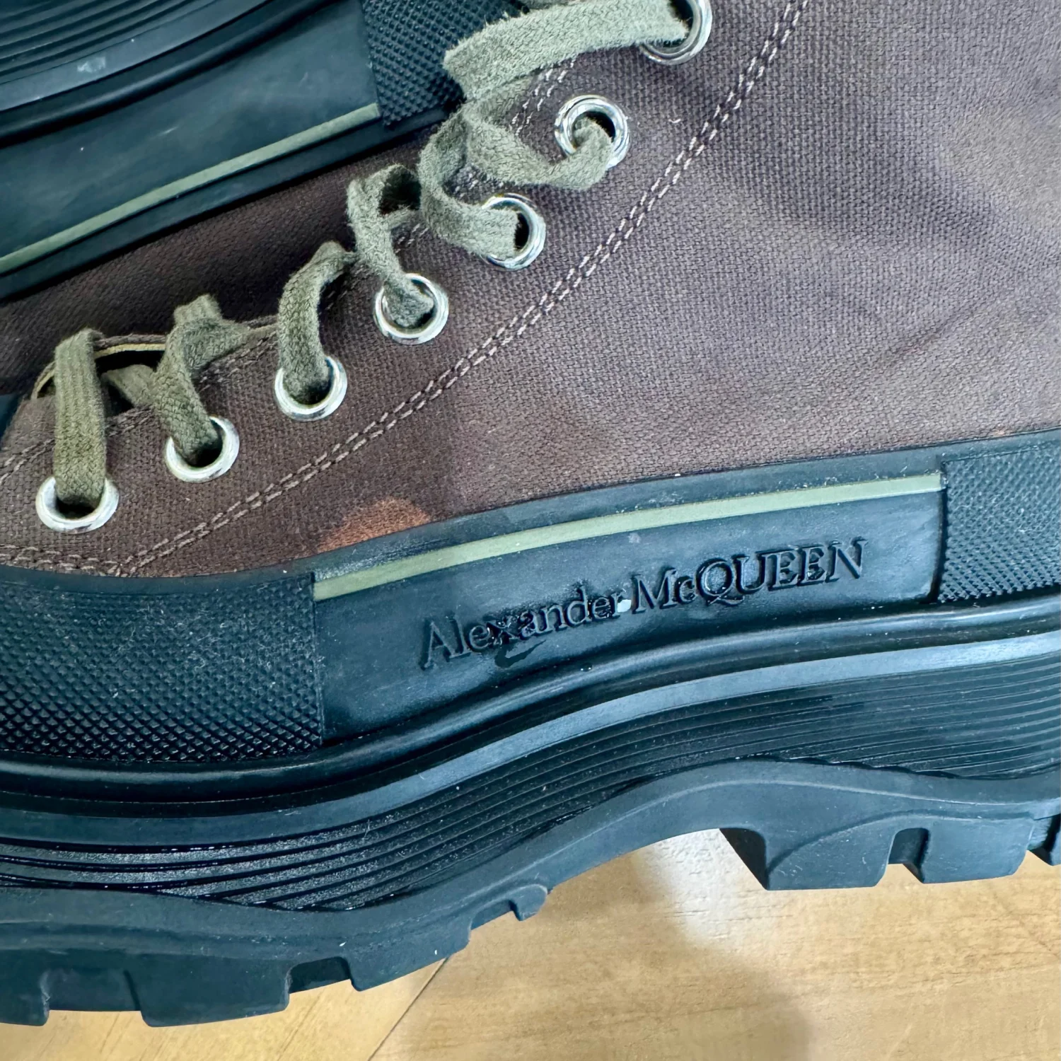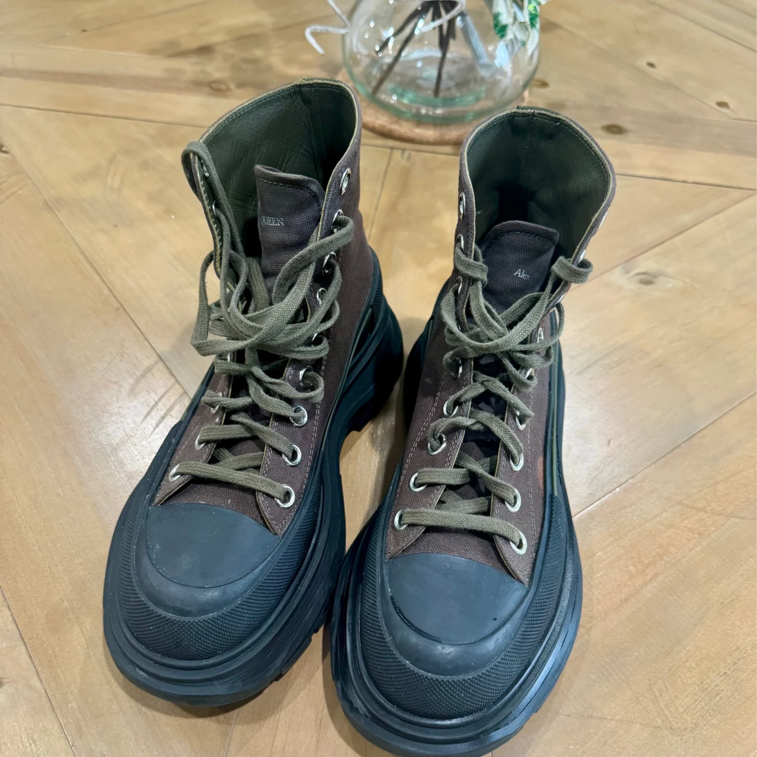 Used great condition Visionary designer Lee Alexander McQueen launched his brand in 1992, which quickly became synonymous with cutting edge, avant-garde design. Creative Director Seán McGirr has continued the designer's legacy, bringing precision craftsmanship and a sharp attention to detail to the brand's menswear and iconic sneakers. Crafted of leather, these boots from Alexander McQueen feature exaggerated rubber soles and hiking-inspired lace-up vamps. The brand name decorates the outer midsoles. Size: Eu 38 / Us 7.5 Brown Khaki Canvas upper Round toe Lace-up style Lining: Leather Rubber sole 2” heel 1.25” platform 5.5” shaft Made in Italy MSRP: $990