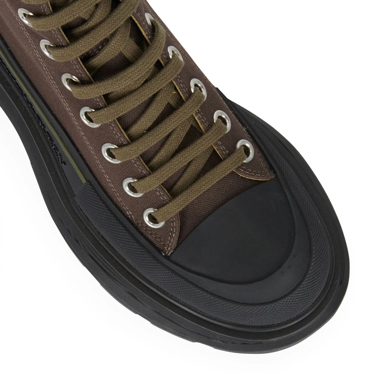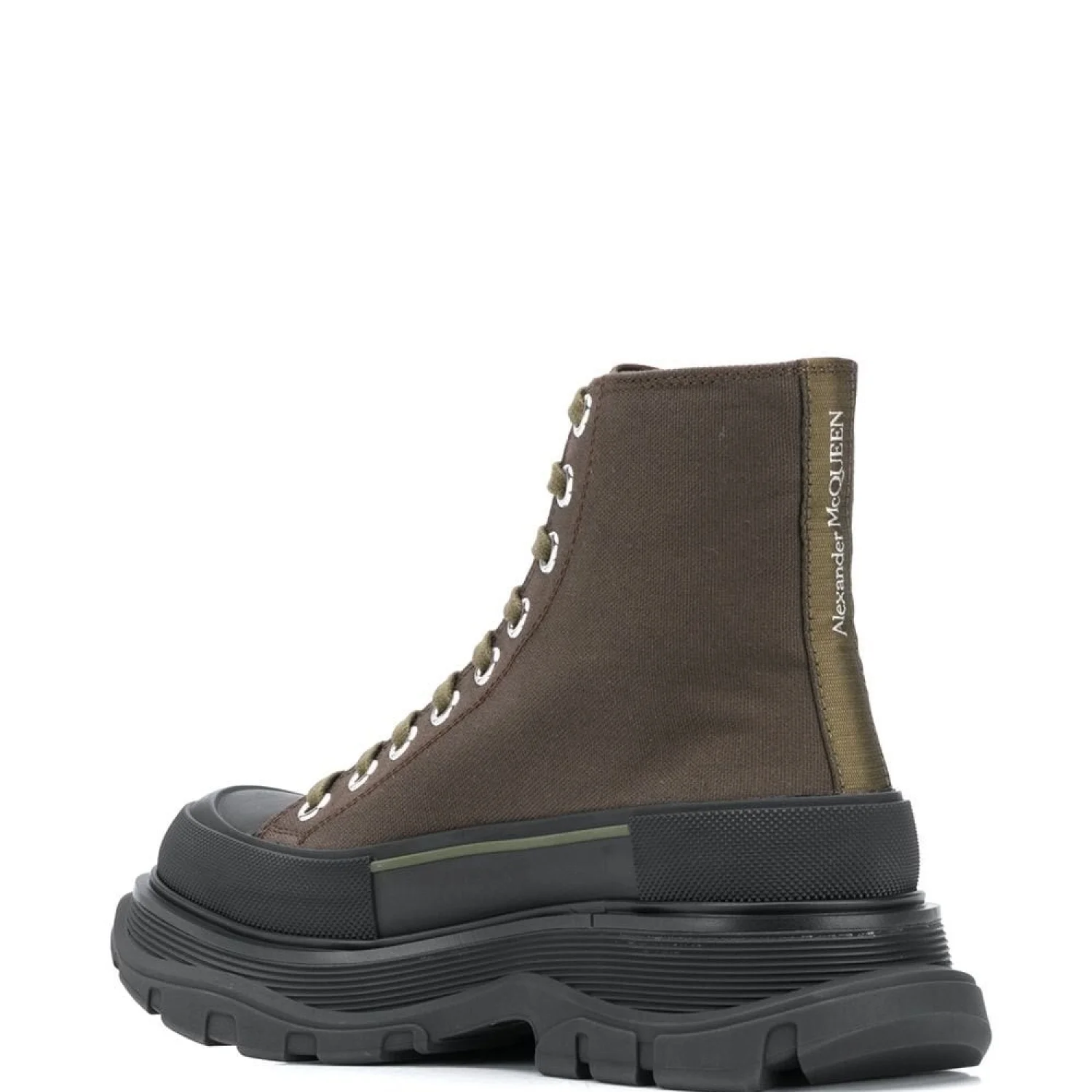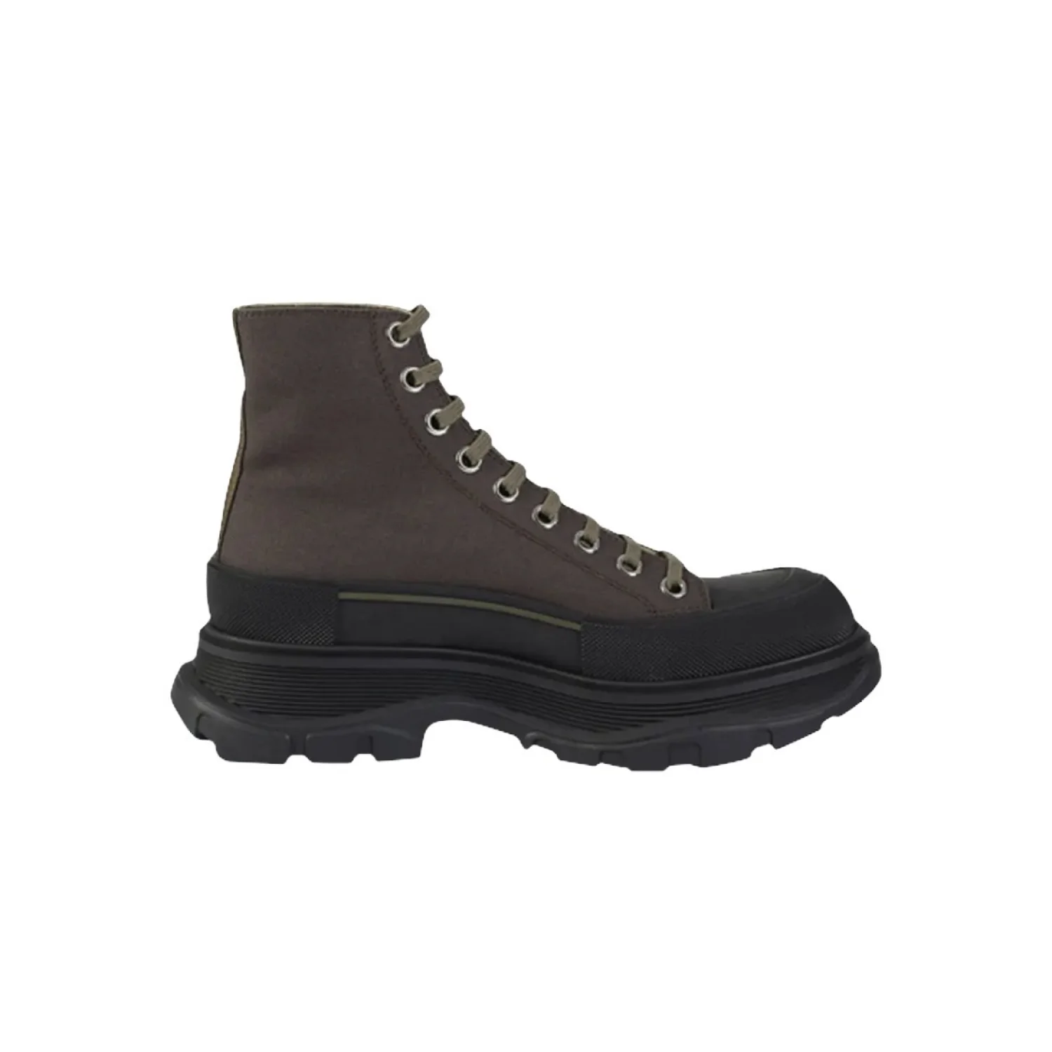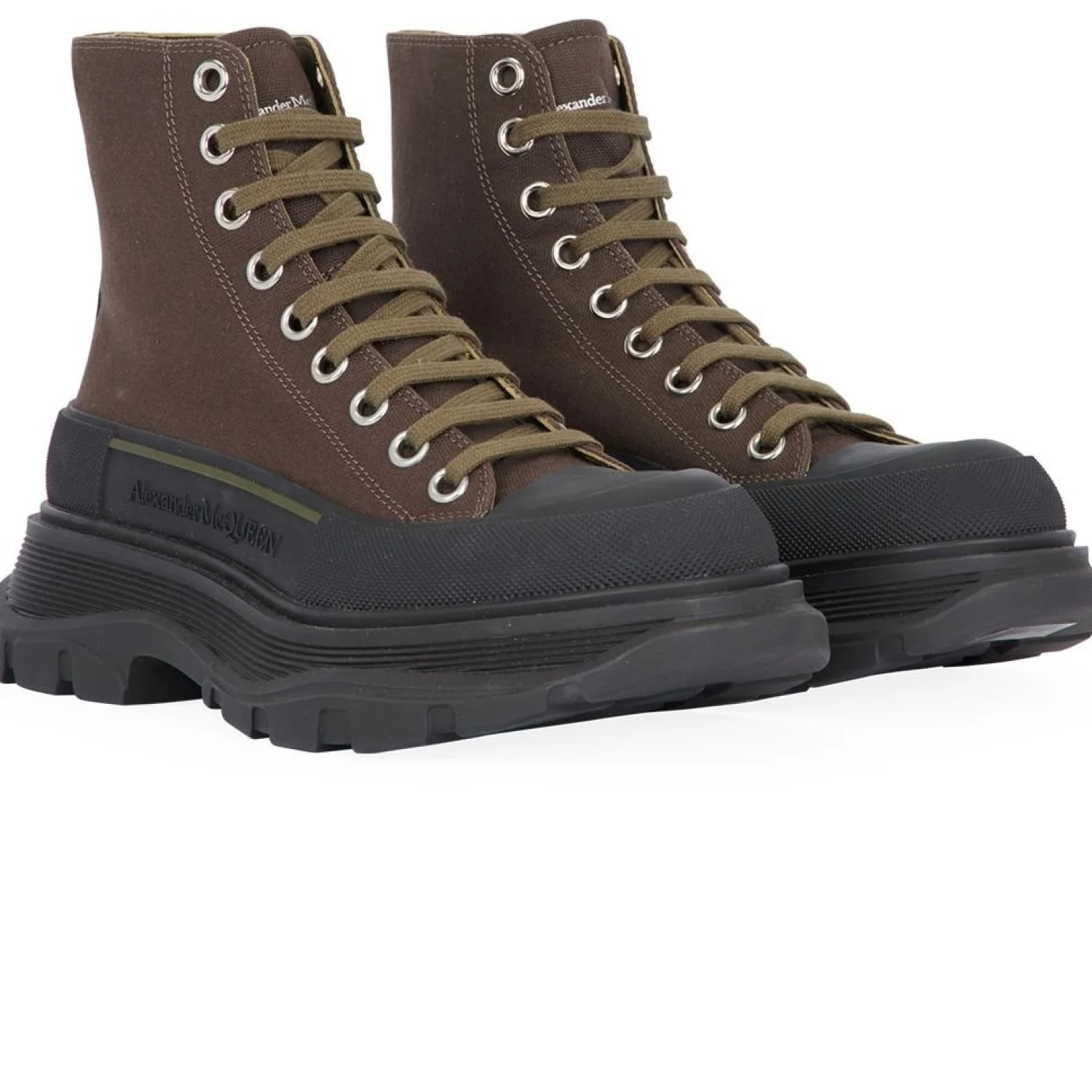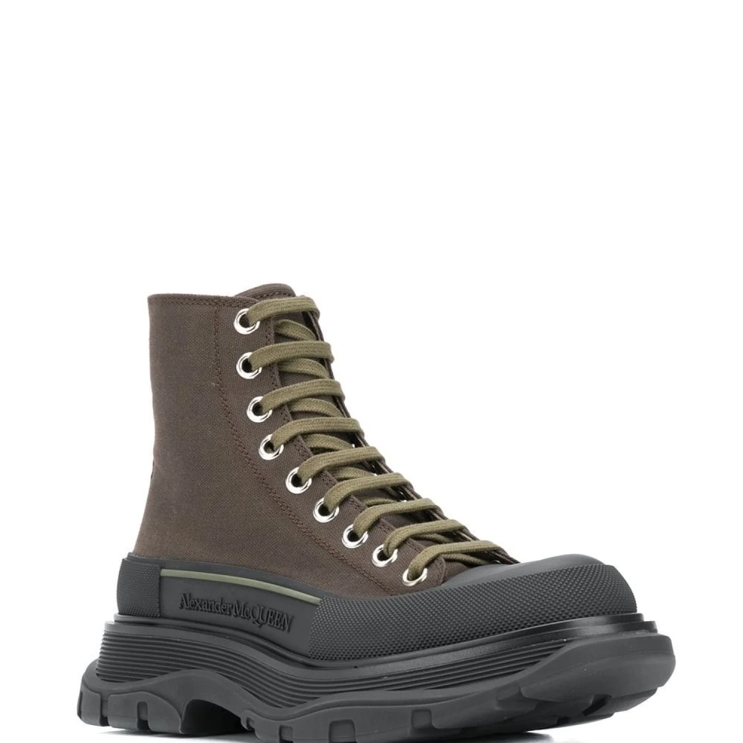Used great condition Visionary designer Lee Alexander McQueen launched his brand in 1992, which quickly became synonymous with cutting edge, avant-garde design. Creative Director Seán McGirr has continued the designer's legacy, bringing precision craftsmanship and a sharp attention to detail to the brand's menswear and iconic sneakers. Crafted of leather, these boots from Alexander McQueen feature exaggerated rubber soles and hiking-inspired lace-up vamps. The brand name decorates the outer midsoles. Size: Eu 38 / Us 7.5 Brown Khaki Canvas upper Round toe Lace-up style Lining: Leather Rubber sole 2” heel 1.25” platform 5.5” shaft Made in Italy MSRP: $990