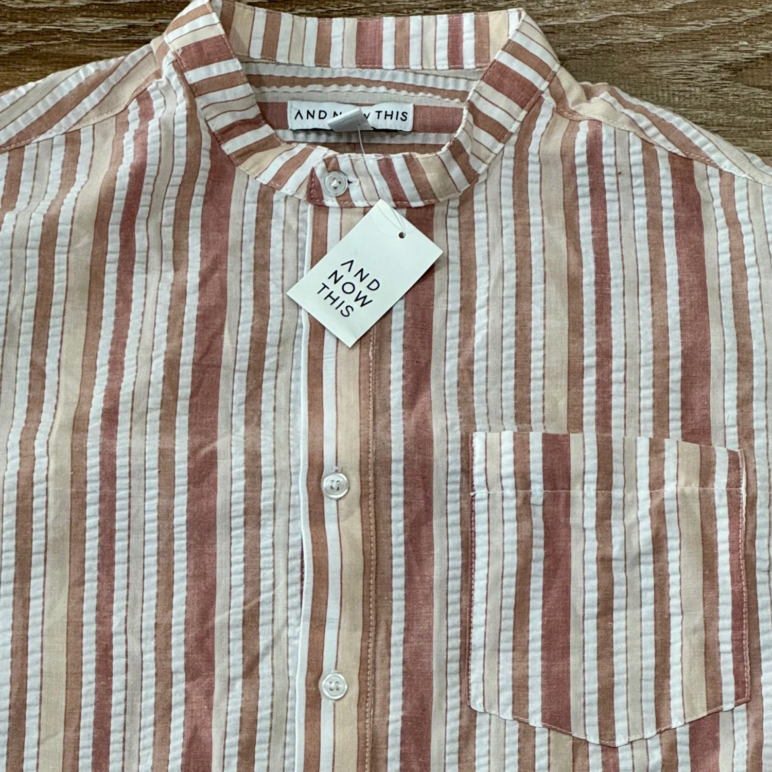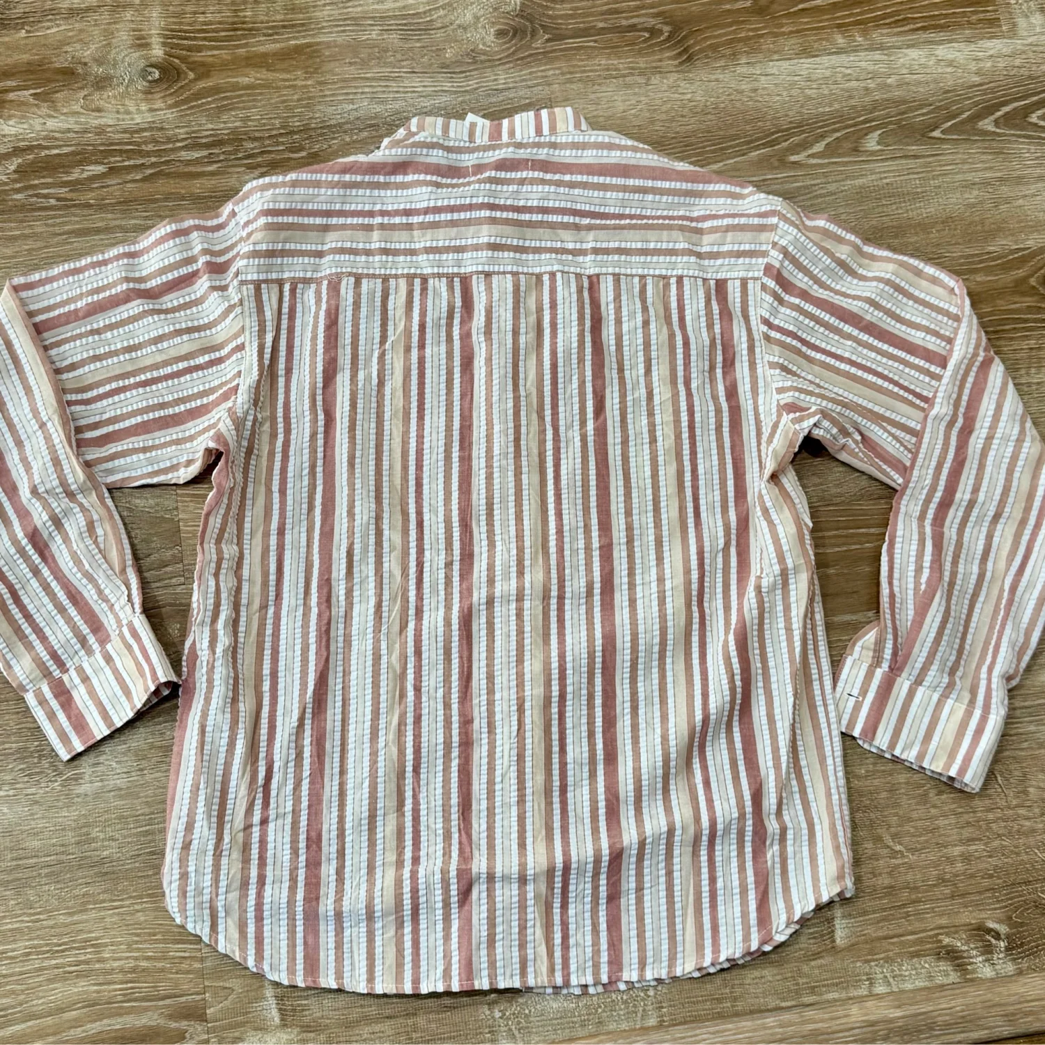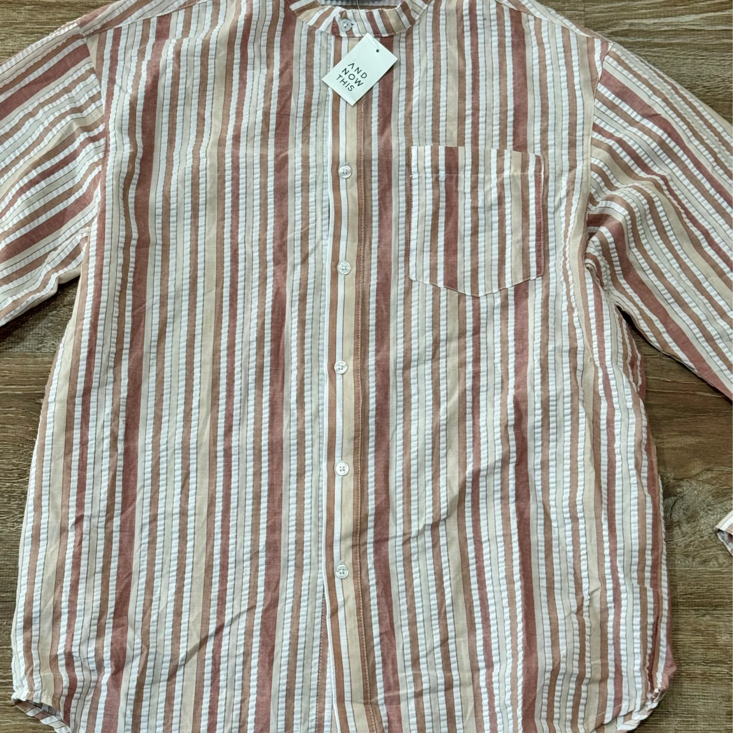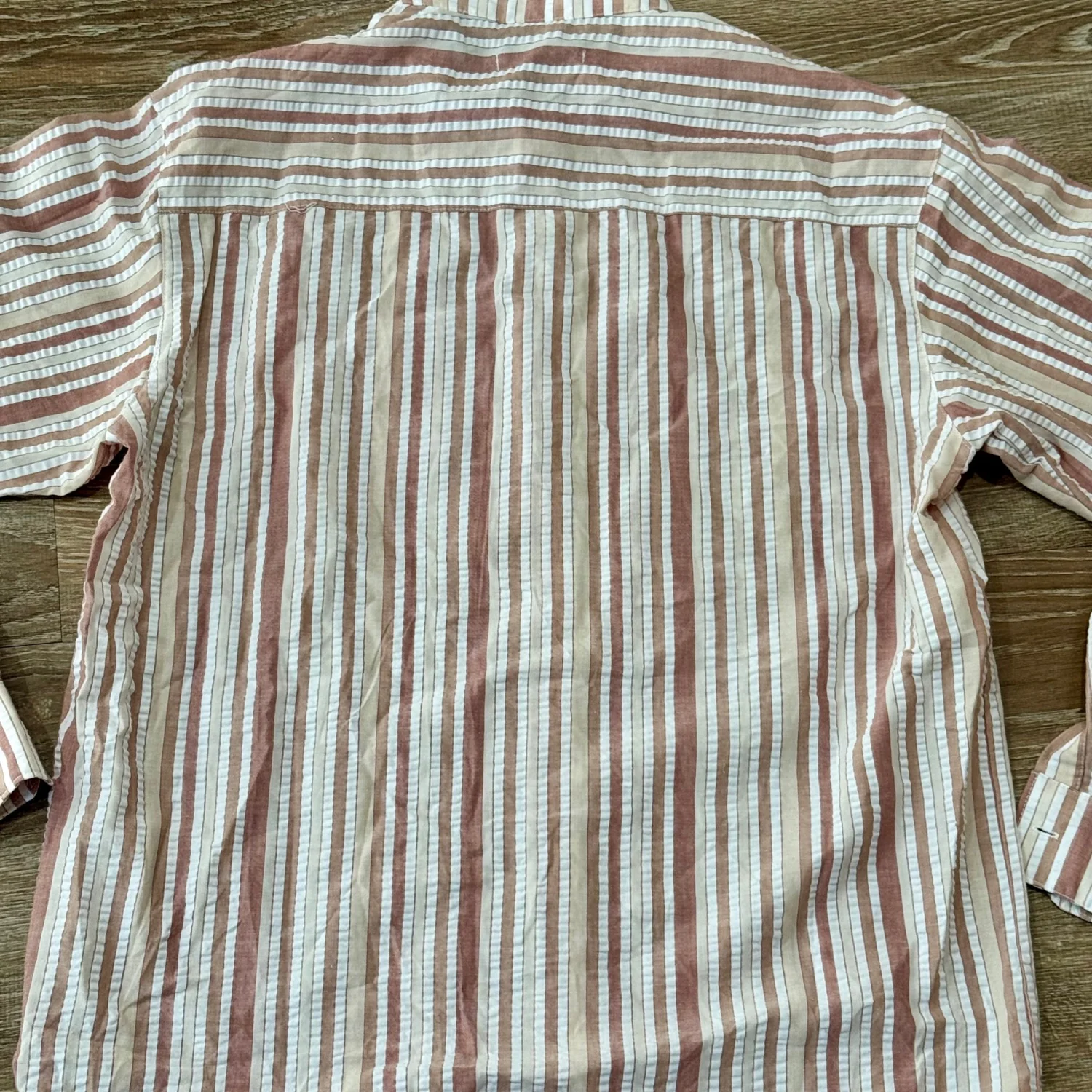 Stylish men's shirt featuring a classic open brown and white striped pattern. Perfect for both casual and formal occasions. Size: Large Material: 65% Polyester 35% cotton Underarm pit to pit flat approx: 23” Length: approx 30” Machine wash cold with like colors, non chlorine bleach when needed. Made in China MSRP: $49