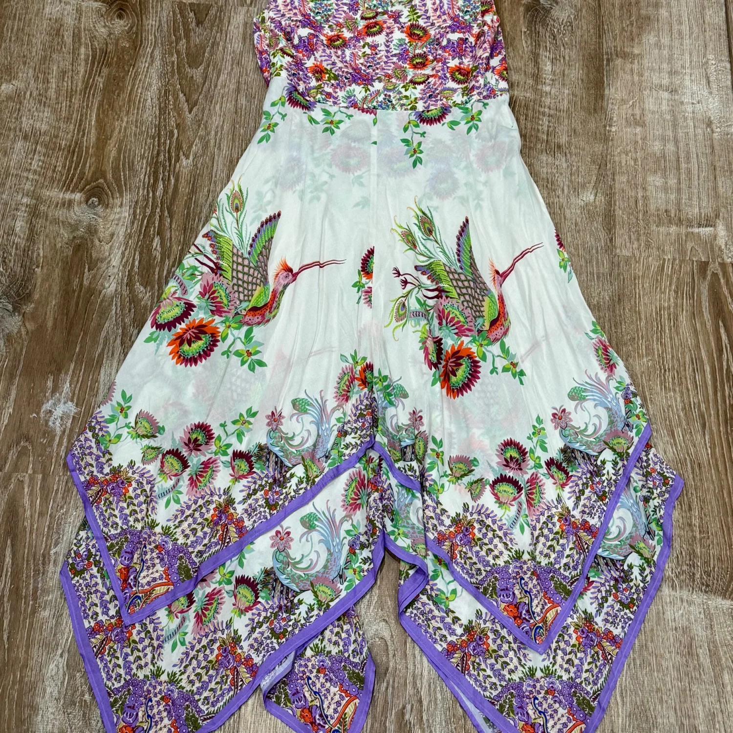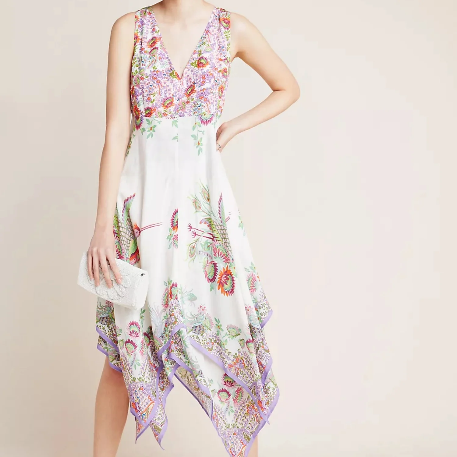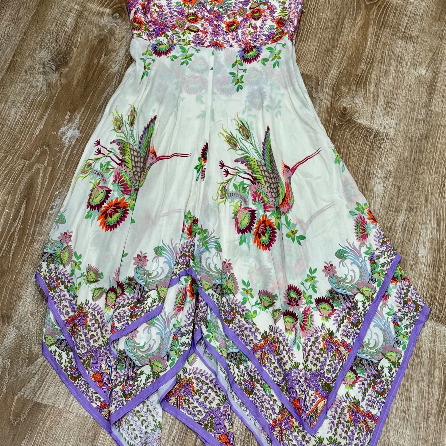 Pre-owned great condition Lightweight white dress with a colorful floral print and a handkerchief hem. V-neck and sleeveless design for a breezy, feminine look. Features pink and lavender accents that brighten the silhouette. Perfect for daytime events and warm-weather outings. Size: US 2 / UK 6 / EU 34 Zip side closure Floral Print V neck Bird Handkerchief Hem Ivory Purple Underarm pit to pit flat: 16” Machine wash cold with like colors Material: 100% Viscose Made in Turkey MSRP: $170