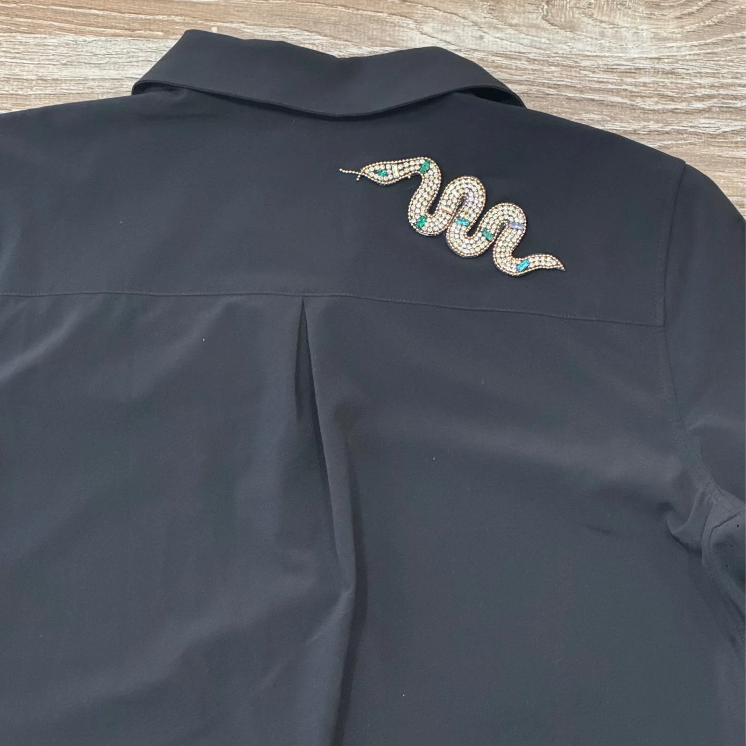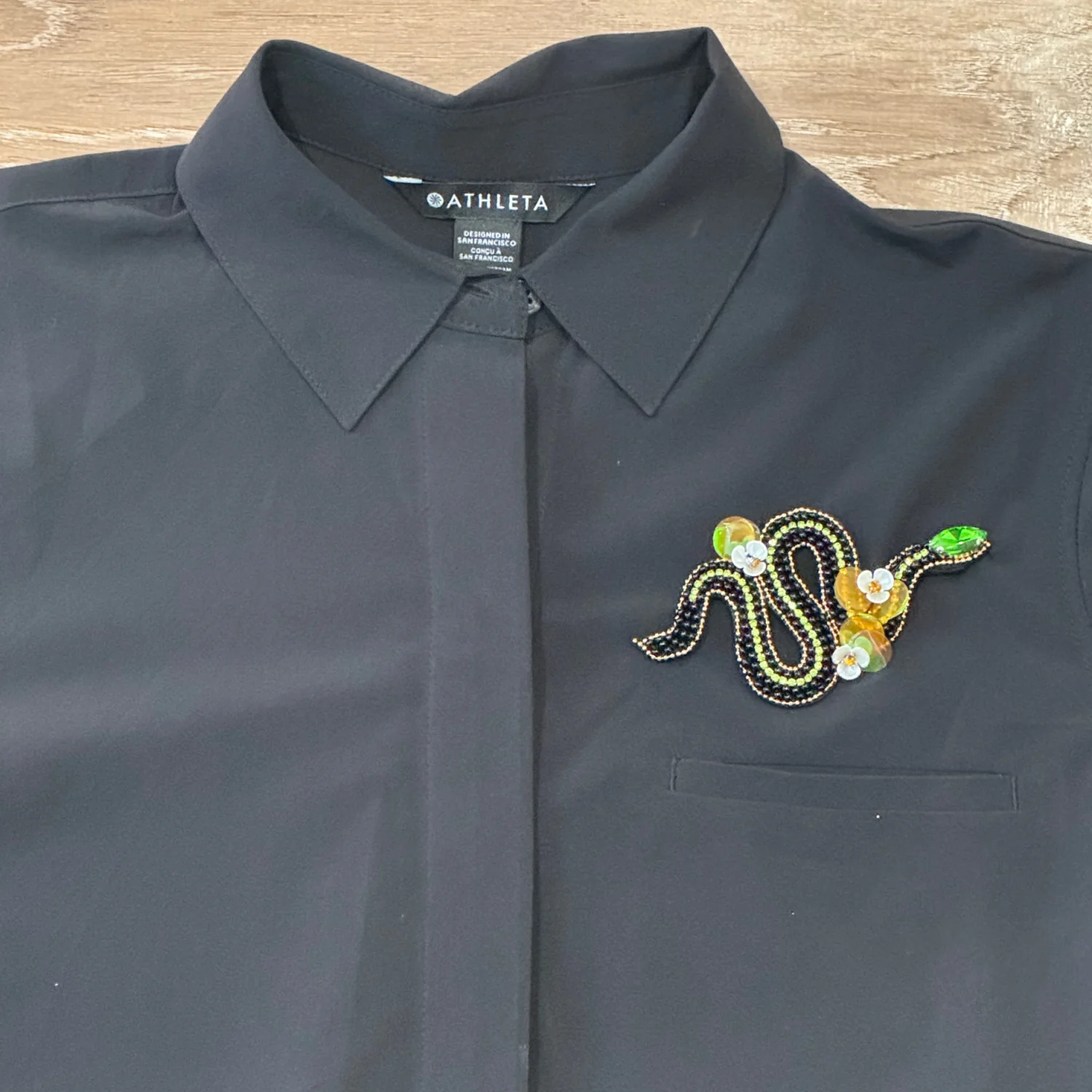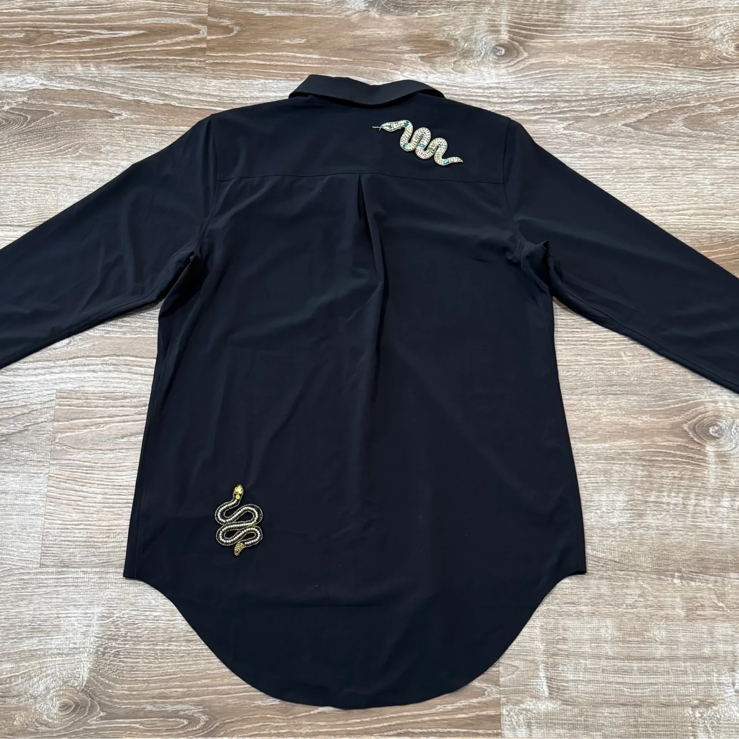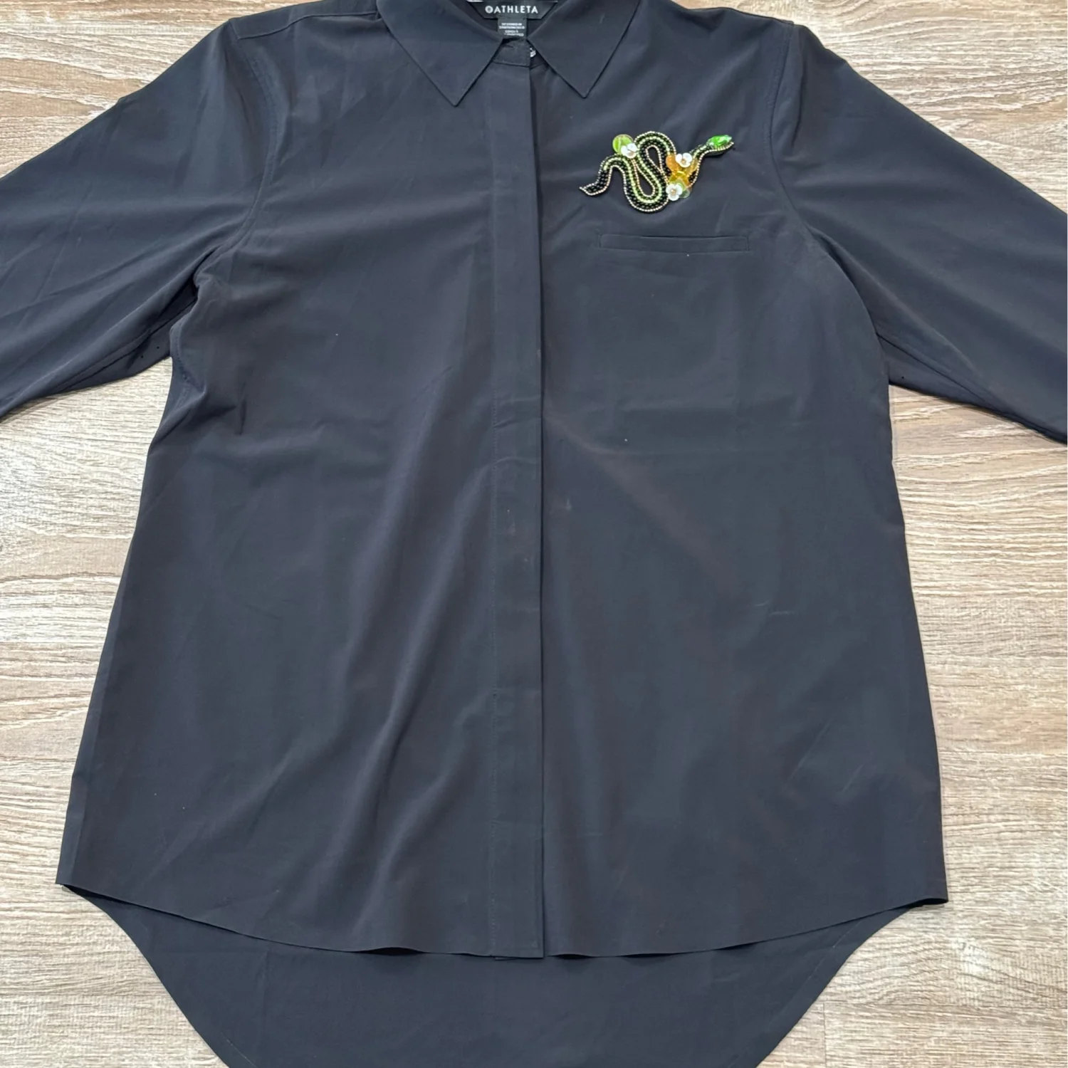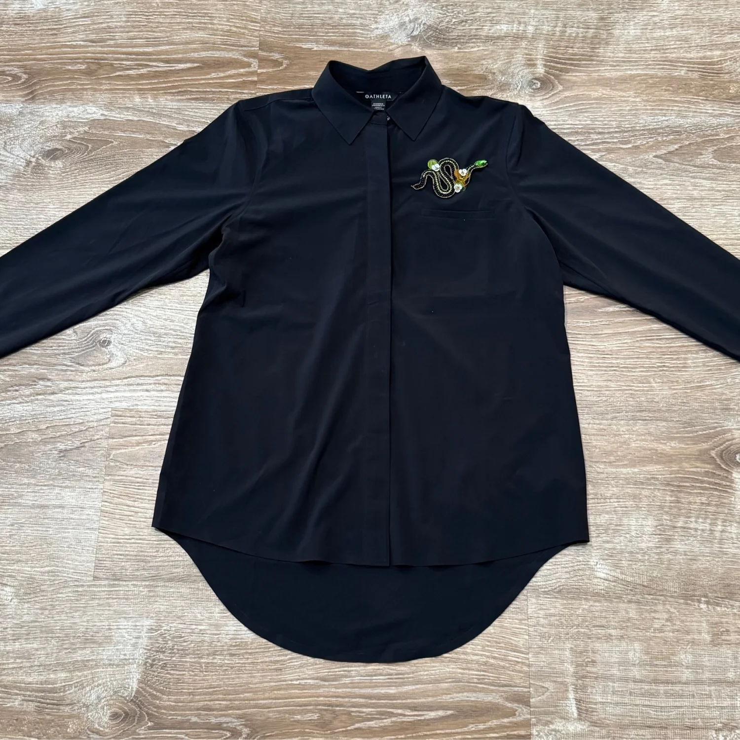 Used great condition Athleta Urbanite 2.0 Stylish black long sleeve shirt featuring elegant snake embroidery on the chest & back . Size: Small Underarm pit to pit flat approx: 19.5” Length front: 26.5” Length back: 31” Material: 86% Polyester 14% Spandex Machine wash cold gentle cycle Designed in San Francisco Made in Vietnam
