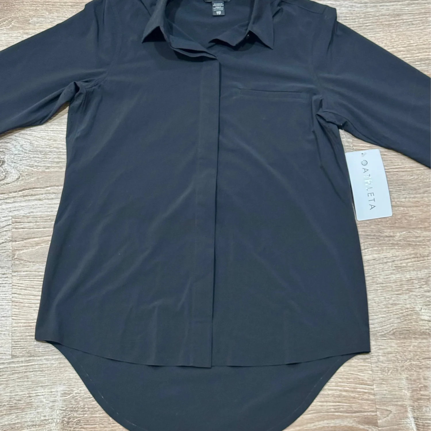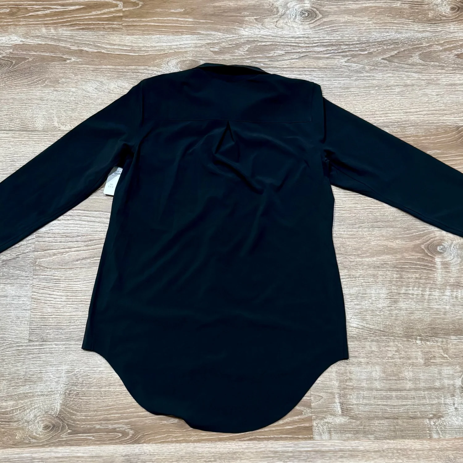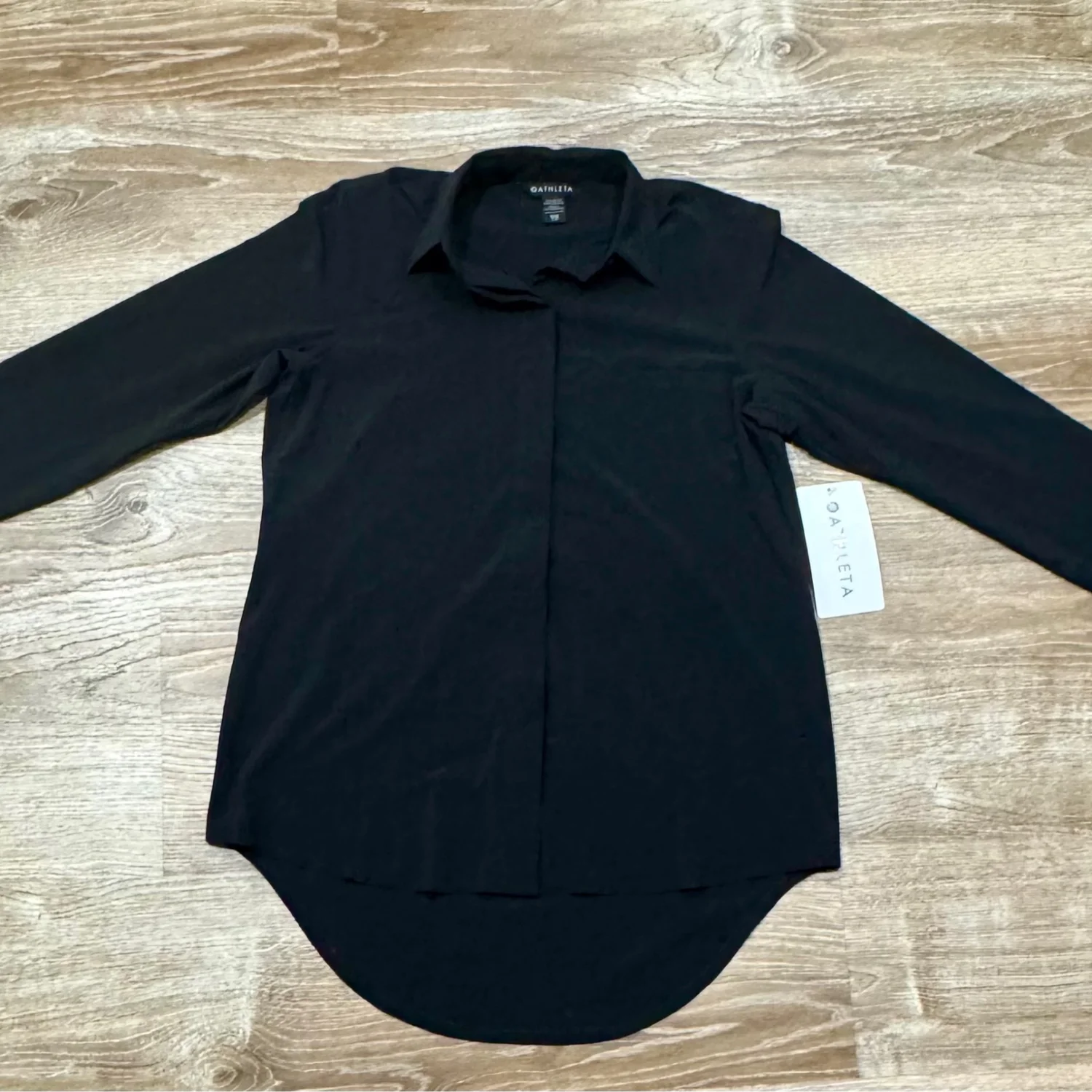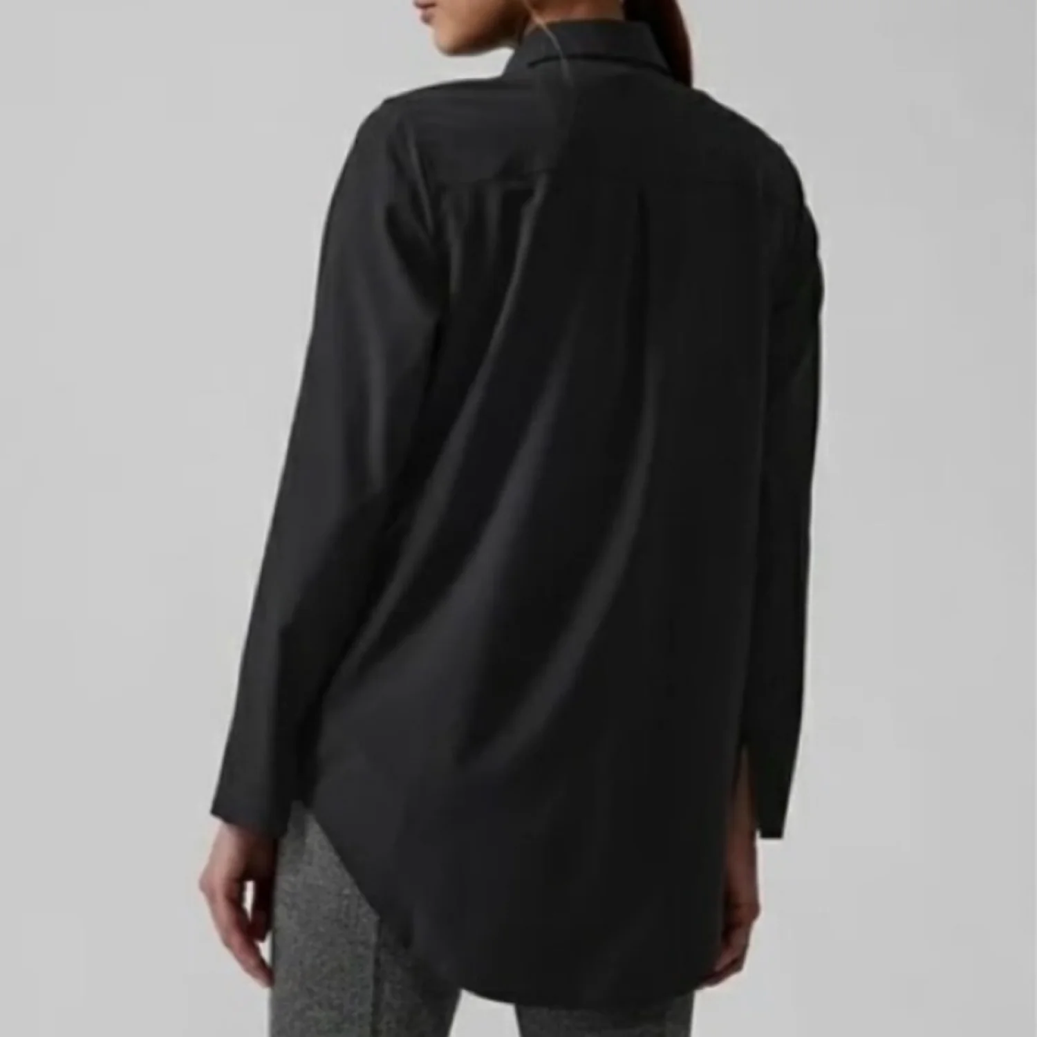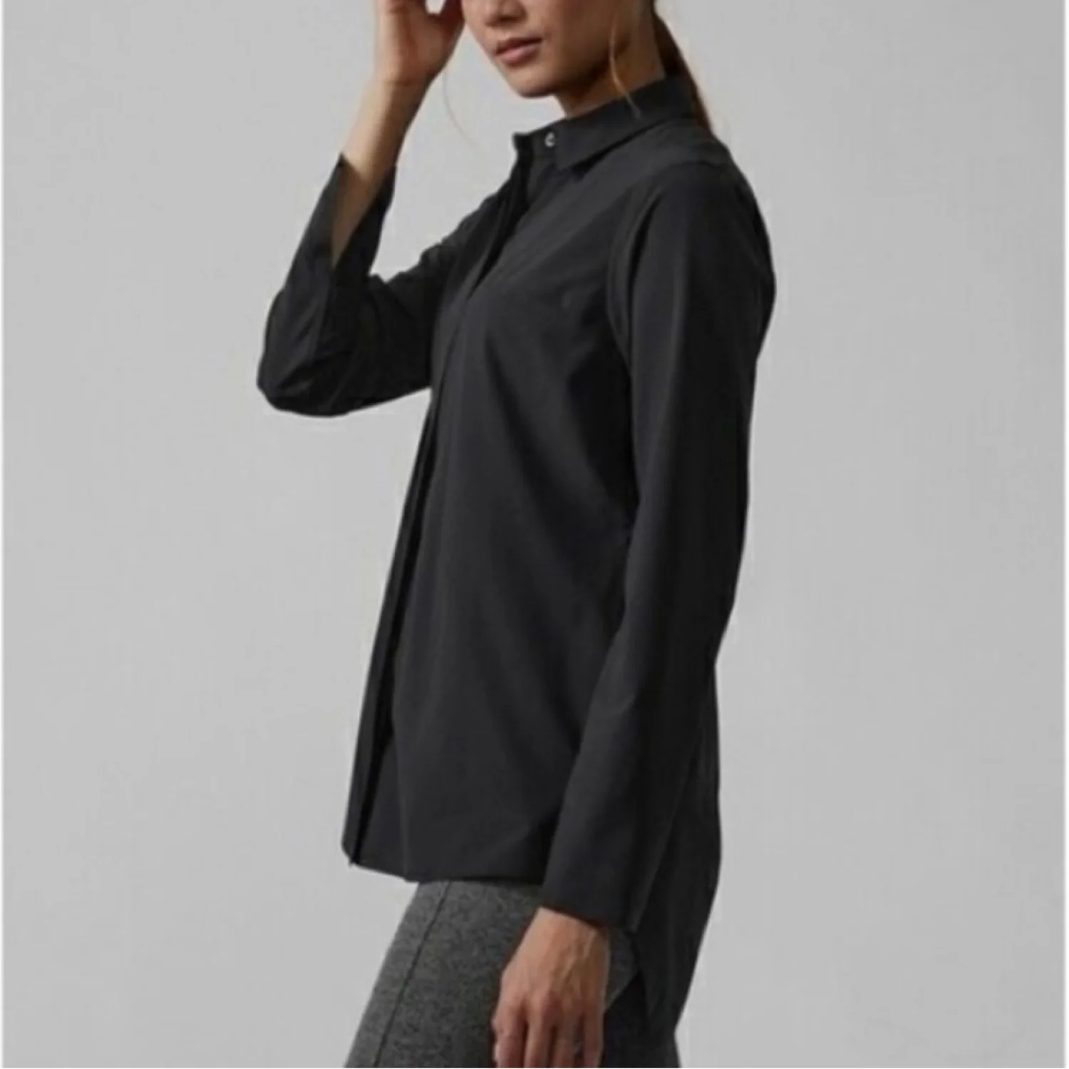 Athleta creates versatile , premium performance apparel designed by women athletes to inspire and empower a community of active confident women and girls. Stylish black button-up shirt with long sleeves. Perfect for any occasion. Size: XXS Material: 86% polyester 14% spandex Length: front approx 24.5” / back approx 29.5” Underarm pit to pit flat approx: 17” Machine wash cold gentle cycle Designed in San Francisco Made in Vietnam MSRP: $119