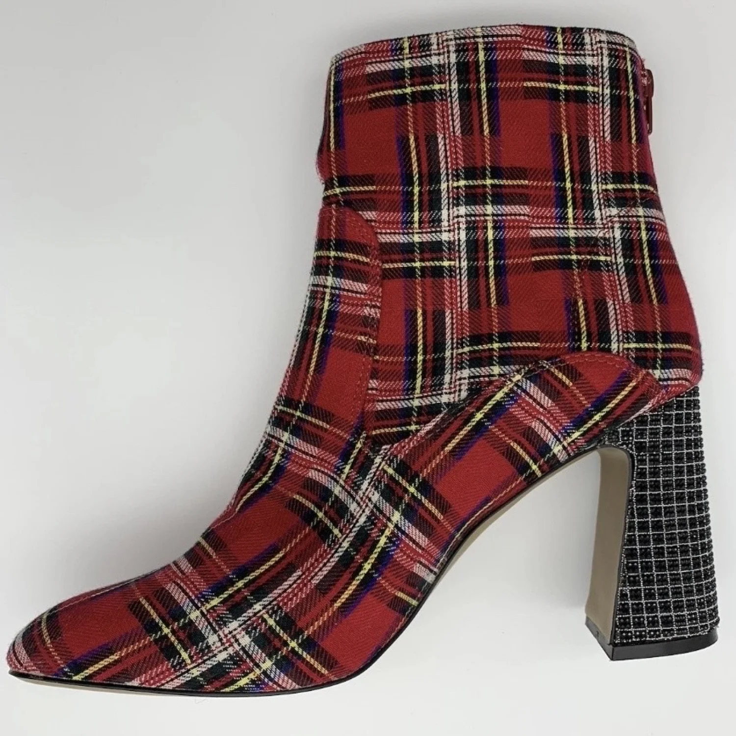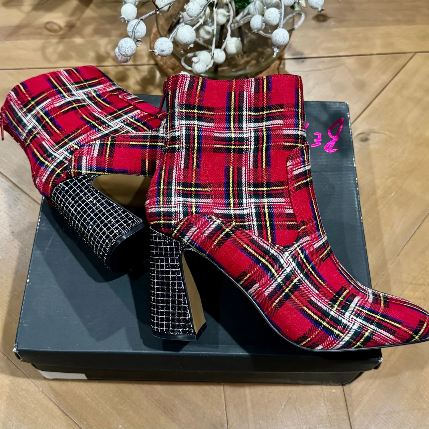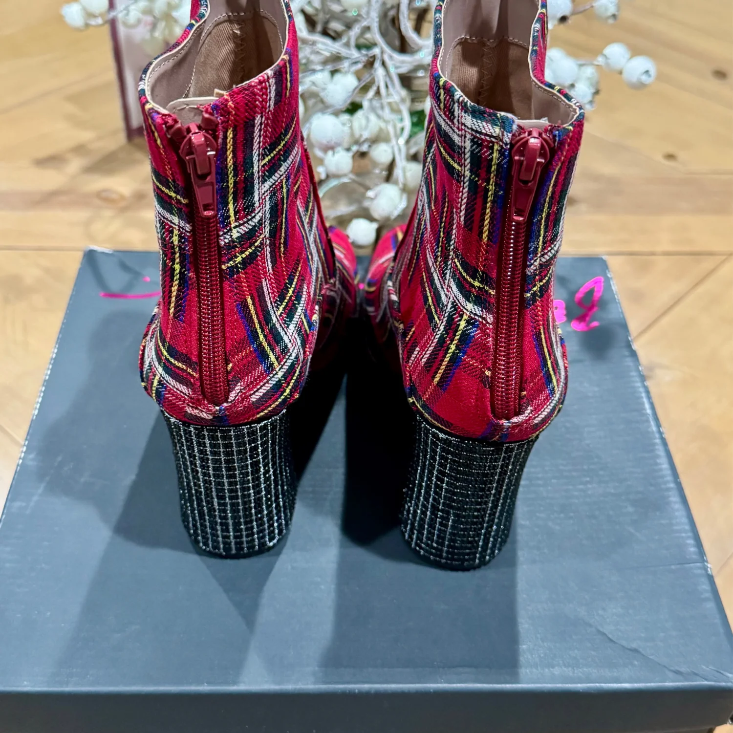 Betsey Johnson Blanche Boot Womens Red Plaid Rhinestone Block Heel Bootie